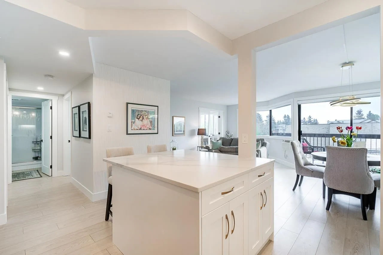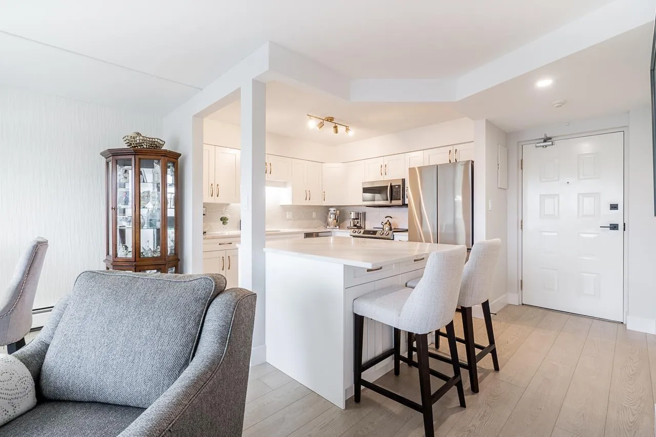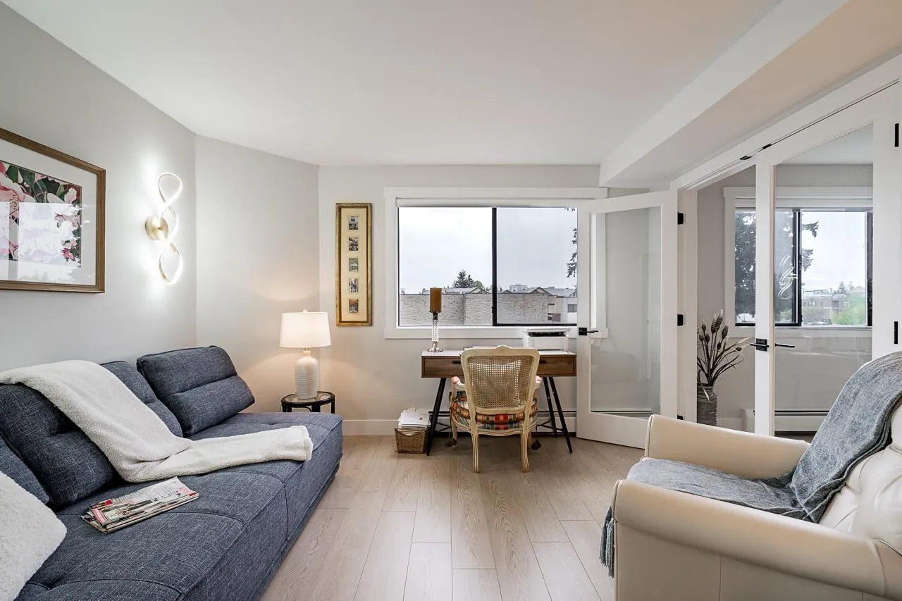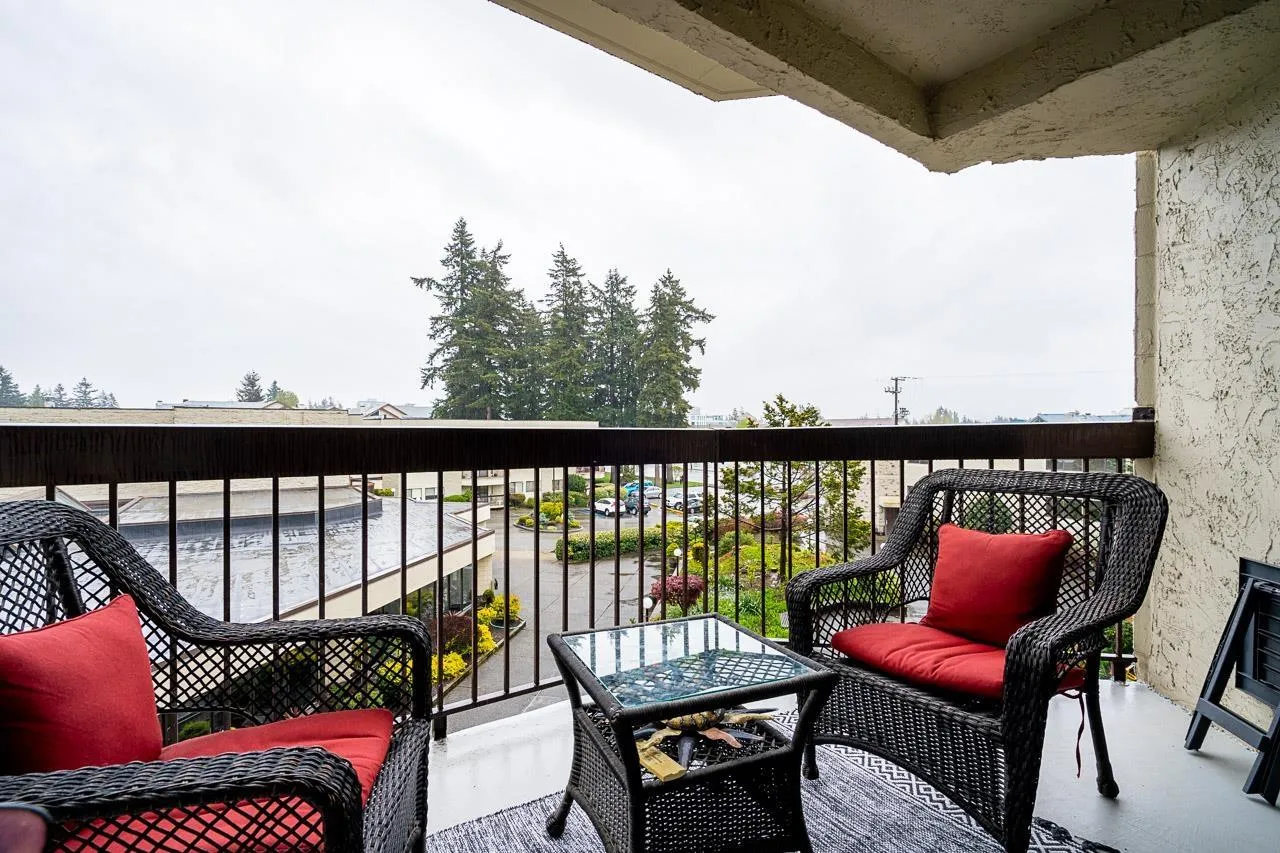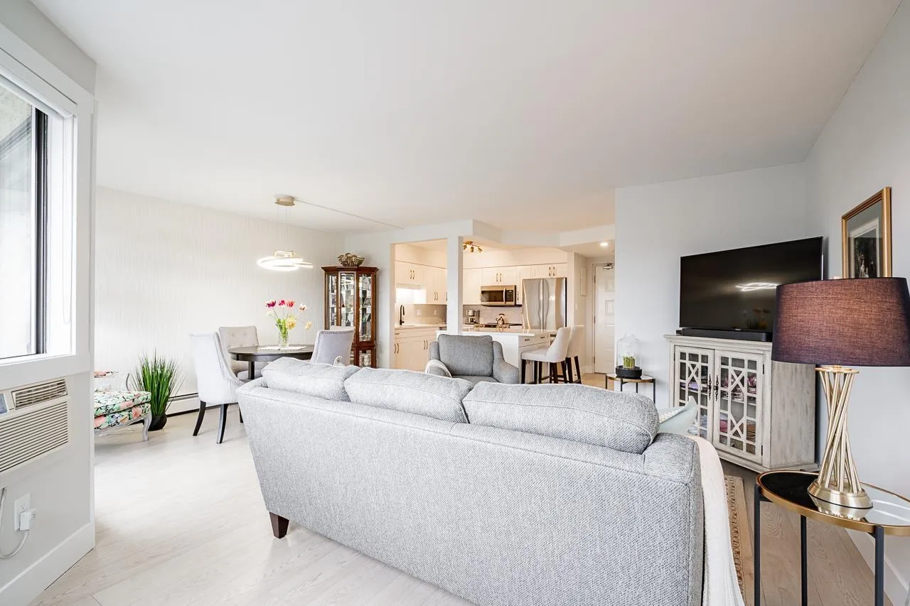 Bright and spacious fully renovated unit ready for you to enjoy! With large kitchen & island, SS appliances, quartz counters, tile backsplash, and ample cupboard space. Living room features large windows w/ custom blinds and a view of Mt. Baker from your covered deck, spacious dining area perfect for entertaining. Bedroom features walk in closet. Second bed/den with french doors leading to living rm. Unit includes modern light fixtures, all new interior doors/trim, and new flooring throughout. New Bathroom with walk-in shower & waterproof flooring. New In suite Washer/dryer. Storage locker inc. Evergreen Village also has indoor pool, hot tub, gym, guest suite, games rm, workshop, & RV parking. Centrally located near shops, restaurants, parks, and transportation. Heat inc in strata fee. (id:27476)