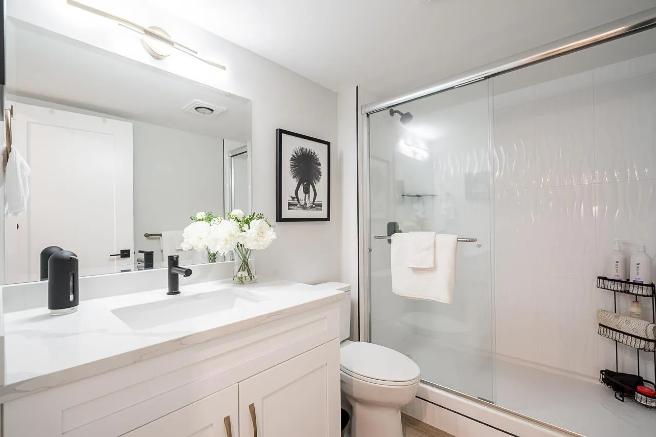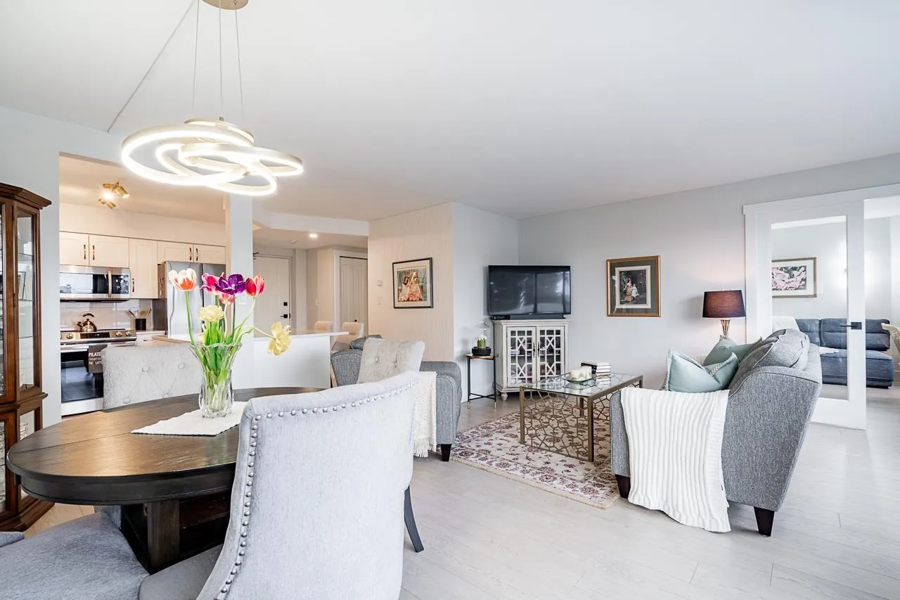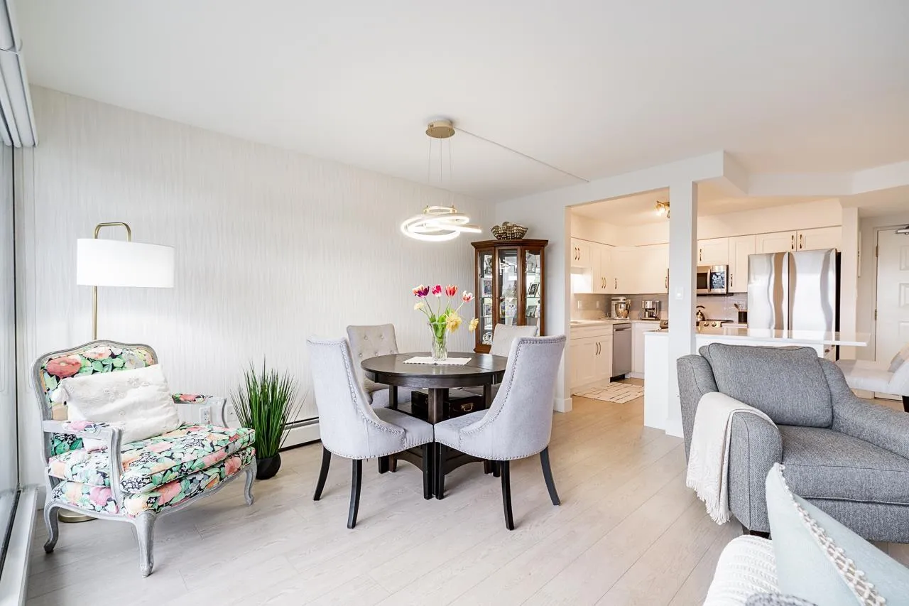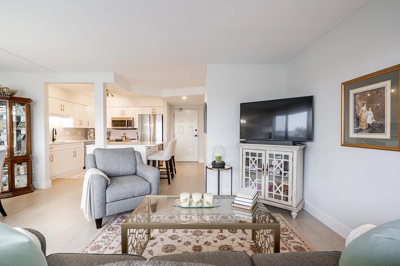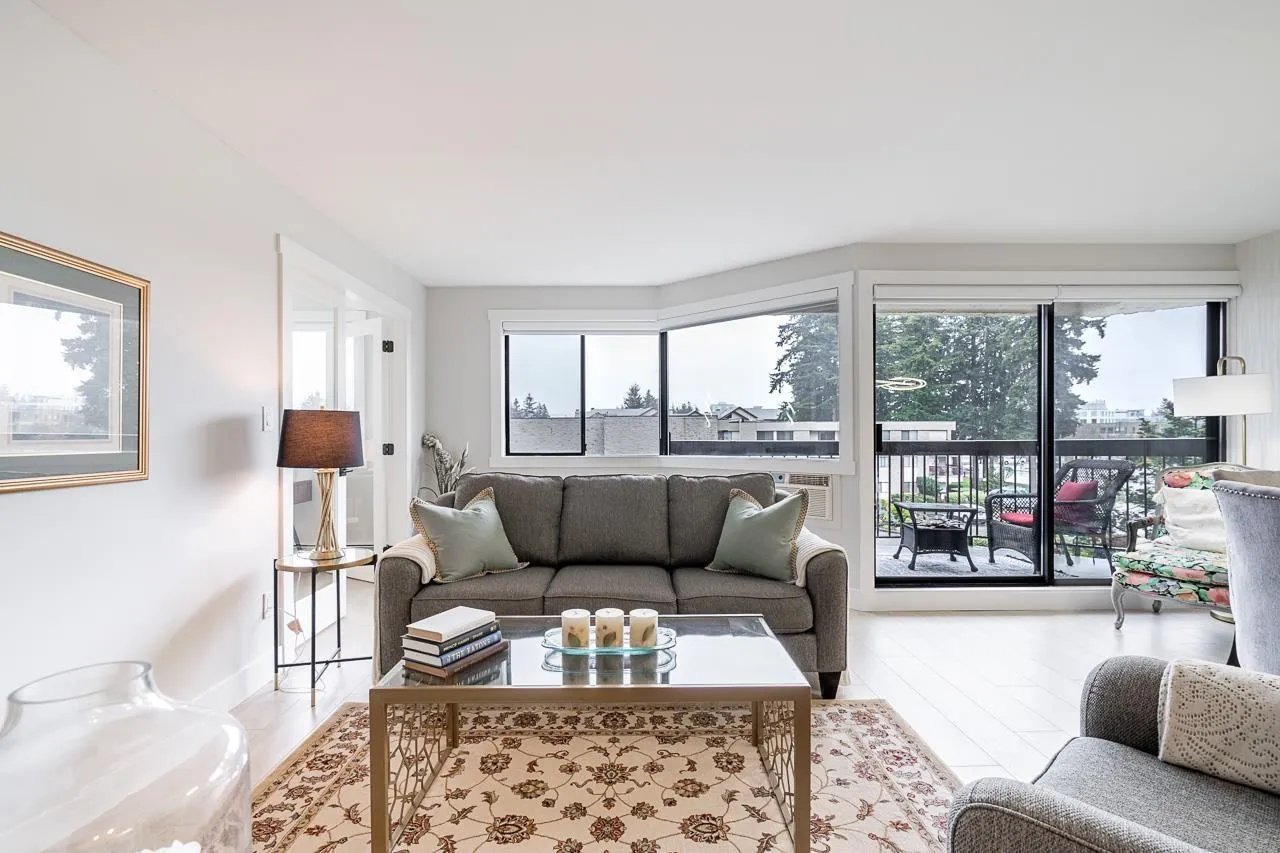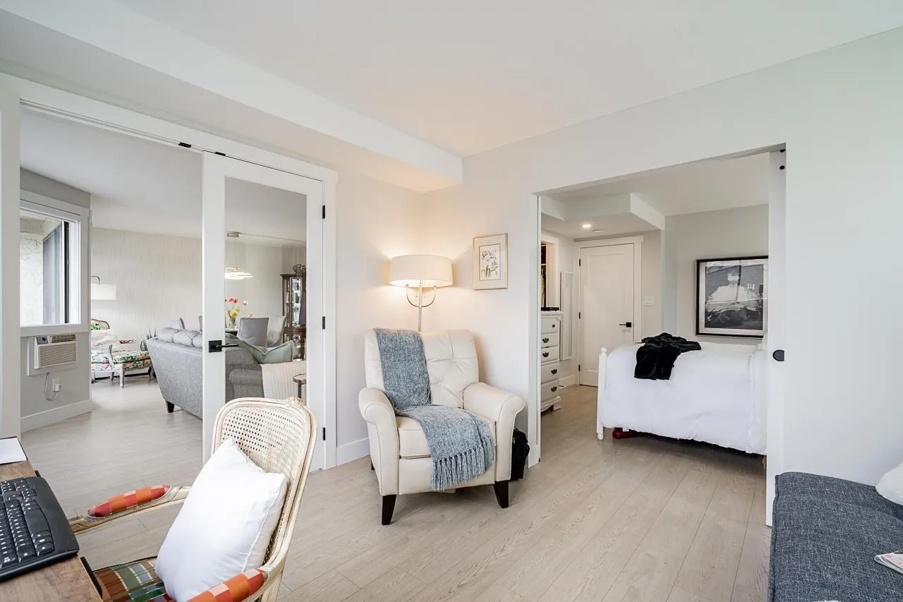 Bright and spacious fully renovated unit ready for you to enjoy! With large kitchen & island, SS appliances, quartz counters, tile backsplash, and ample cupboard space. Living room features large windows w/ custom blinds and a view of Mt. Baker from your covered deck, spacious dining area perfect for entertaining. Bedroom features walk in closet. Second bed/den with french doors leading to living rm. Unit includes modern light fixtures, all new interior doors/trim, and new flooring throughout. New Bathroom with walk-in shower & waterproof flooring. New In suite Washer/dryer. Storage locker inc. Evergreen Village also has indoor pool, hot tub, gym, guest suite, games rm, workshop, & RV parking. Centrally located near shops, restaurants, parks, and transportation. Heat inc in strata fee. (id:27476)