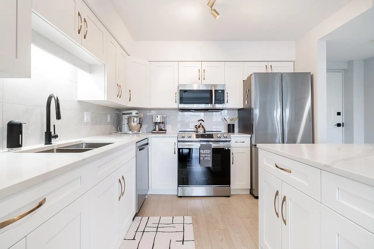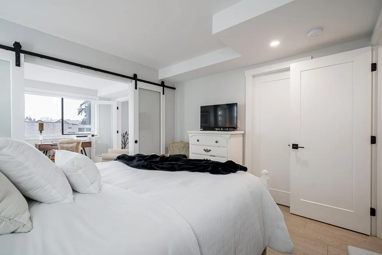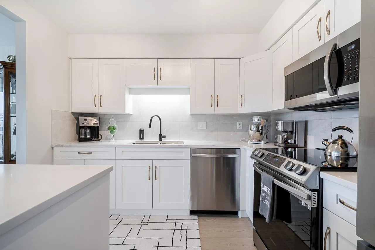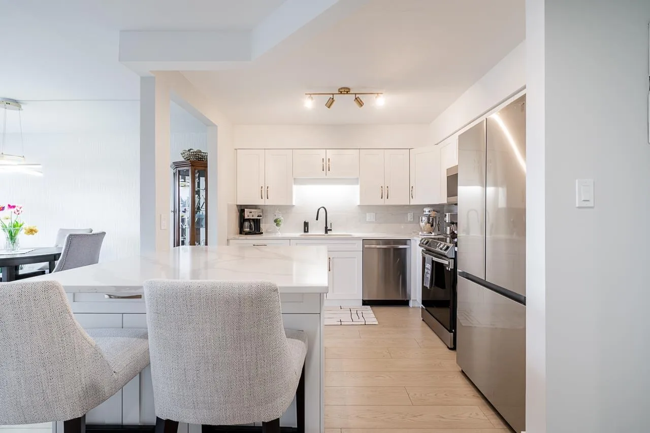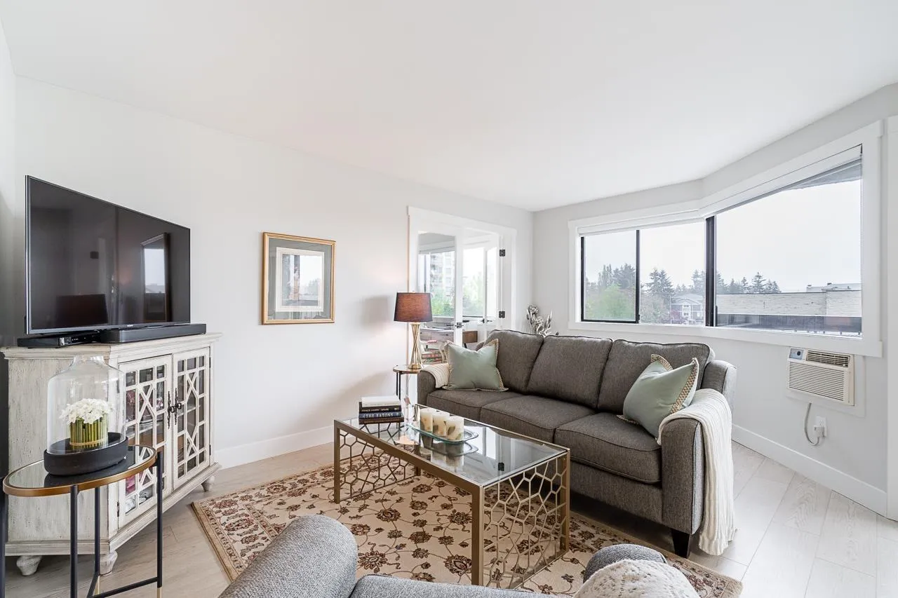 Bright and spacious fully renovated unit ready for you to enjoy! With large kitchen & island, SS appliances, quartz counters, tile backsplash, and ample cupboard space. Living room features large windows w/ custom blinds and a view of Mt. Baker from your covered deck, spacious dining area perfect for entertaining. Bedroom features walk in closet. Second bed/den with french doors leading to living rm. Unit includes modern light fixtures, all new interior doors/trim, and new flooring throughout. New Bathroom with walk-in shower & waterproof flooring. New In suite Washer/dryer. Storage locker inc. Evergreen Village also has indoor pool, hot tub, gym, guest suite, games rm, workshop, & RV parking. Centrally located near shops, restaurants, parks, and transportation. Heat inc in strata fee. (id:27476)