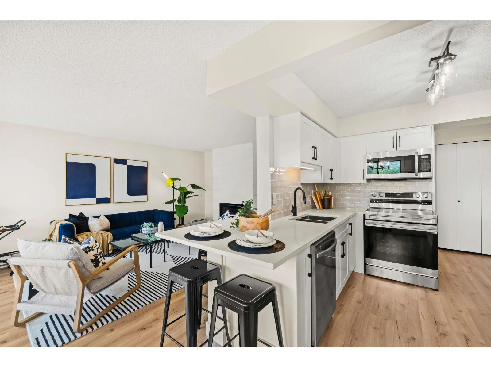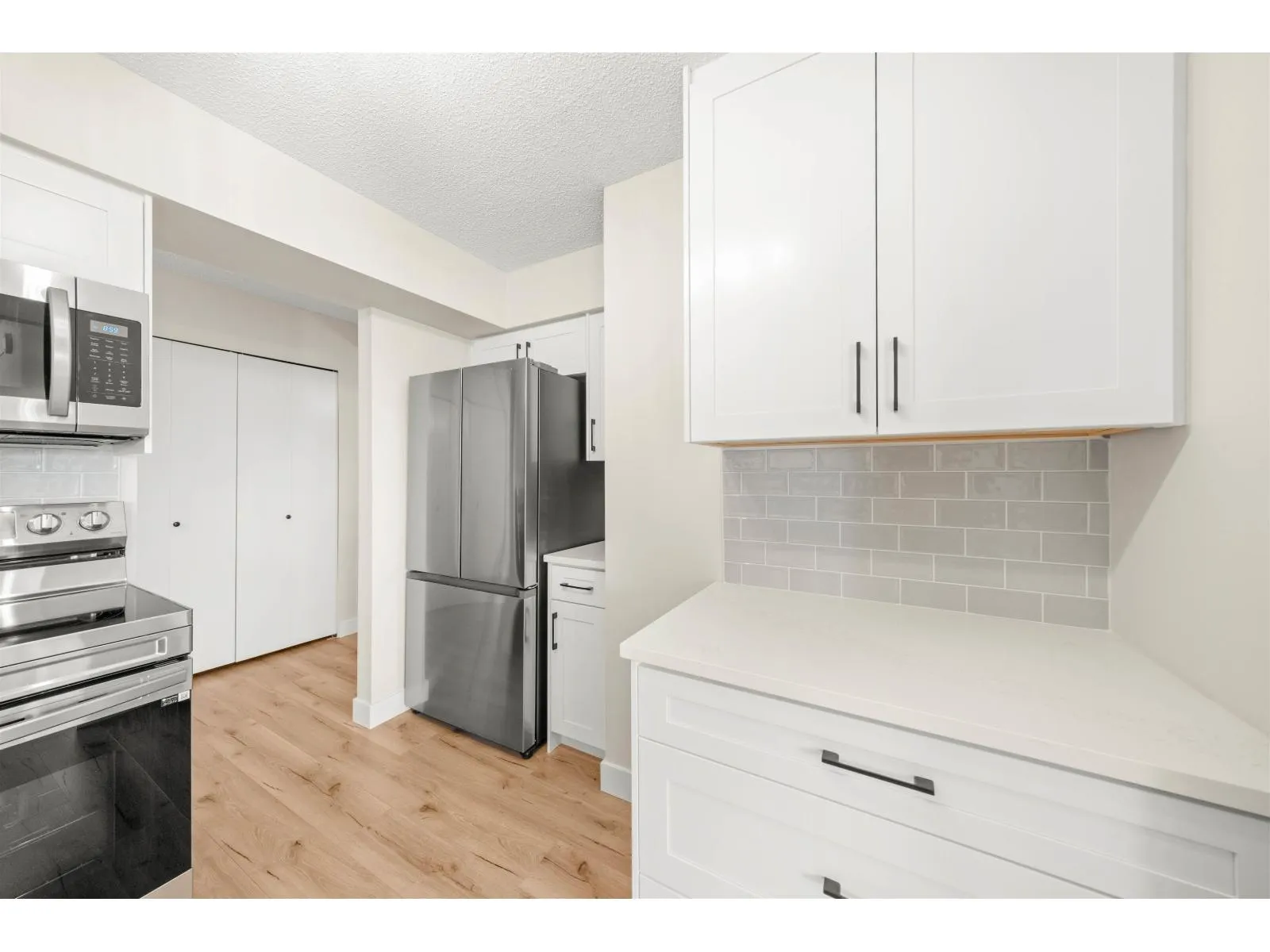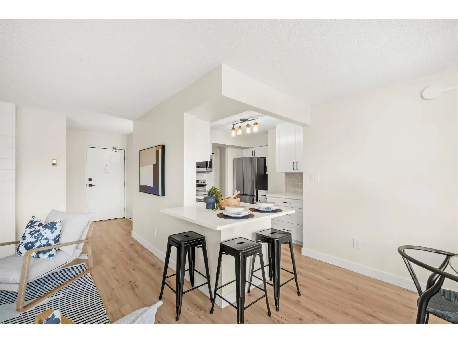 Renovation! Renovation! Renovation! This 2 bed, 2 bath unit is in Evergreen Village-one of Abbotsford's best managed 55+ communities. Concrete construction makes this home quiet and solid! Enjoy a spacious open-concept layout with a deluxe chef's kitchen, quartz counters, custom cabinetry, new stainless appliances, laminate flooring, A/C, and spa-like baths. Includes in-suite laundry and a versatile office/storage room. The building offers top-tier amenities: indoor pool, hot tub, workshop, library, hobby/recreation rooms, RV parking, guest suit and secured underground parking. Prime location with a bus stop out front and all essentials nearby. Call Today! (id:27476)