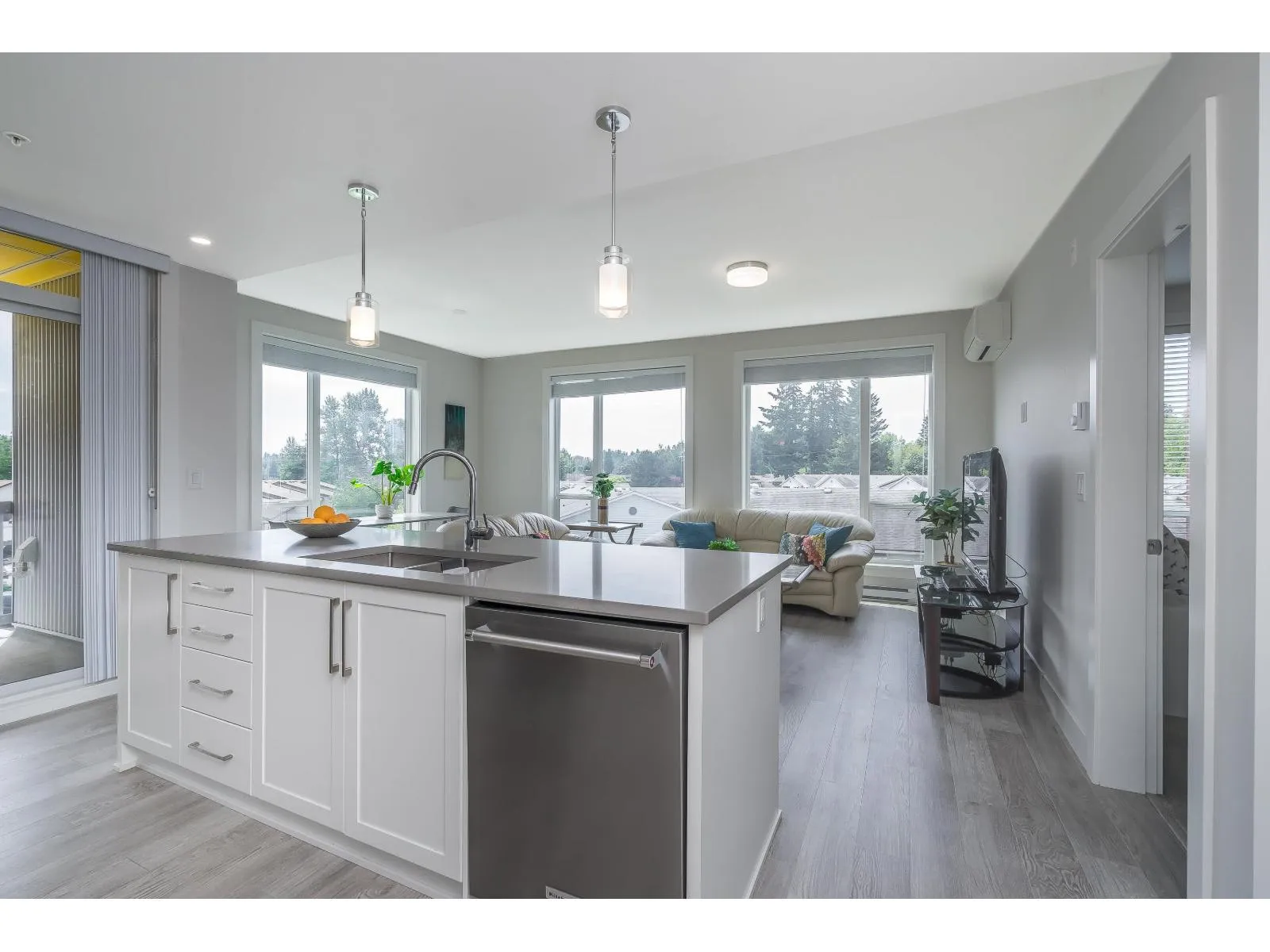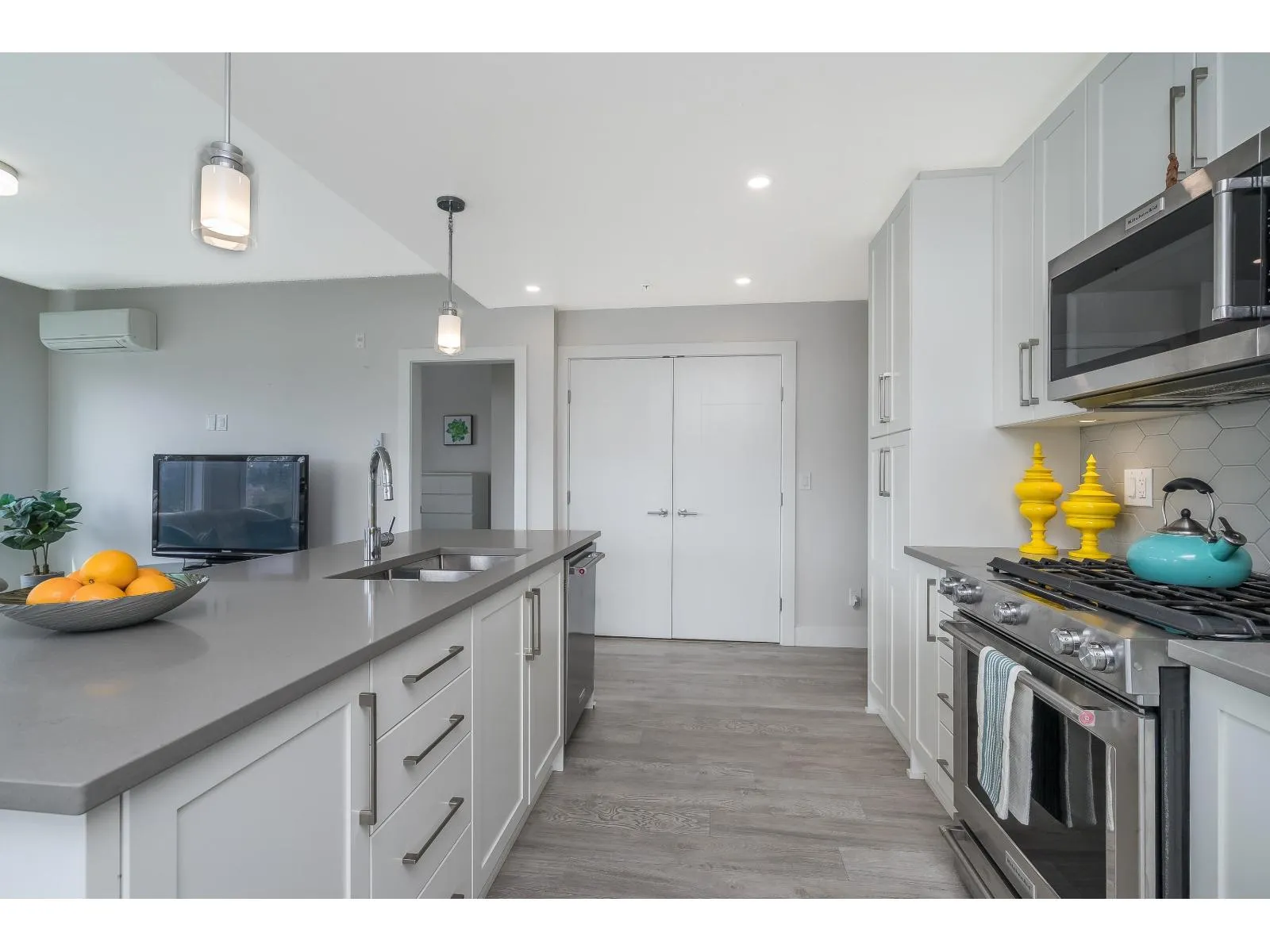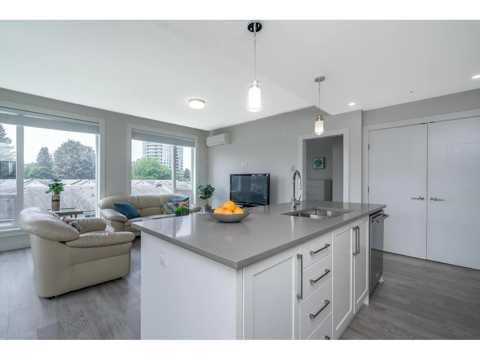 Be impressed as you walk into this 2 bed/2 bath corner unit beaming with natural light! This home offers large windows, A/C, side-by-side washer & dryer, and an efficient floor plan with functionality & comfort in mind. Kitchen & living area flow effortlessly, making this a perfect home for both living & entertaining. KitchenAid appliances, quartz countertops, island, gas oven, & abundance of cabinets. The ensuite includes a walk-in closet & double vanities. Truly a special condo that sits in a great walkable area, close to schools, shops, restaurants, parks & recreation. Stay fit and healthy with a daily walk around Mill Lake! 2 underground parking 1 storage. 2 pets allowed. (id:27476)
