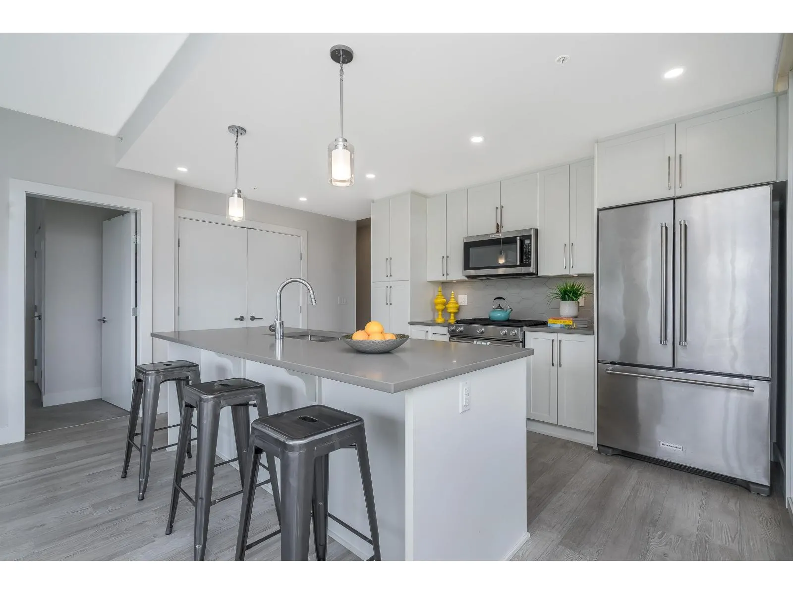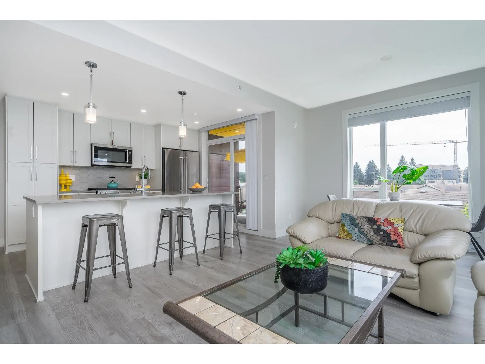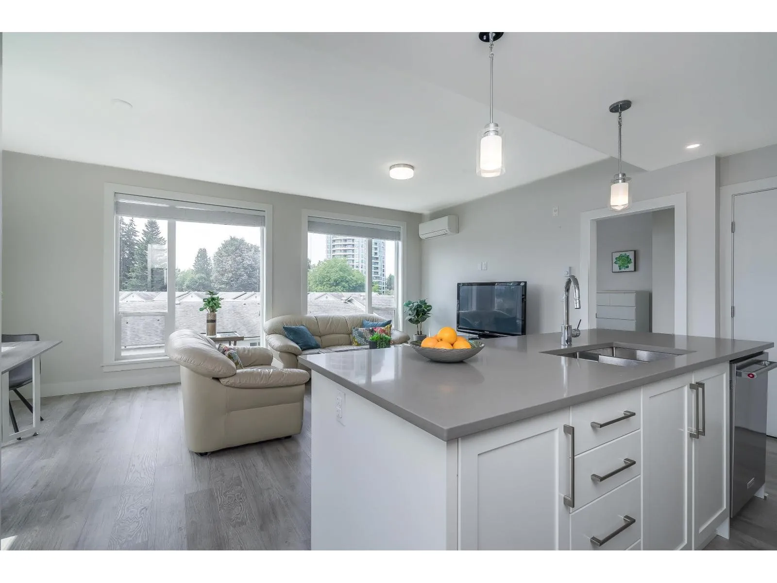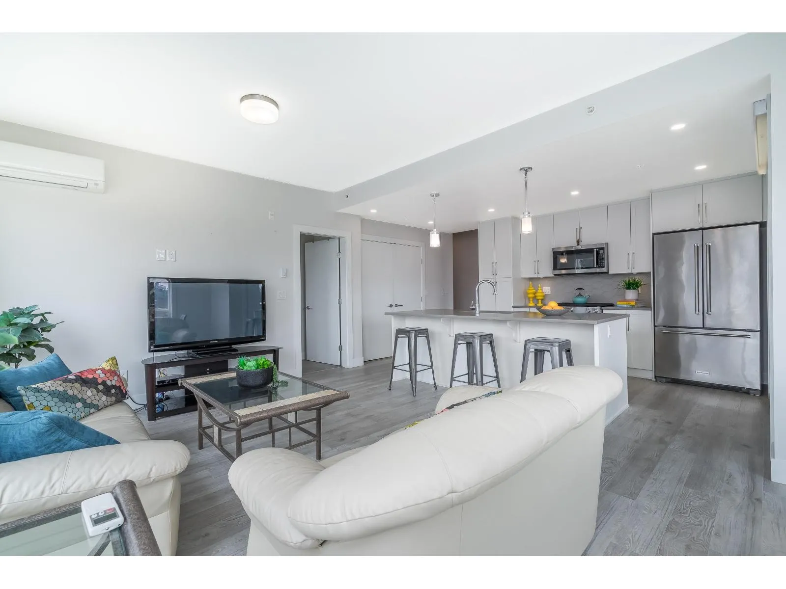 Be impressed as you walk into this 2 bed/2 bath corner unit beaming with natural light! This home offers large windows, A/C, side-by-side washer & dryer, and an efficient floor plan with functionality & comfort in mind. Kitchen & living area flow effortlessly, making this a perfect home for both living & entertaining. KitchenAid appliances, quartz countertops, island, gas oven, & abundance of cabinets. The ensuite includes a walk-in closet & double vanities. Truly a special condo that sits in a great walkable area, close to schools, shops, restaurants, parks & recreation. Stay fit and healthy with a daily walk around Mill Lake! 2 underground parking 1 storage. 2 pets allowed. (id:27476)