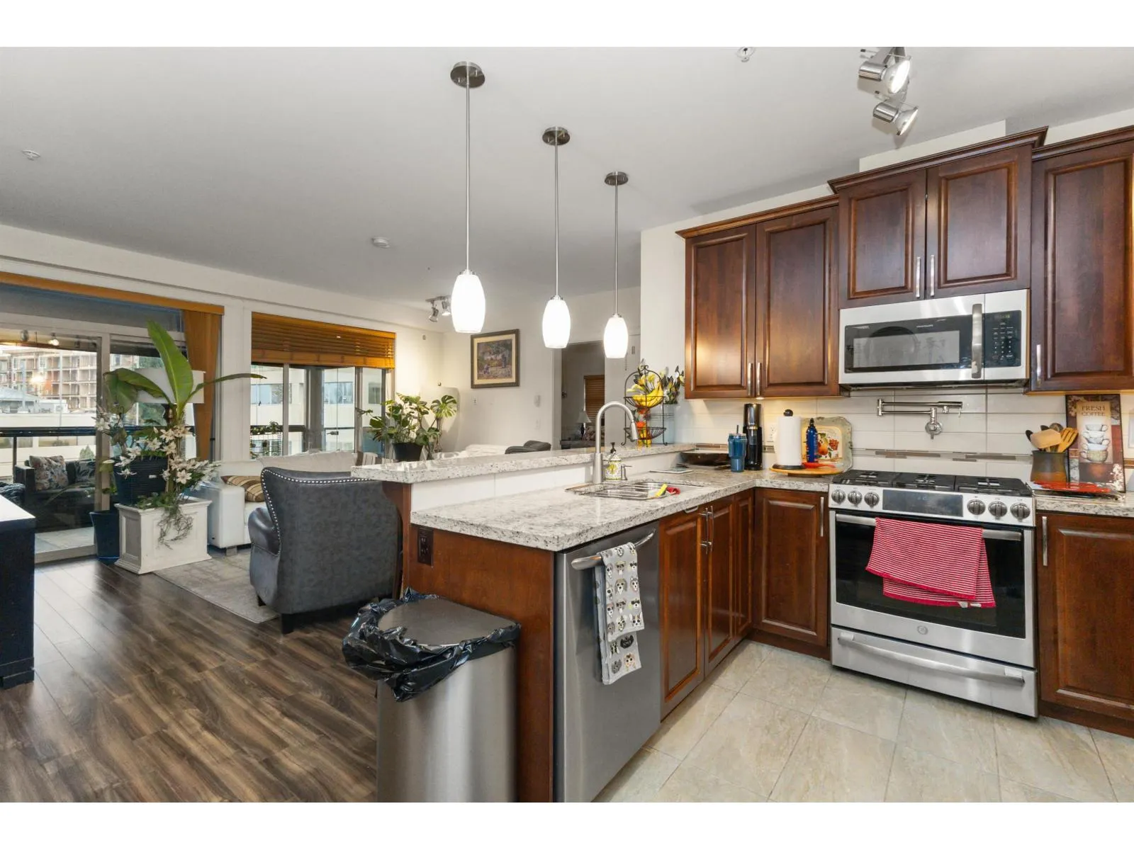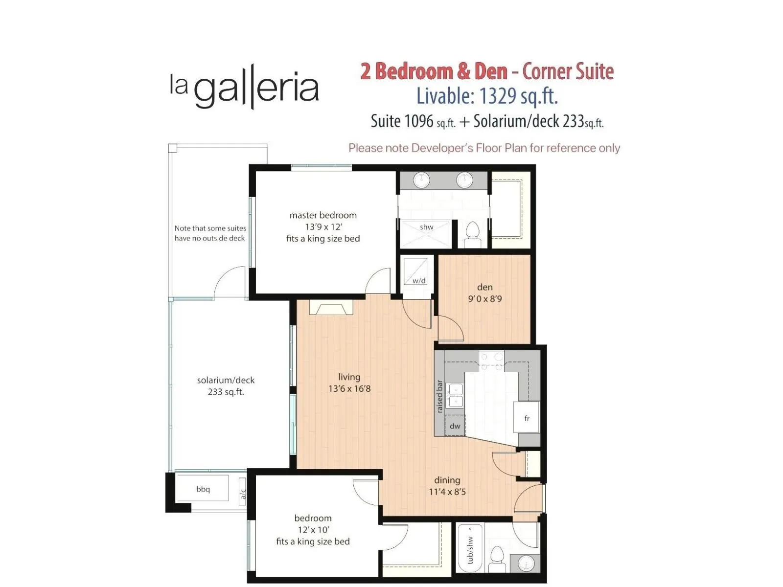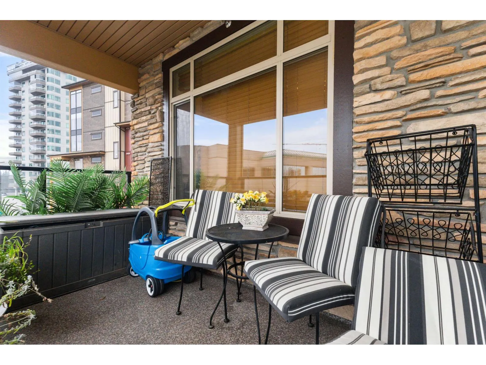 Welcome to La Galleria! This rare corner end unit offers extra privacy and features 2 bedrooms + den, 2 bathrooms, and 1329 sqft of total space (1096 sqft living + 233 sqft enclosed solarium). The solarium can open for fresh air or or when closed it provides extra living space all year and BONUS a BBQ area and sundeck. The primary bedroom boasts a double vanity and built-in safe. Gourmet kitchen with granite countertops, eating bar, and plenty of cabinetry. Enjoy air conditioning, in-suite laundry, and extra storage locker next to 2 parking stalls. Amenities include exercise room, playroom, and recreational room. Ideally located near shopping, transit, schools, library, Rotary Stadium & all amenities. Perfect blend of comfort, style, and convenience! (id:27476)