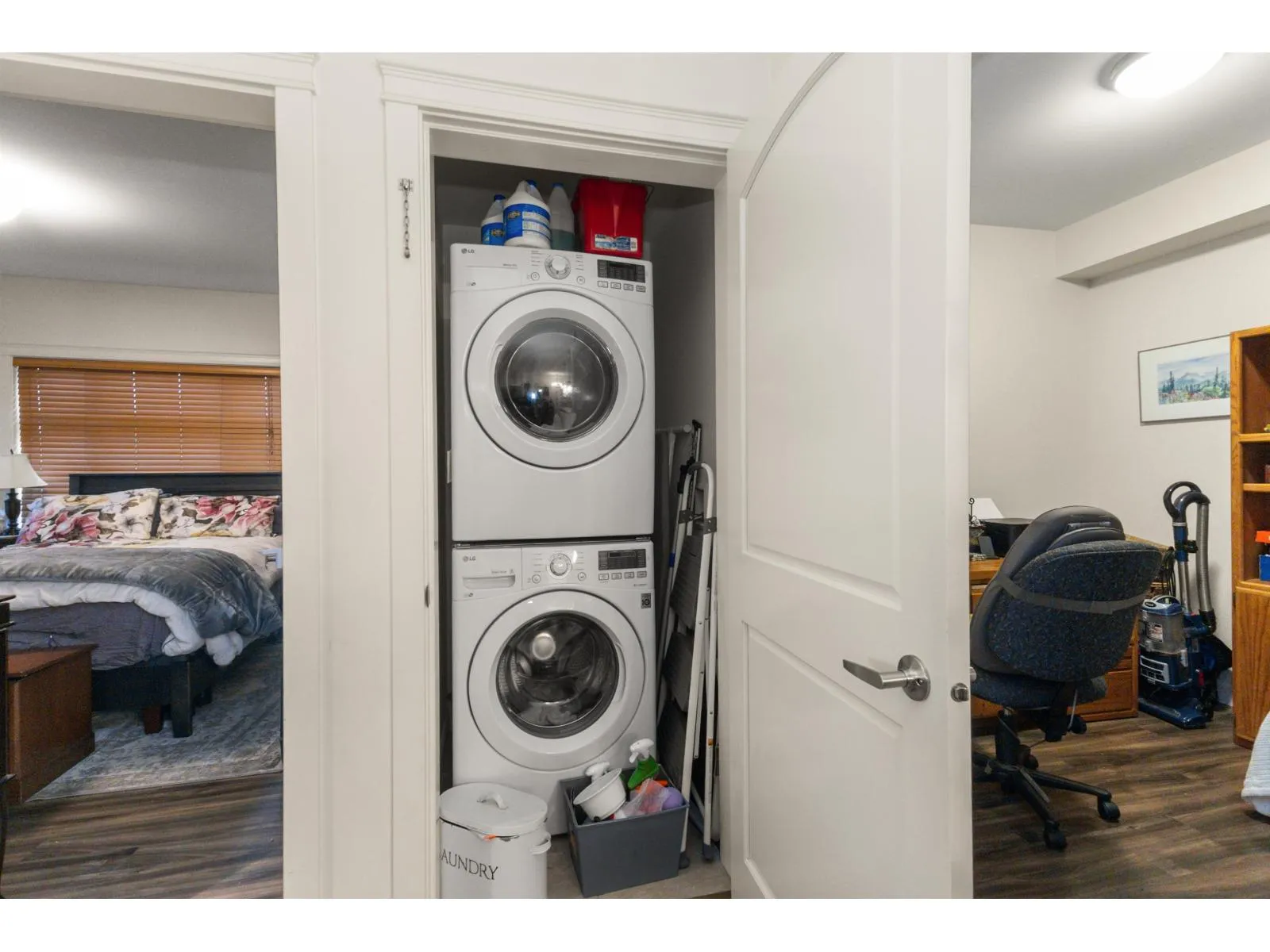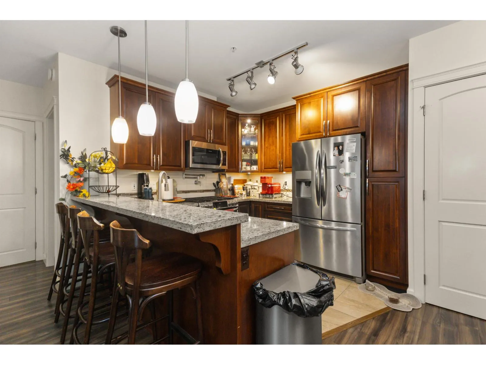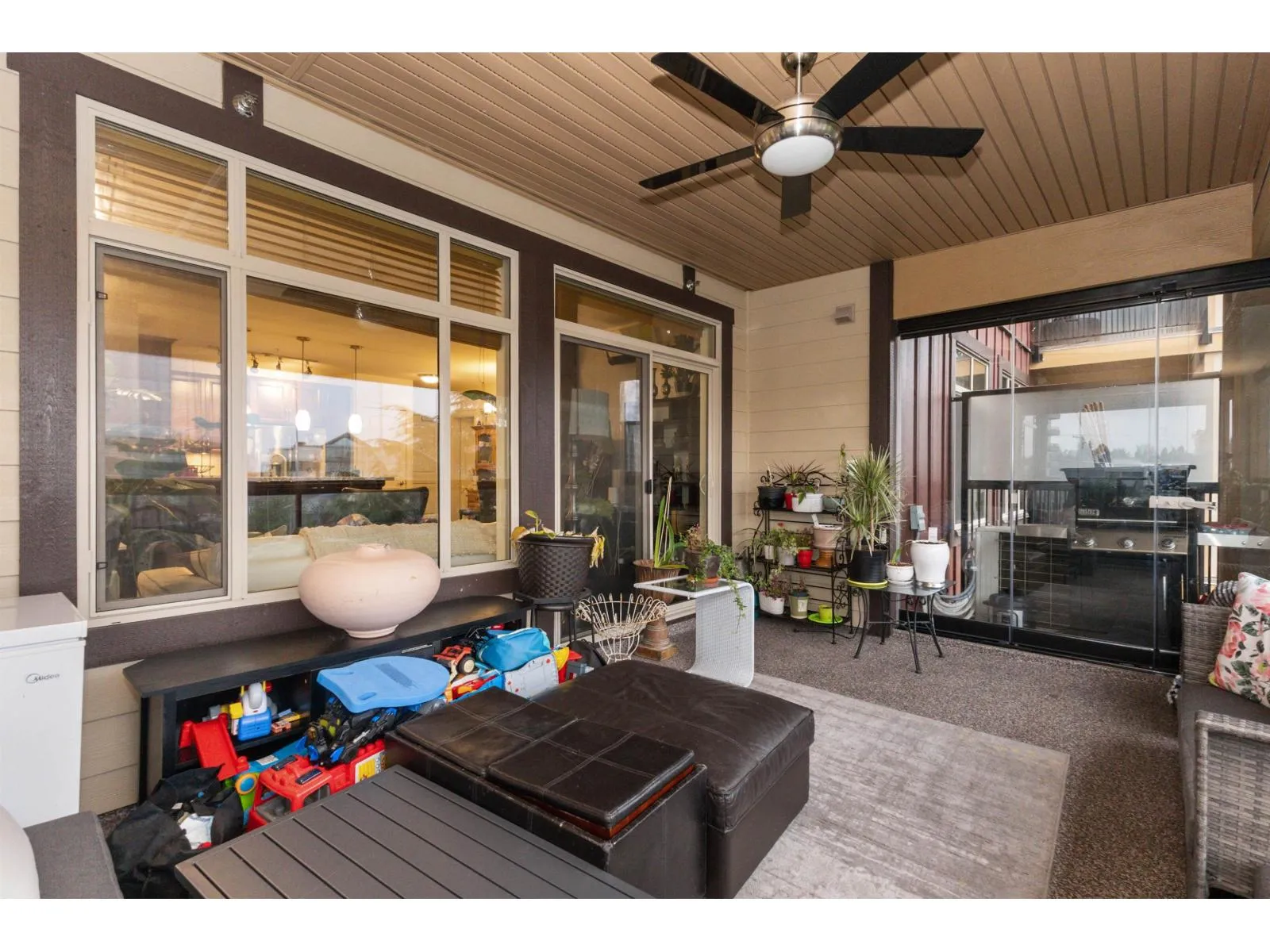 Welcome to La Galleria! This rare corner end unit offers extra privacy and features 2 bedrooms + den, 2 bathrooms, and 1329 sqft of total space (1096 sqft living + 233 sqft enclosed solarium). The solarium can open for fresh air or or when closed it provides extra living space all year and BONUS a BBQ area and sundeck. The primary bedroom boasts a double vanity and built-in safe. Gourmet kitchen with granite countertops, eating bar, and plenty of cabinetry. Enjoy air conditioning, in-suite laundry, and extra storage locker next to 2 parking stalls. Amenities include exercise room, playroom, and recreational room. Ideally located near shopping, transit, schools, library, Rotary Stadium & all amenities. Perfect blend of comfort, style, and convenience! (id:27476)