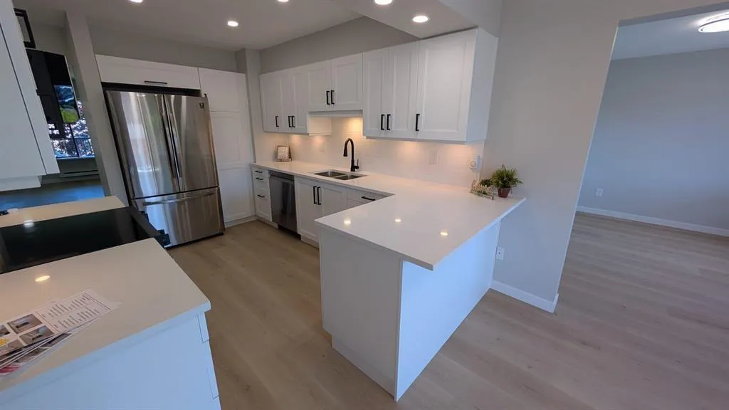 Are you looking to downsize ? Then you must come check out this totally remodeled 2 bedroom townhome. Brand new kitchen with quartz counters,pot lights through out, under counter lighting, new S/S Appliances, new walk in shower,vanity, laminate flooring, loads of storage, Built in TV and Fireplace, fantastic view, Pro active strata, 55+, Rentals allowed, All the pipes in complexe have been replaced, Walk to all amenities. Vacant and move in ready. (id:27476)
