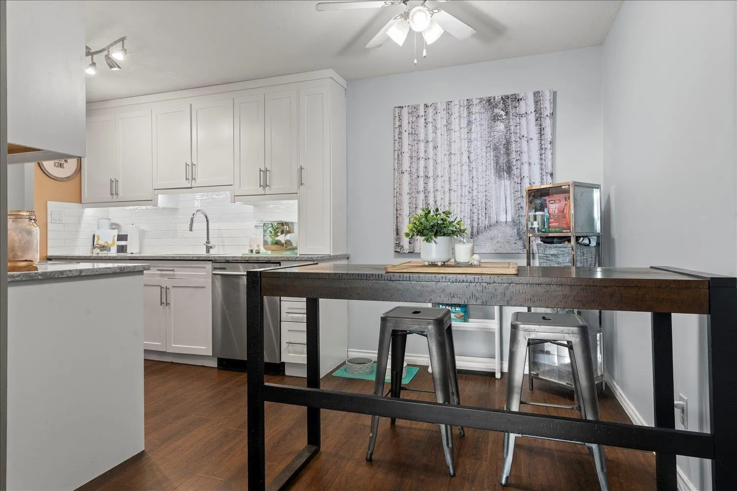 This bright and beautifully updated 2 bed, 1 bath walk-out corner unit is tucked away at the end of a quiet cul-de-sac-just steps to Clearbrook Centre and minutes to Highstreet Mall. The renovated kitchen features quartz countertops, an undermount sink, cabinet lighting, and premium Samsung & Whirlpool appliances. The spa-like bathroom boasts heated tile floors, a vessel sink, quartz counters, modern cabinetry, and a low-flow toilet. Both bedrooms offer brand new flooring and fresh paint. Enjoy cozy evenings by the gas fireplace-included in the strata fees along with covered parking and a storage locker. Located on the sunny, east-facing side of the building and walking distance to Tenbroeck Elementary and Fishtrap Creek Park. Excellent access to transit and Highway 1. (id:27476)
