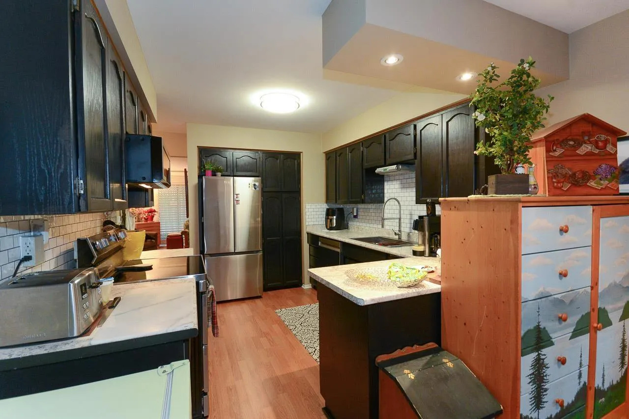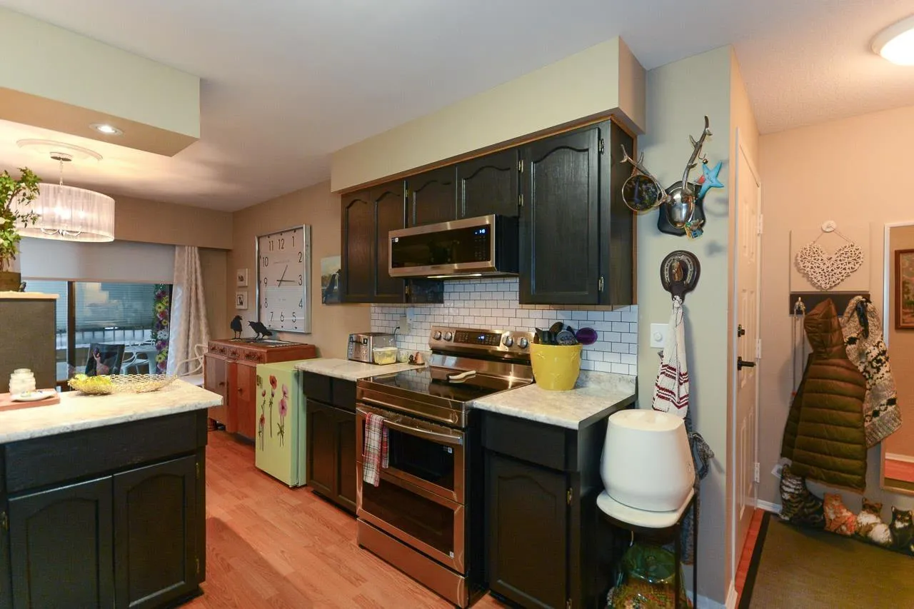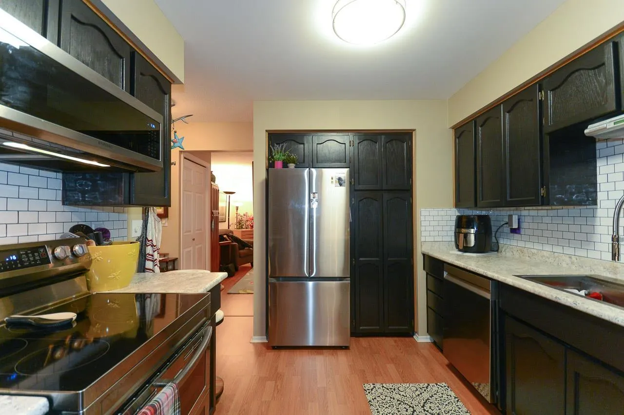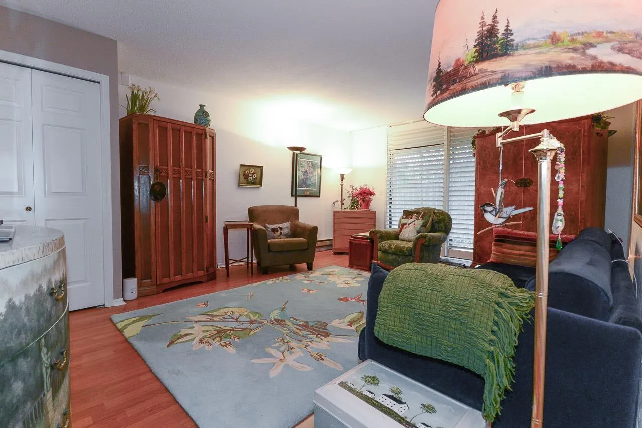 Immaculate 2-bedroom ground-floor apartment in a quiet 55+ community offering exceptional space and comfort. The home features a beautifully updated kitchen with new appliances, modern cabinetry, and a spacious, functional layout, along with in-suite washer and dryer. The cozy yet generous living room easily accommodates larger furniture. Two well-sized bedrooms and a large bathroom with a walk-in shower. Enjoy two private balconies (north and south facing) and access to a rear green space. Amenities include a community garden, pool table room, meeting/party room, and workshop. Centrally located in Abbotsford close to shopping, parks, transit, and daily essentials. Strata fee includes heat and hydro. (id:27476)