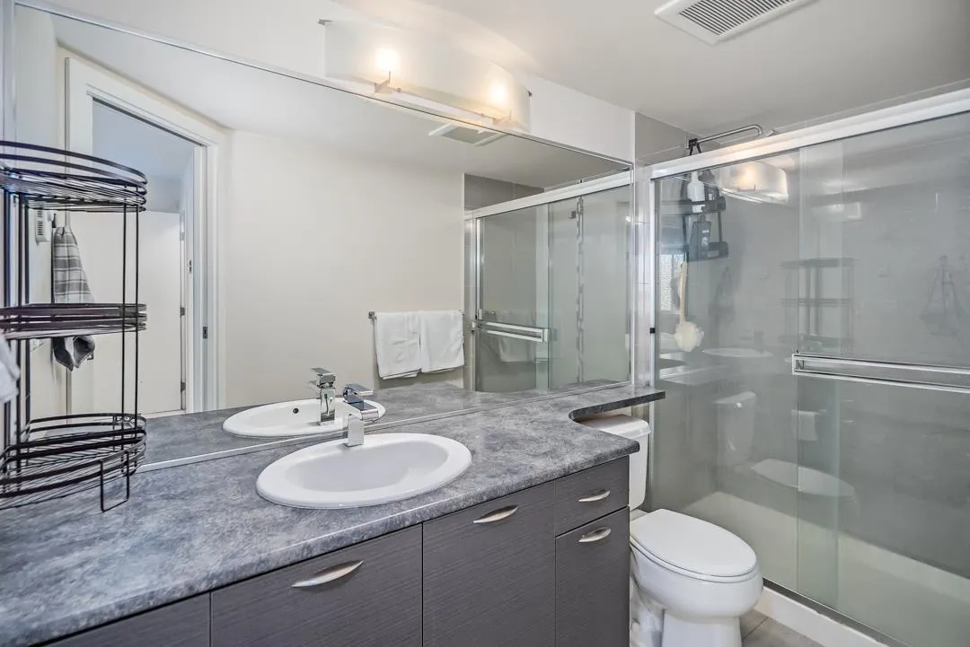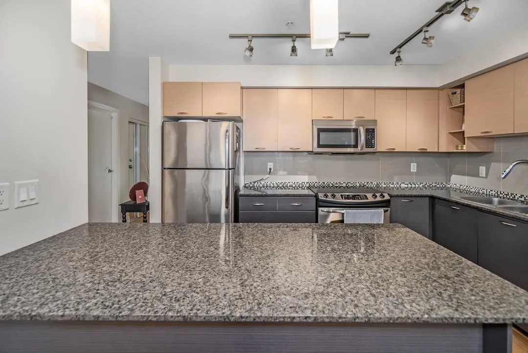 One of the largest and best layouts in the Latitude complex! This rare 2 bedroom + DEN home features a massive chef-inspired kitchen with an abundance of counter space, elegant granite countertops, rich designer cabinetry, and stainless steel appliances-perfect for those who love to cook and entertain. The open-concept dining and living area offers plenty of room to gather, highlighted by an electric fireplace and large windows for natural light. The primary bedroom boasts a walk-in closet and a luxurious ensuite, while both full baths feature quality fixtures and finishes. Includes 2 side-by-side parking stalls near the elevator and a storage locker on the same level. Enjoy amenities like a fitness room, lounge, and guest suite. Book your private showing today! (id:27476)