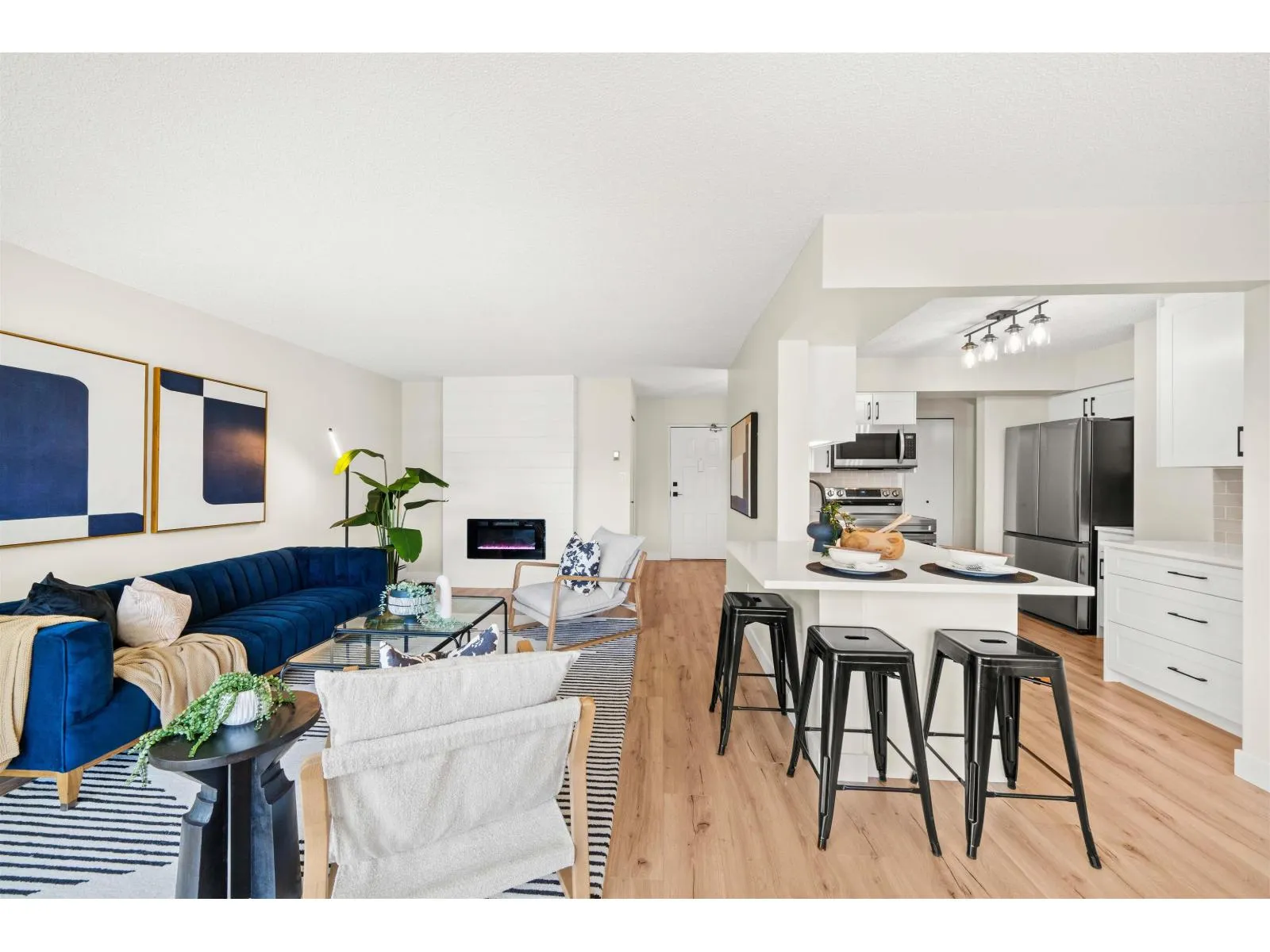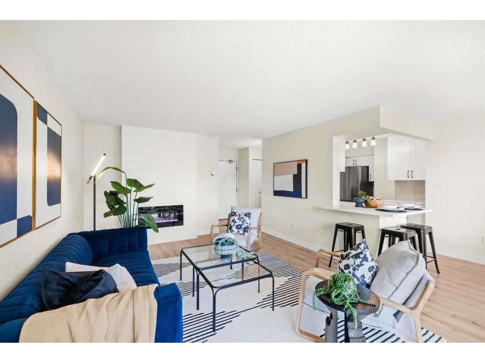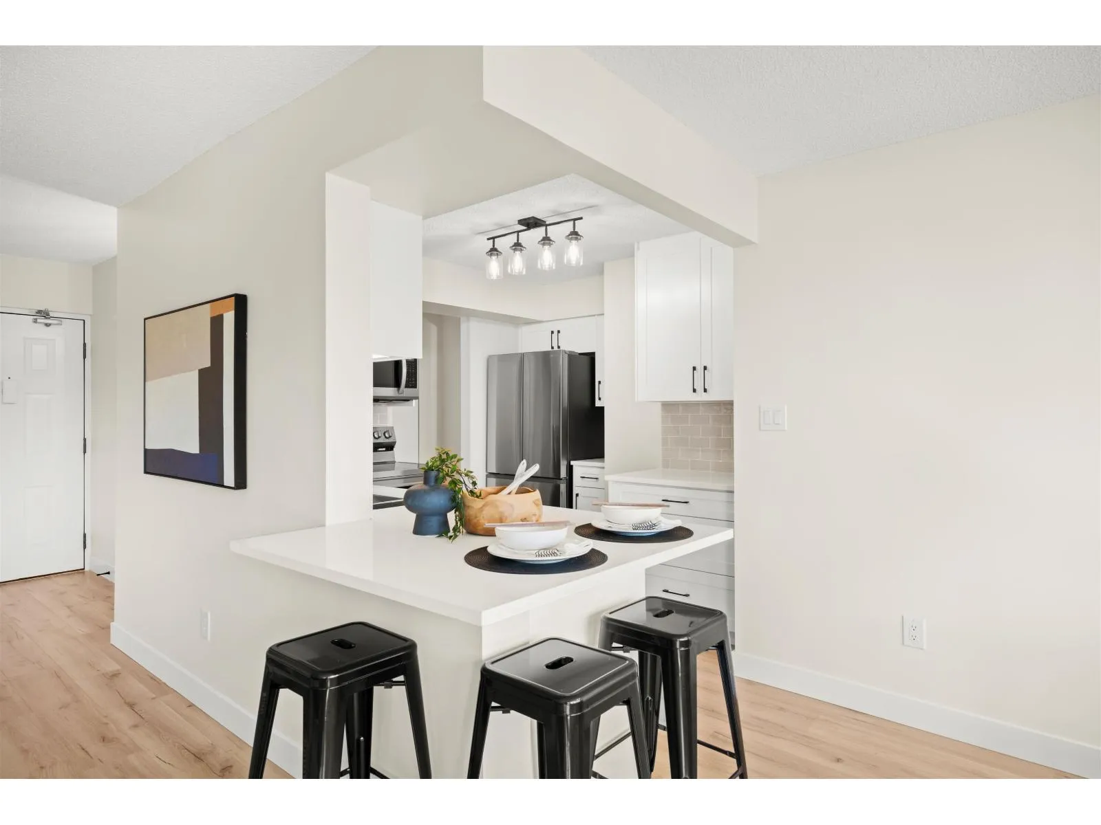 Renovation! Renovation! Renovation! This 2 bed, 2 bath unit is in Evergreen Village-one of Abbotsford's best managed 55+ communities. Concrete construction makes this home quiet and solid! Enjoy a spacious open-concept layout with a deluxe chef's kitchen, quartz counters, custom cabinetry, new stainless appliances, laminate flooring, A/C, and spa-like baths. Includes in-suite laundry and a versatile office/storage room. The building offers top-tier amenities: indoor pool, hot tub, workshop, library, hobby/recreation rooms, RV parking, guest suit and secured underground parking. Prime location with a bus stop out front and all essentials nearby. Call Today! (id:27476)