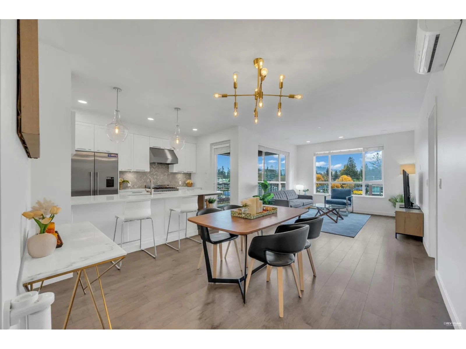 Corner unit in Abbotsford's luxury building, The Residences at Gateway. This spacious 2-bedroom, 2-bath suite offers premium finishes with a 9-foot ceiling, full laundry room, radiant bathroom floors, and heat pump/AC. Enjoy marble backsplash, wide plank flooring, and a balcony with a gas BBQ hookup. High-end appliances include a Bertazzoni gas range, Fisher & Paykel fridge, Bosch dishwasher, and built-in wine storage. Comes with 2 secure underground parking spaces and a large 8' x 8' storage locker next to your parking. Covered by New Home Warranty. Close to downtown Abbotsford, Highway 1, shopping, and dining. (id:27476)
