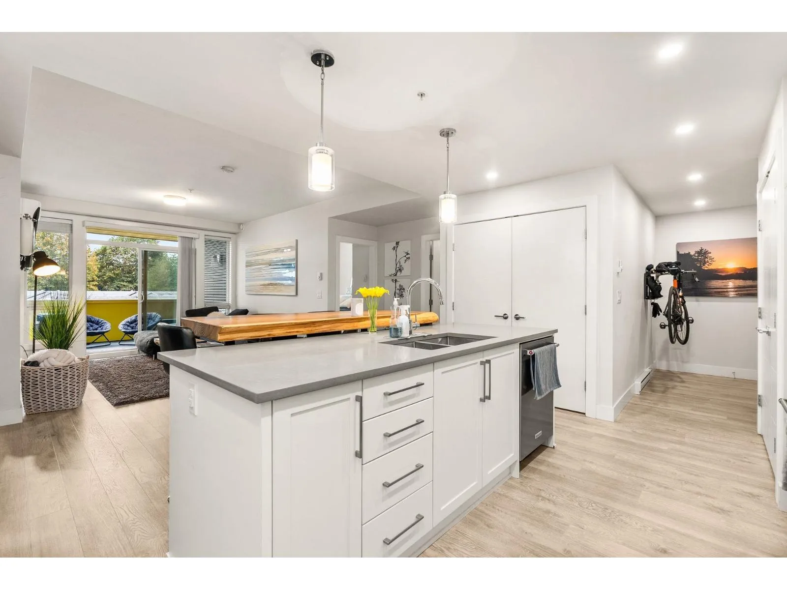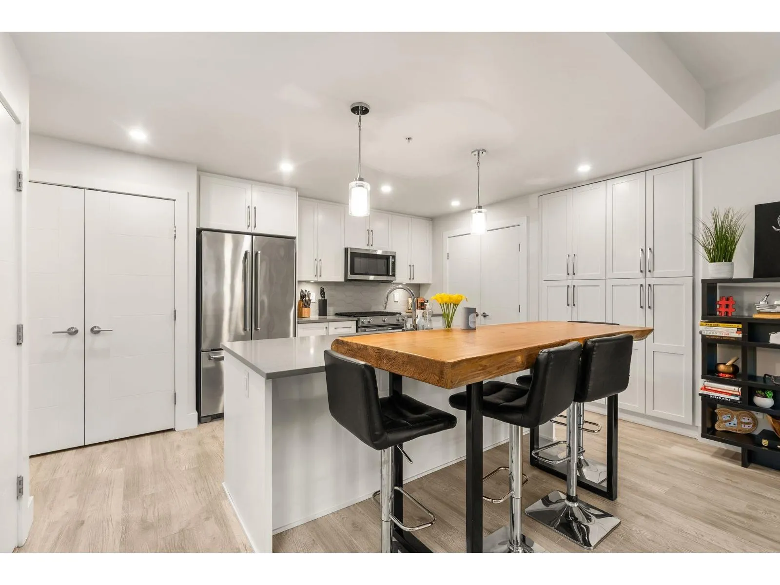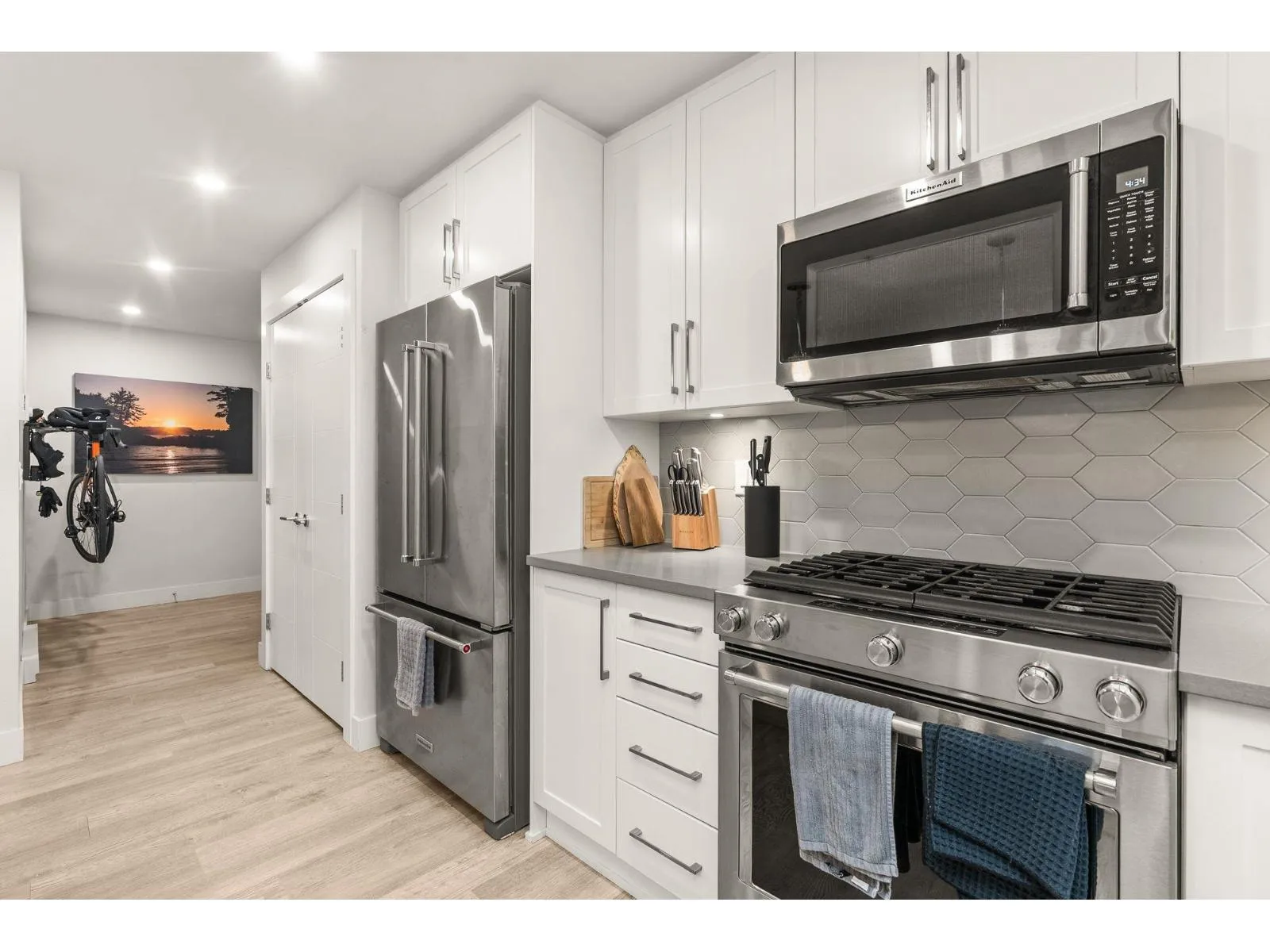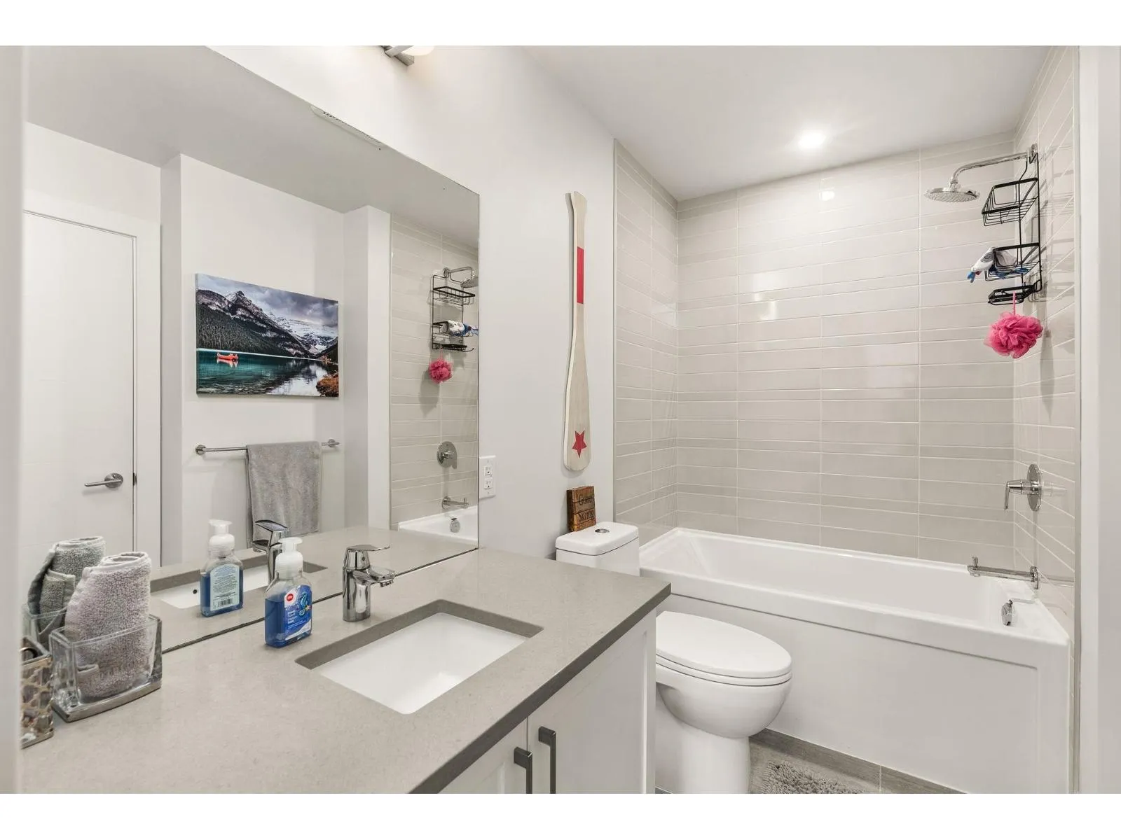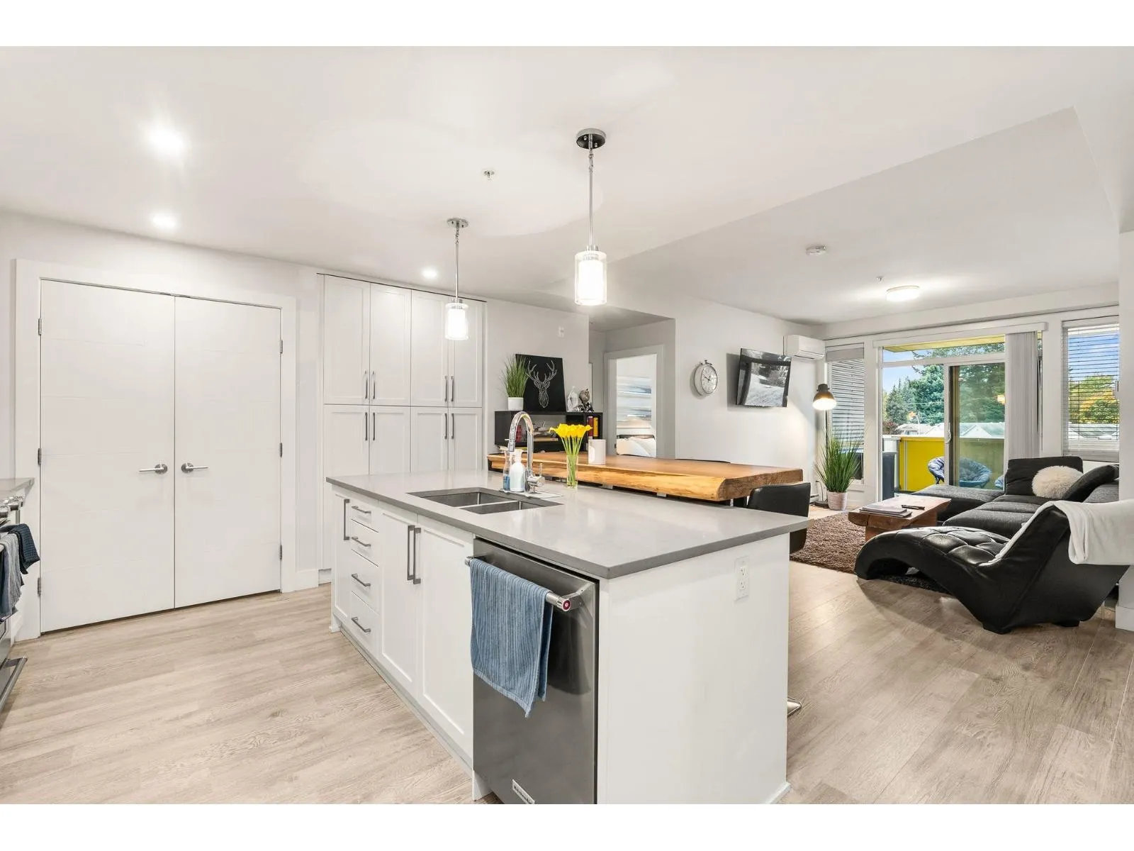 Welcome to Mill District, where modern living meets unbeatable convenience. This bright and stylish 2-bedroom 2-bathroom home is ideally situated in one of Abbotsford's most central locations, just steps away from Mill Lake Park and surrounded by mountain views. Inside enjoy high ceilings, granite countertops, premium KitchenAid appliances with a gas range, and a spacious kitchen complete with large pantry. The home features laminate flooring, a side-by-side washer and dryer and air conditioning for year-round comfort. Both bedrooms include a walk-in closet and private, ensuite bathrooms, with the primary offering a double vanity and glass door, a rain shower. Step outside to a large west-facing patio with an unobstructed view and a gas BBQ hookup perfect for relaxing in the evenings! (id:27476)