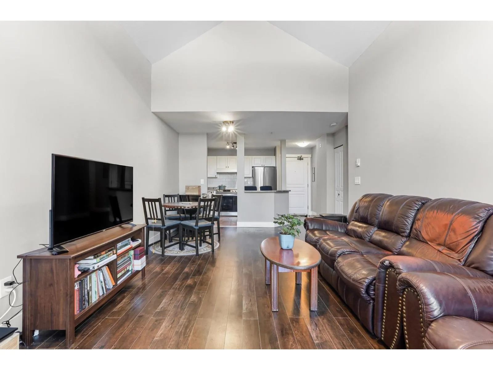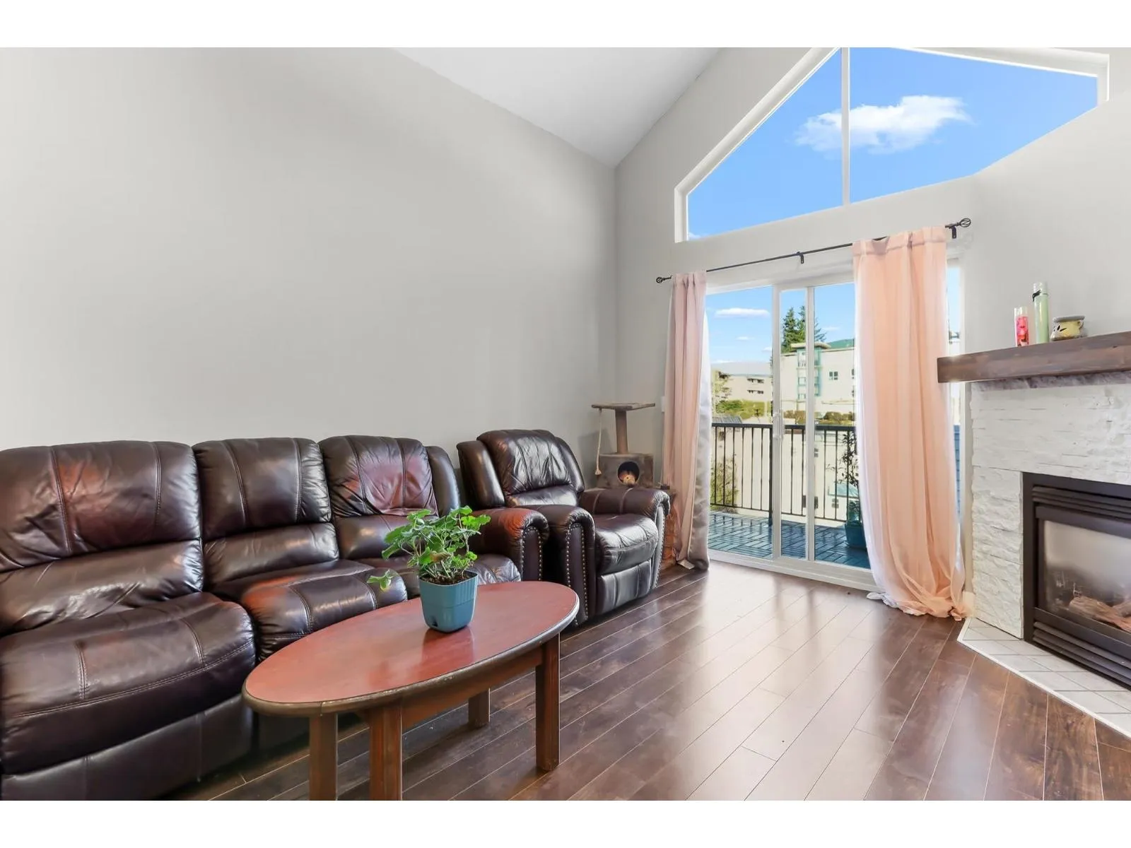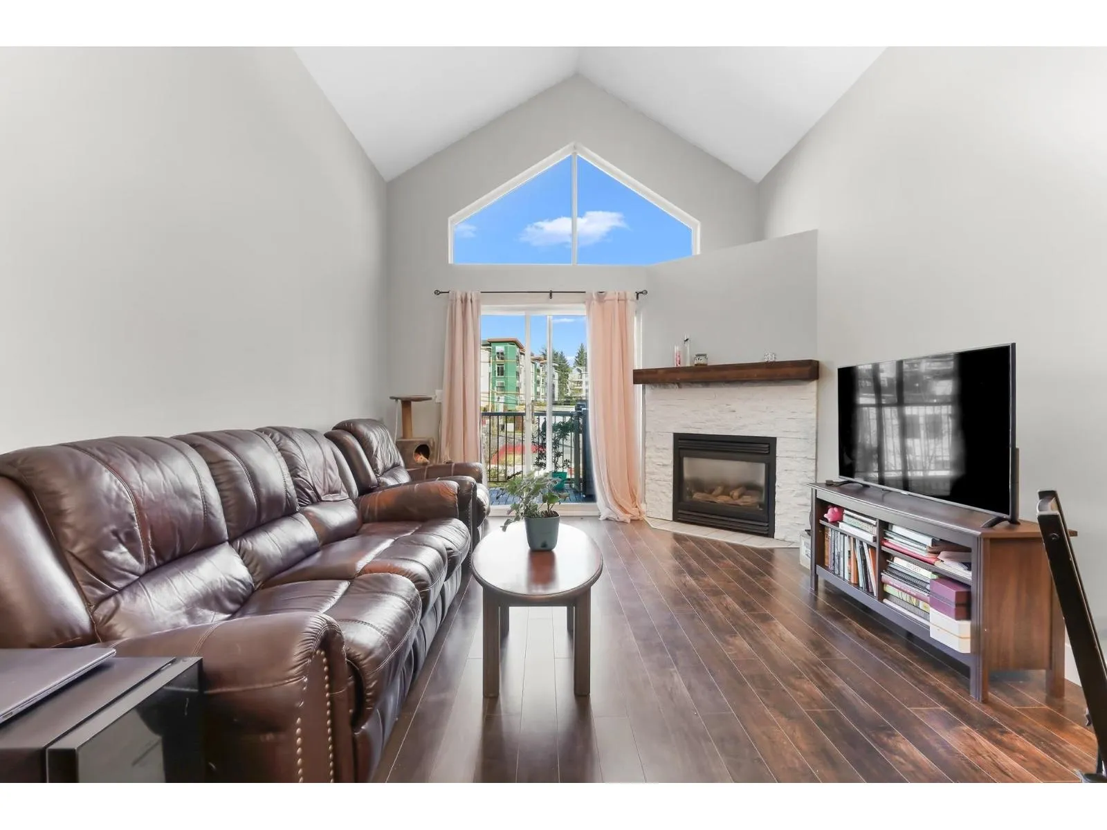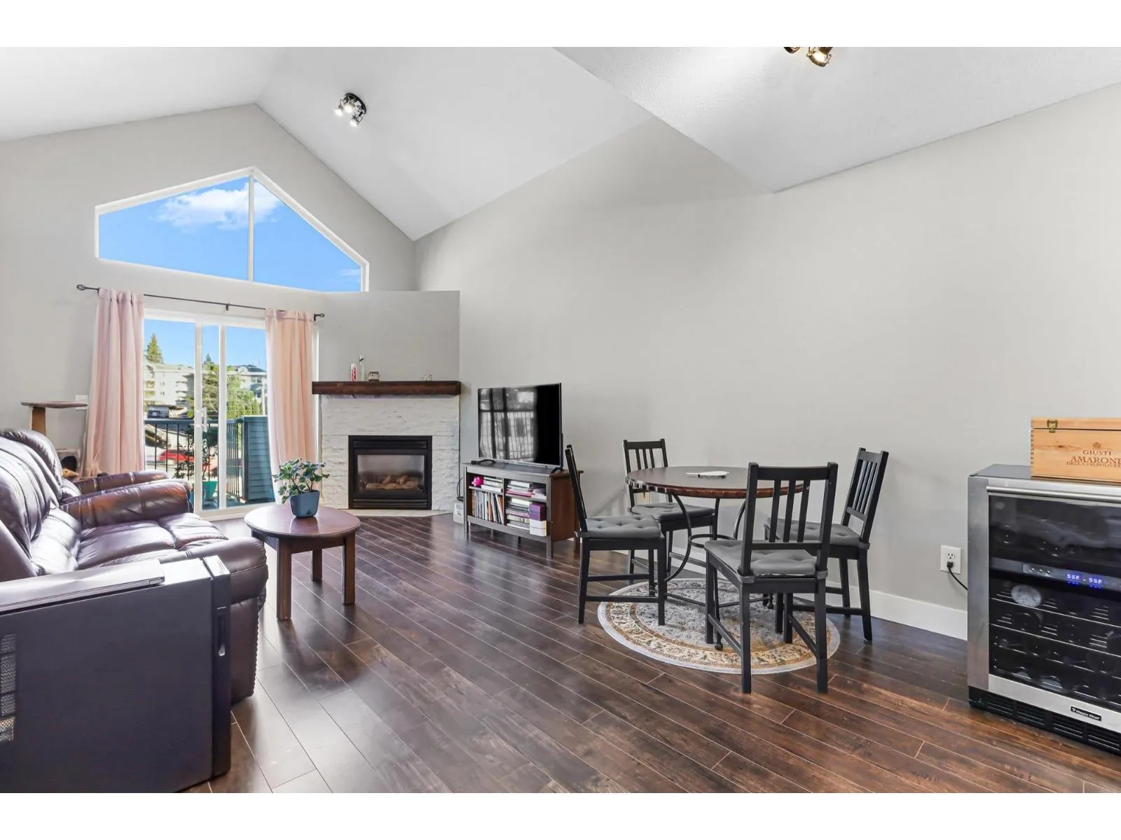 Welcome home to this inviting top-floor corner retreat, flooded with natural light and showcasing northwest-facing views. Soaring 14-ft vaulted ceilings create an open, airy atmosphere, while the cozy gas fireplace (included in strata fees) makes it the perfect place to unwind. Step outside to your generous 126 sq. ft. patio-ideal for enjoying warm summer evenings. The kitchen shines with stainless steel appliances, including a stylish double French-door refrigerator. The spacious bedroom easily accommodates a king-size bed and features walk-through closets leading to a convenient ensuite with cheater access. Enjoy the added convenience of a fitness centre located on the same floor, plus a beautifully landscaped common outdoor area overlooking the ravine. Pet-friendly building. (id:27476)