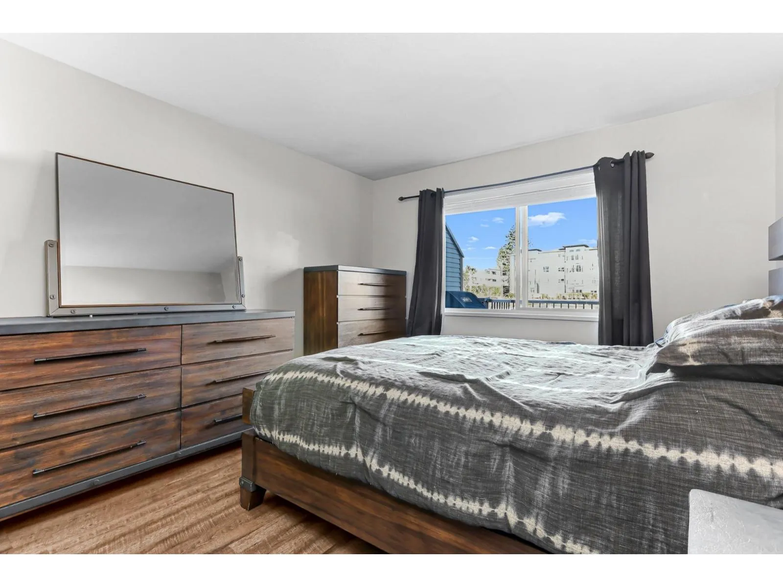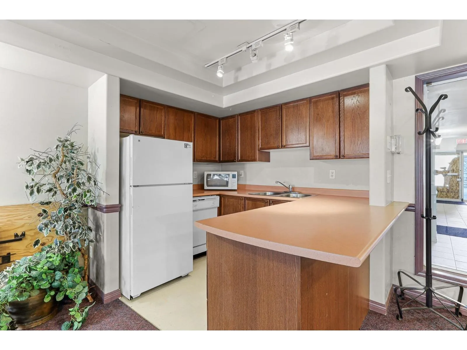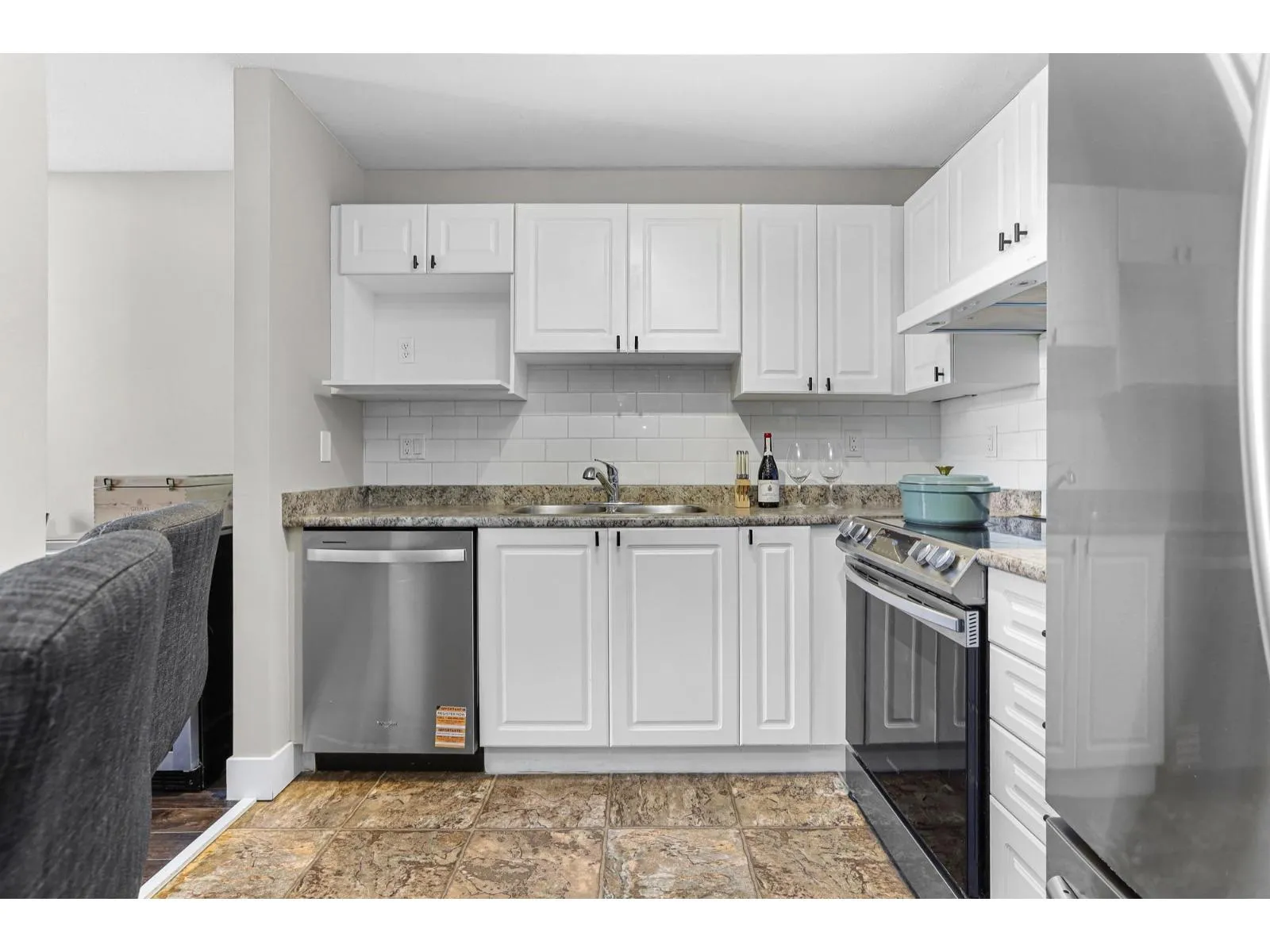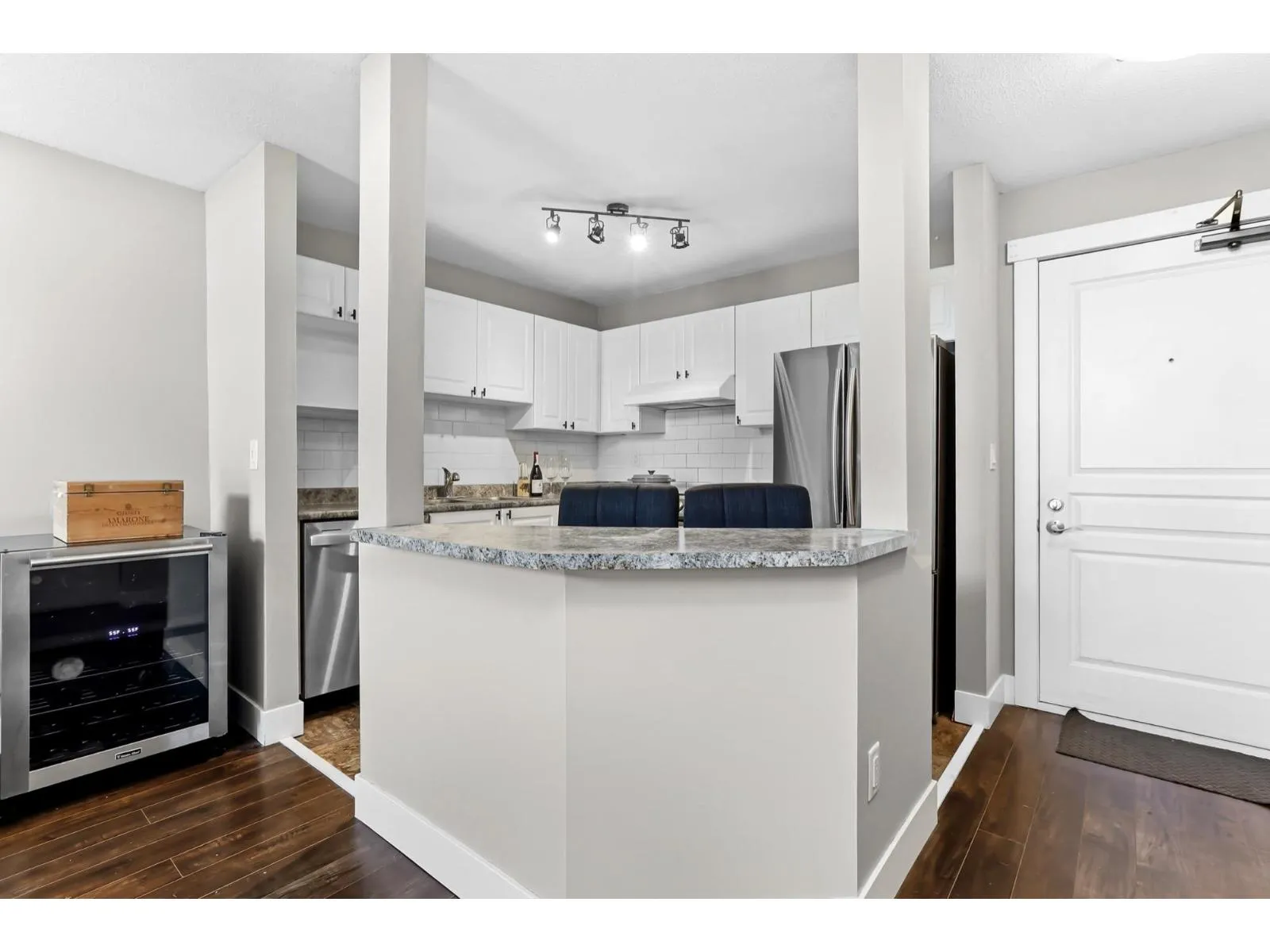 Welcome home to this inviting top-floor corner retreat, flooded with natural light and showcasing northwest-facing views. Soaring 14-ft vaulted ceilings create an open, airy atmosphere, while the cozy gas fireplace (included in strata fees) makes it the perfect place to unwind. Step outside to your generous 126 sq. ft. patio-ideal for enjoying warm summer evenings. The kitchen shines with stainless steel appliances, including a stylish double French-door refrigerator. The spacious bedroom easily accommodates a king-size bed and features walk-through closets leading to a convenient ensuite with cheater access. Enjoy the added convenience of a fitness centre located on the same floor, plus a beautifully landscaped common outdoor area overlooking the ravine. Pet-friendly building. (id:27476)