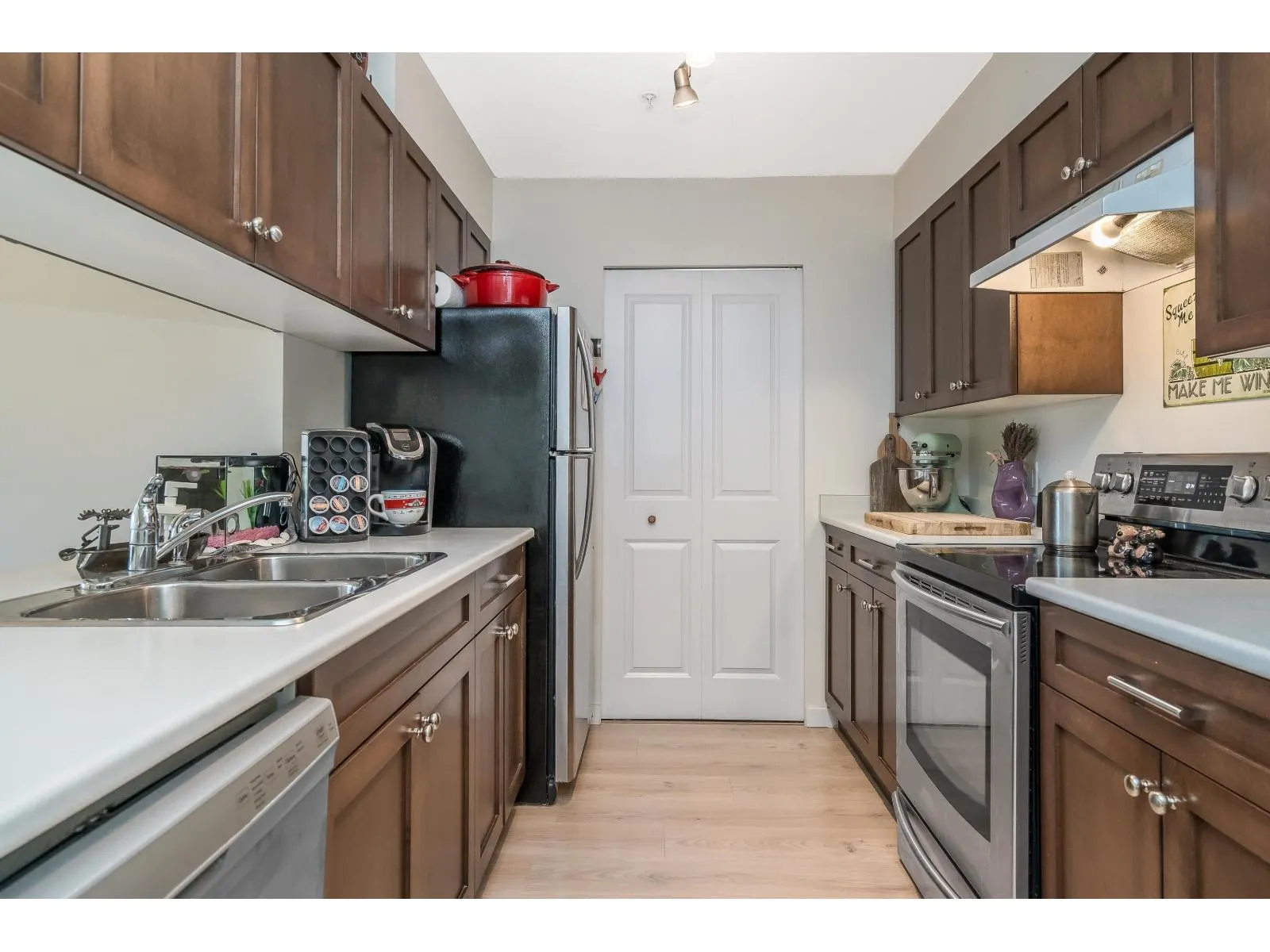 Professionally RENOVATED and ready for you! This 2 bedroom + 2 bath condo, with a large south-west facing balcony and panoramic views of the city/mountains, has it all. You'll love the open concept floor plan with brand new laminate flooring and new kitchen cabinets (2024), all stainless steel appliances with large island, wide entry with room for a dining table, tons of natural light with southern exposure, generously sized primary bedroom, walk-in closet and ensuite. Recent updates made to the common area flooring, fresh paint, and conveniently located near Abbotsford's Historic Downtown, makes this a no-brainer to call home or to invest. 2 garage parking spaces and 1 locker seal the deal, with easy access to the #1 and #11 highways, public transit at your doorstep, and pet friendly! (id:27476)