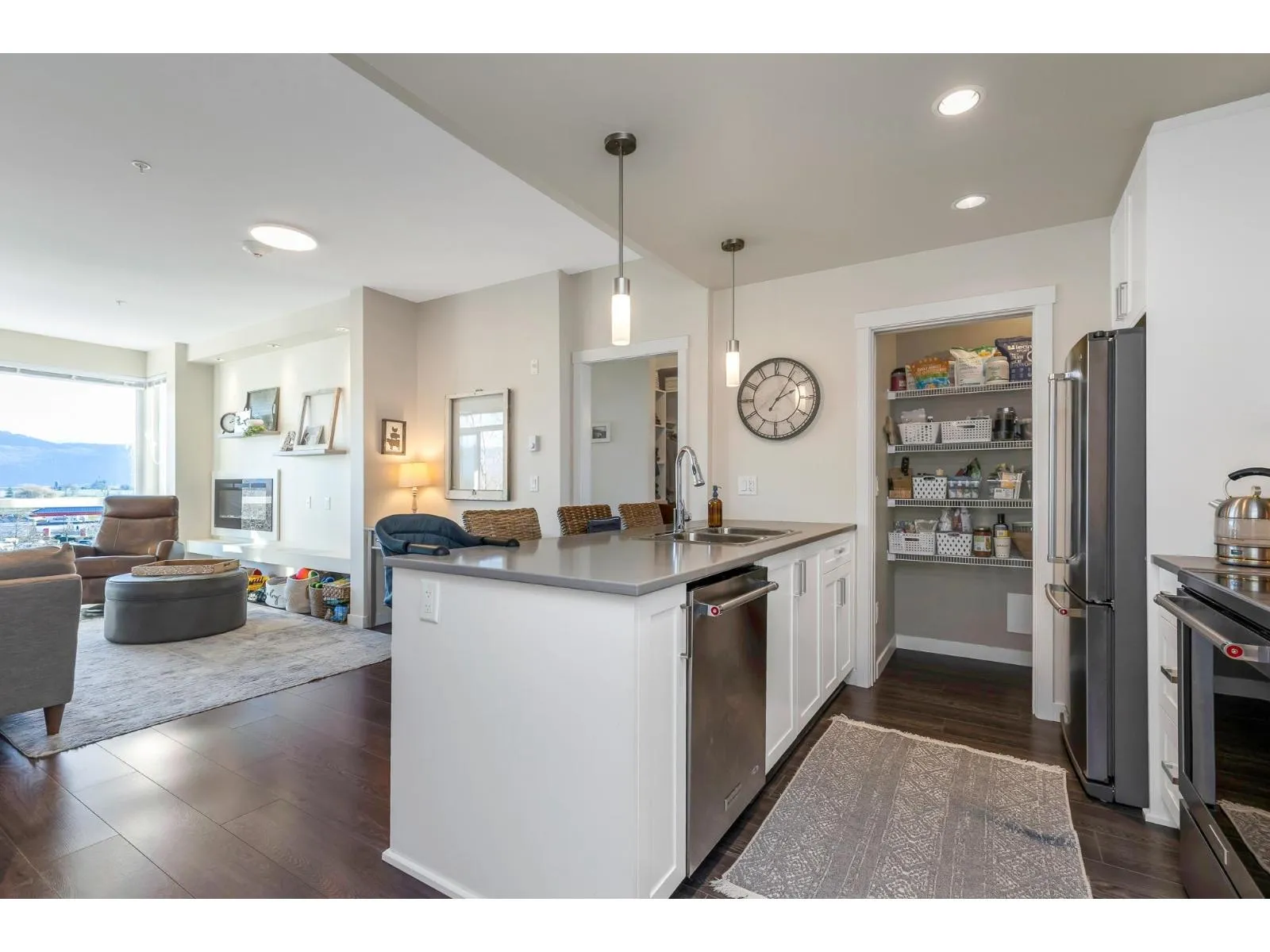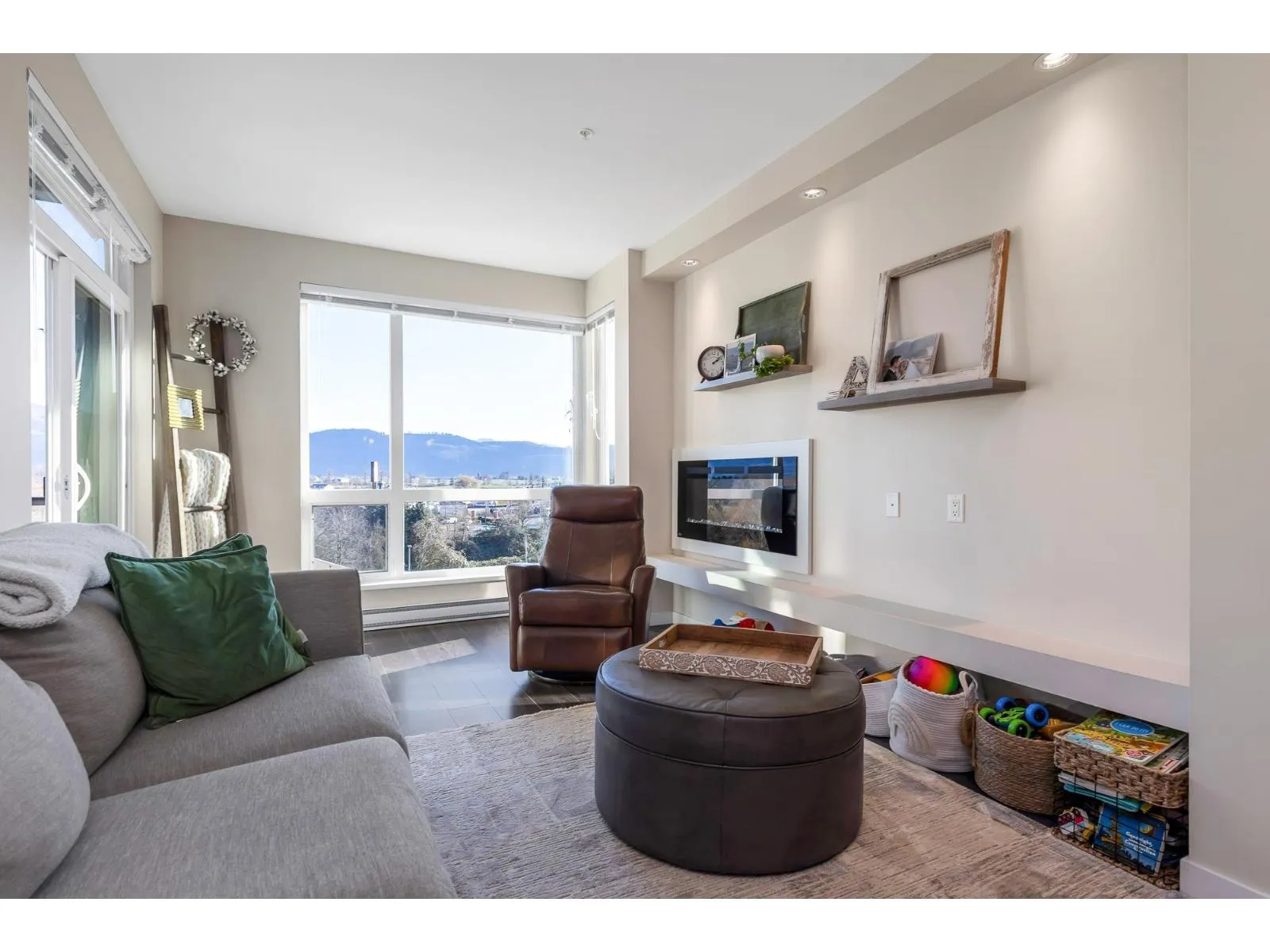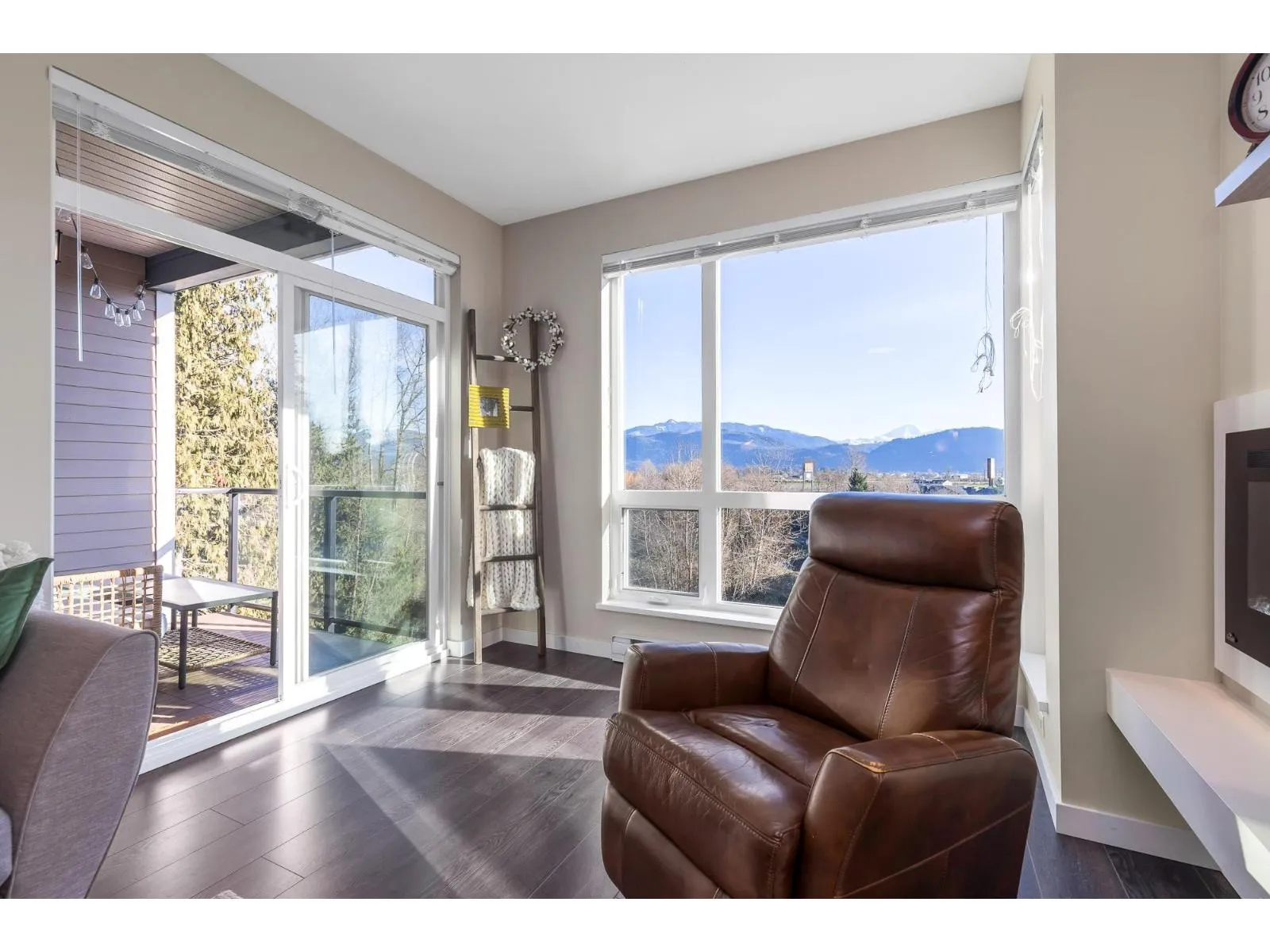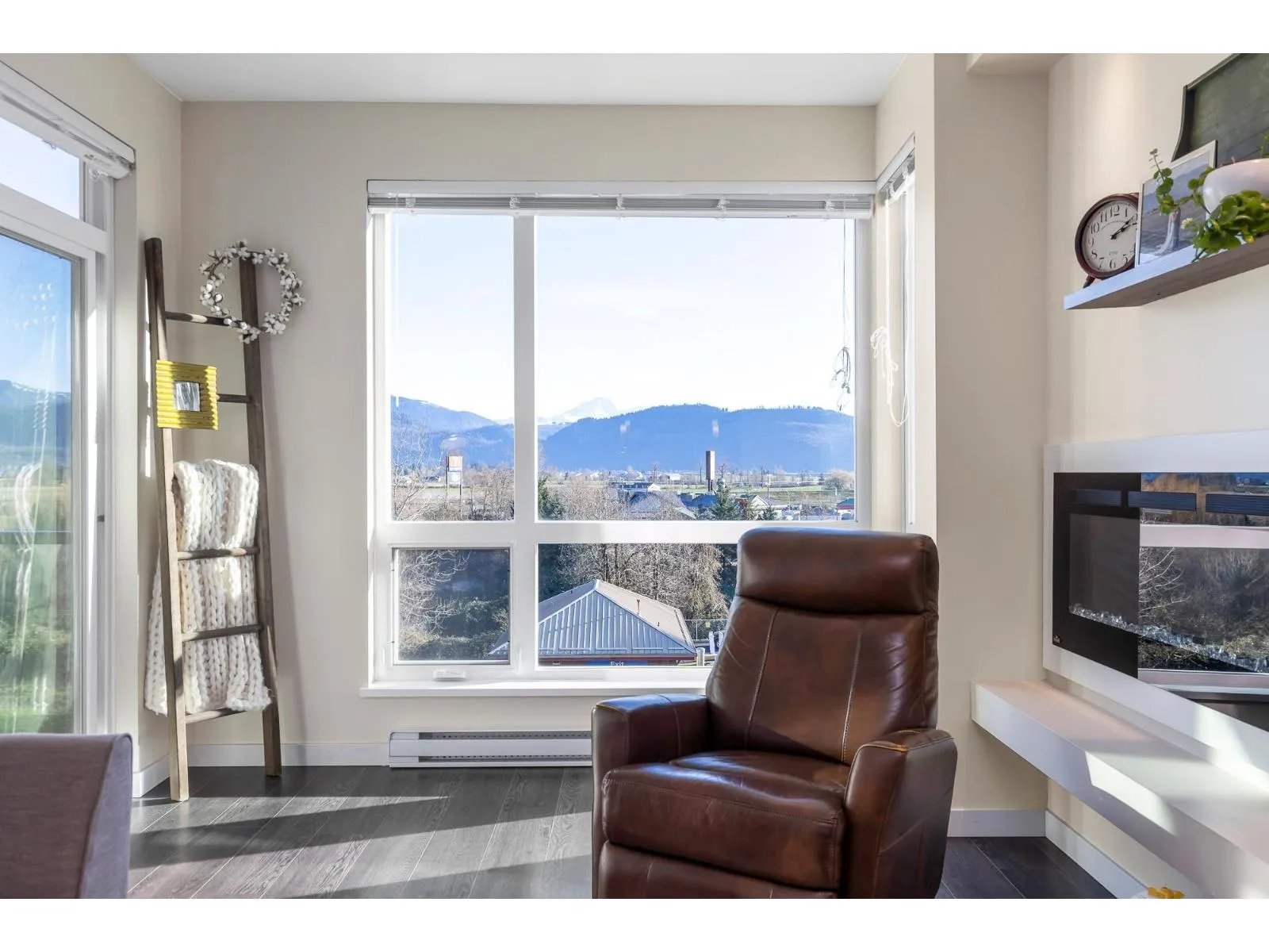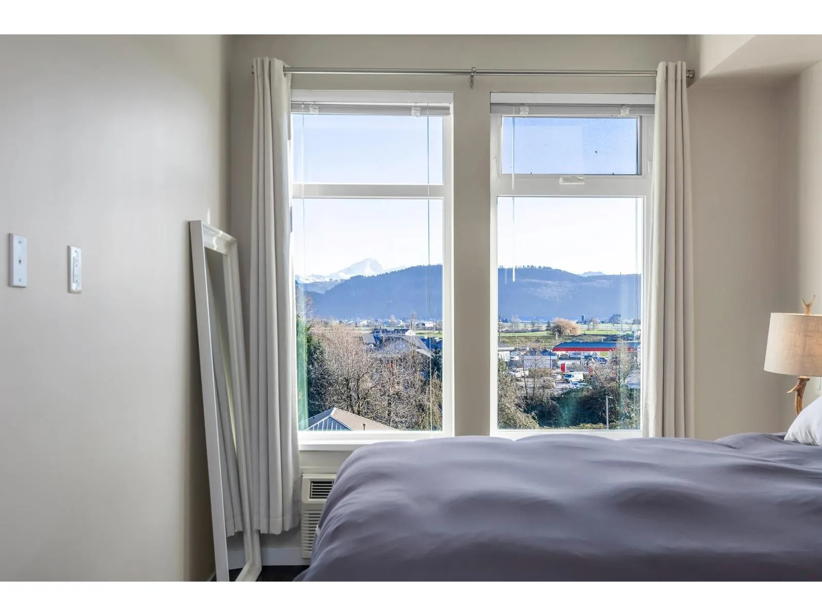Immaculately kept unit with fantastic Baker/farmland views and plenty of natural sunlight in East Abbotsford's best building! Functional open floor plan with a Southern facing balcony, laminate flooring throughout, a cozy electric fireplace, plus 2 bedrooms - each with direct access to its own bathroom. Spacious primary suite with walk-in closet, double sinks, blackout blinds, plus A/C. Kitchen features stainless steel appliances, a large pantry, & stone countertops throughout kitchen and bathrooms. Two parking stalls & storage locker included. Proactive, well-run strata. Endless hot water included. Well insulated makes for very low heating costs. Excellent building amenities - heated outdoor pool, hot tub, fully equipped gym, & lounge w/ kitchen. Dogs & cats allowed, total of 2 w/ 30lb limit each. Includes a private walking path circling the building and well kept greenspace/park for your dogs. Quick Hwy 1 access with a shopping village located directly behind the building for convenience. Don't miss out! (id:27476)