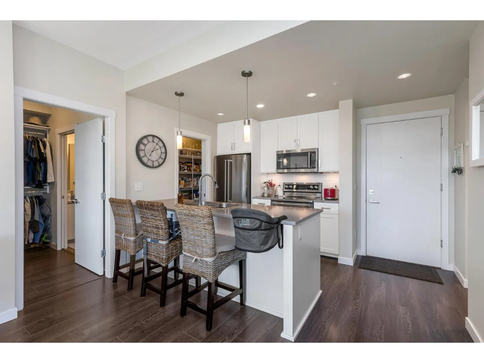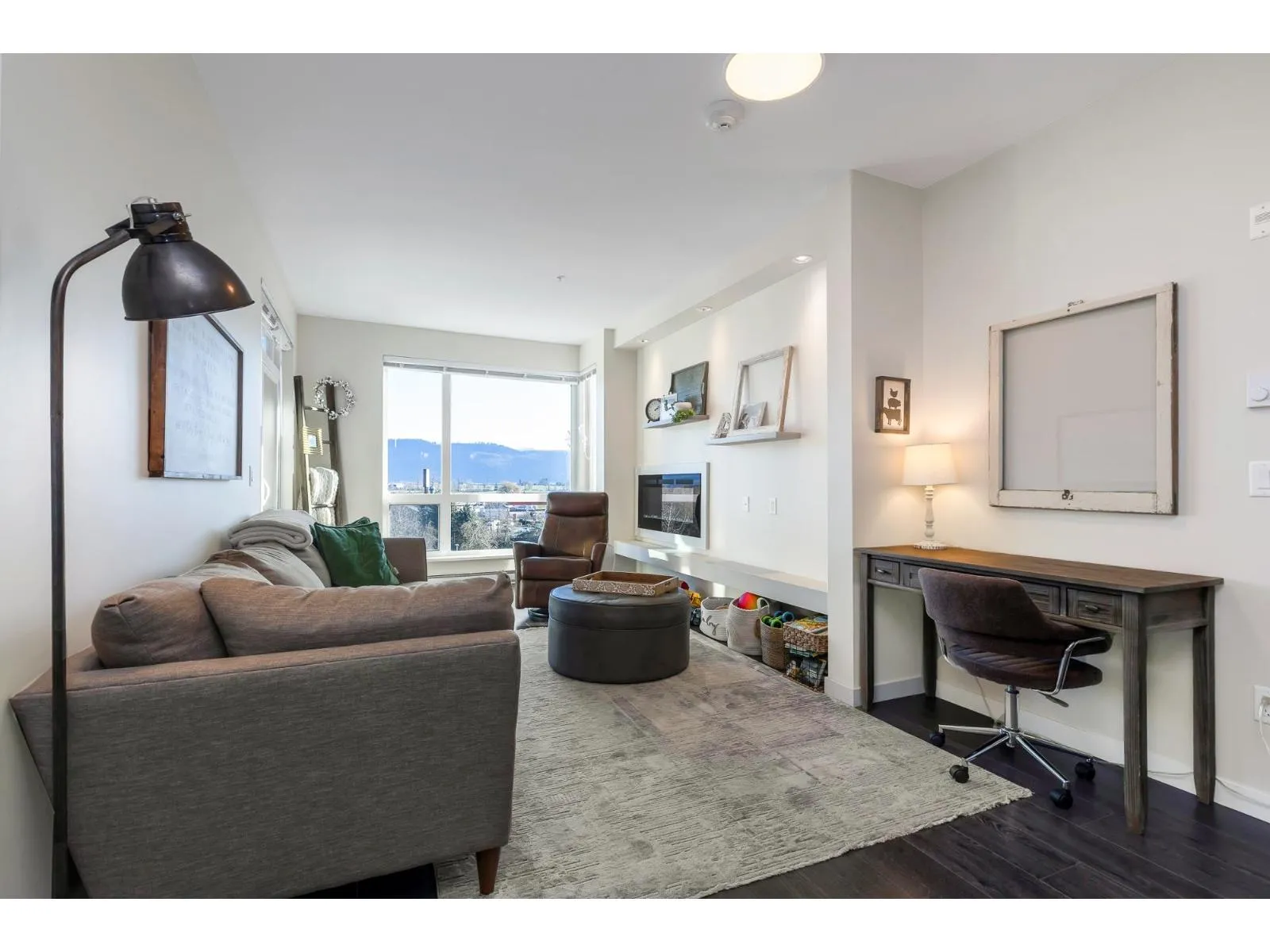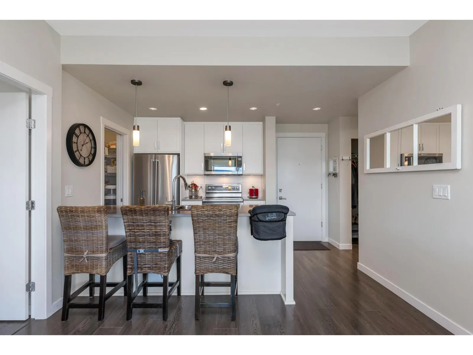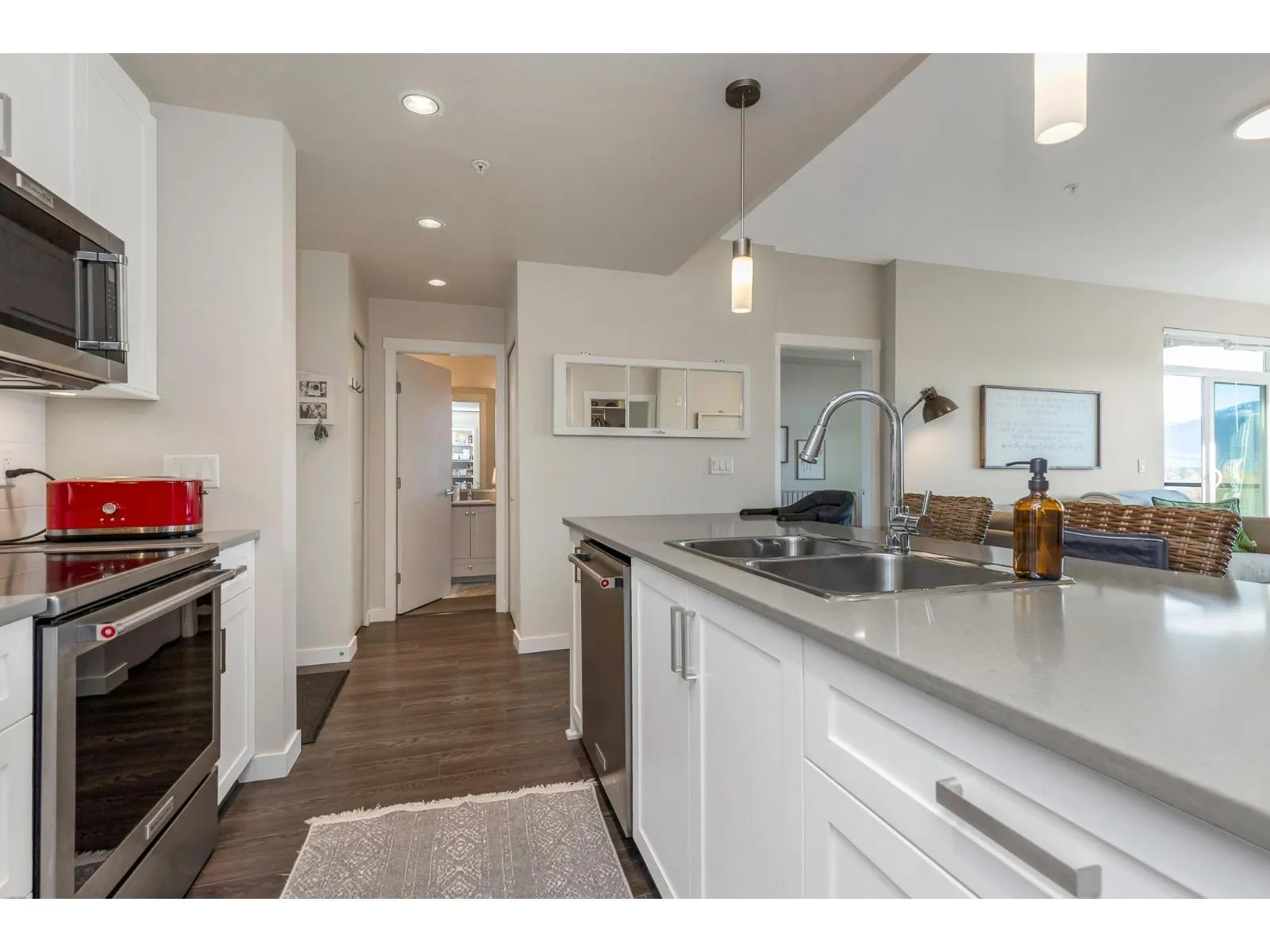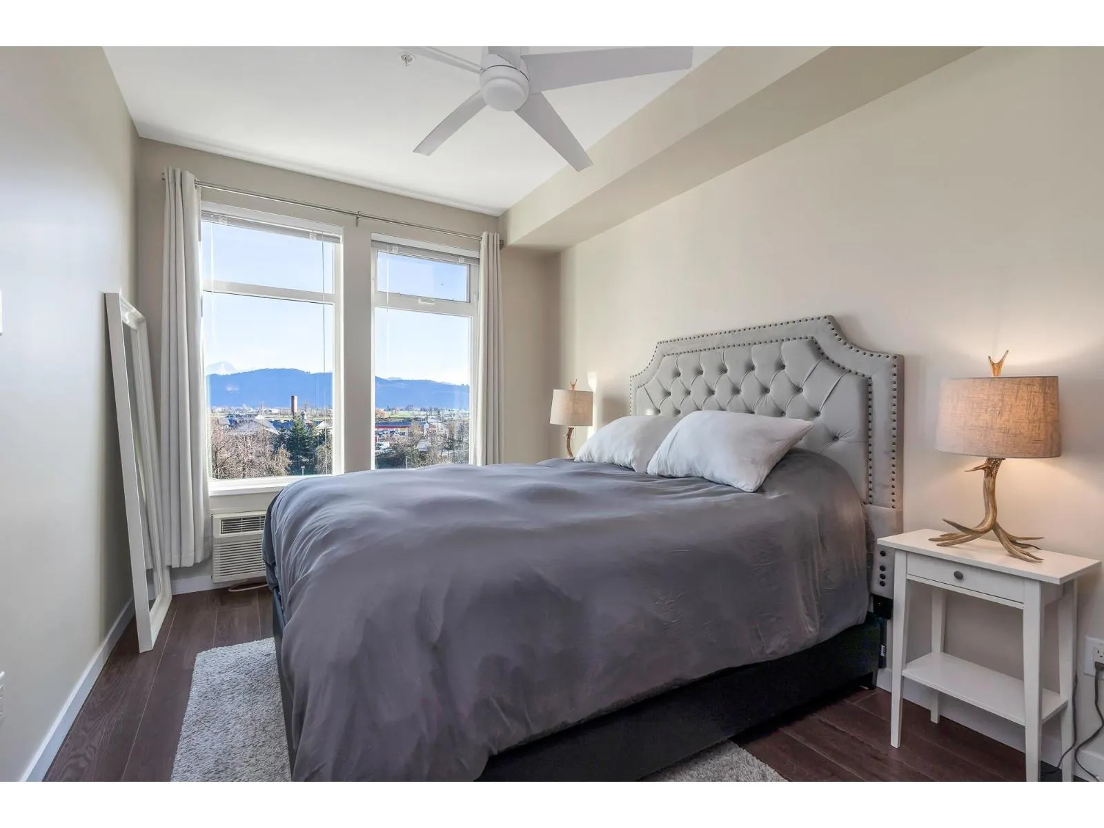 Immaculately kept unit with fantastic Baker/farmland views and plenty of natural sunlight in East Abbotsford's best building! Functional open floor plan with a Southern facing balcony, laminate flooring throughout, a cozy electric fireplace, plus 2 bedrooms - each with direct access to its own bathroom. Spacious primary suite with walk-in closet, double sinks, blackout blinds, plus A/C. Kitchen features stainless steel appliances, a large pantry, & stone countertops throughout kitchen and bathrooms. Two parking stalls & storage locker included. Proactive, well-run strata. Endless hot water included. Well insulated makes for very low heating costs. Excellent building amenities - heated outdoor pool, hot tub, fully equipped gym, & lounge w/ kitchen. Dogs & cats allowed, total of 2 w/ 30lb limit each. Includes a private walking path circling the building and well kept greenspace/park for your dogs. Quick Hwy 1 access with a shopping village located directly behind the building for convenience. Don't miss out! (id:27476)