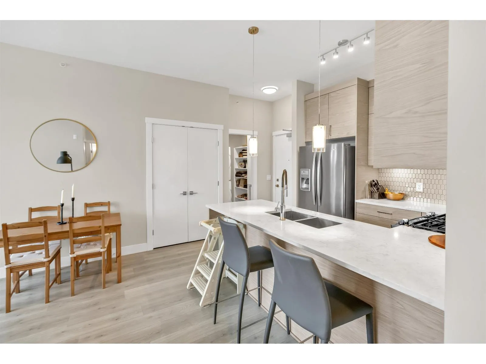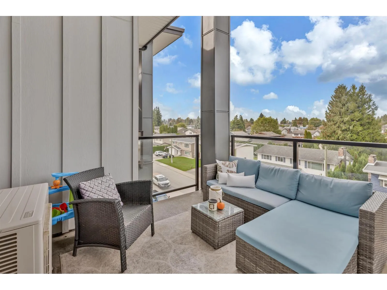 Welcome to the Onyx - a centrally located Abbotsford condo community offering exceptional convenience and comfortable contemporary living. This top-floor 2-bedroom plus den, 2-bath residence gives you both privacy and light, with the added advantage of being on the building's 4th (top) level for quieter living and great sightlines. Step inside to an inviting layout designed for everyday life and entertaining. The flexible den is perfect as a dedicated home office, study, or small guest room. Two full bathrooms mean mornings are simpler for everyone. The bedrooms are well-proportioned and separated from the living area for added privacy. Gas range, and stainless steel appliances bring this kitchen to life, and bring your morning coffee out on the patio to enjoy the beautiful views. (id:27476)