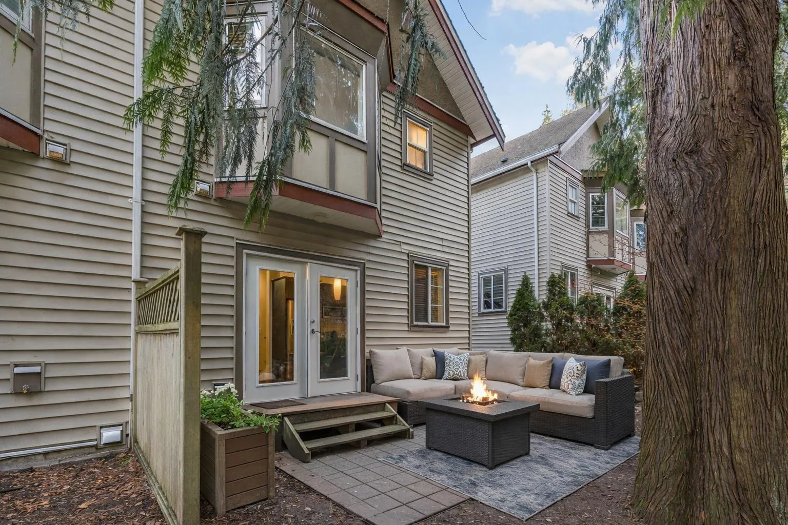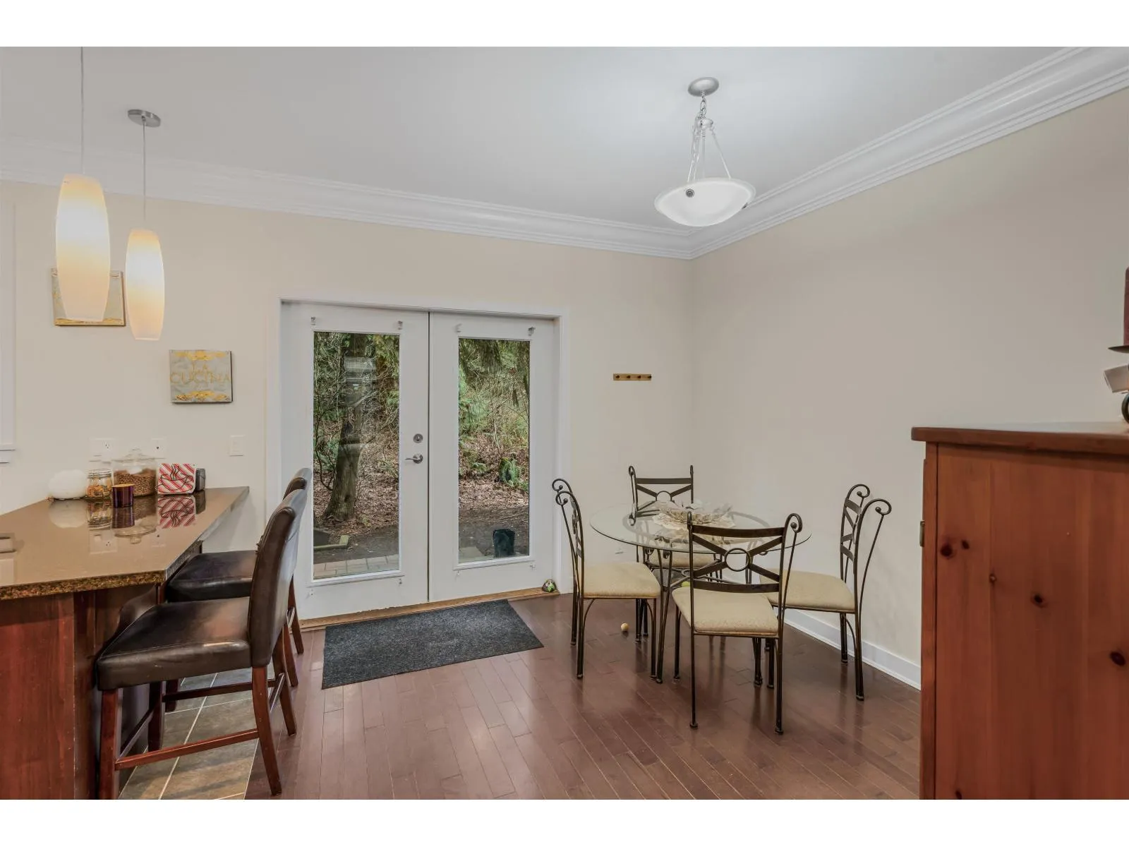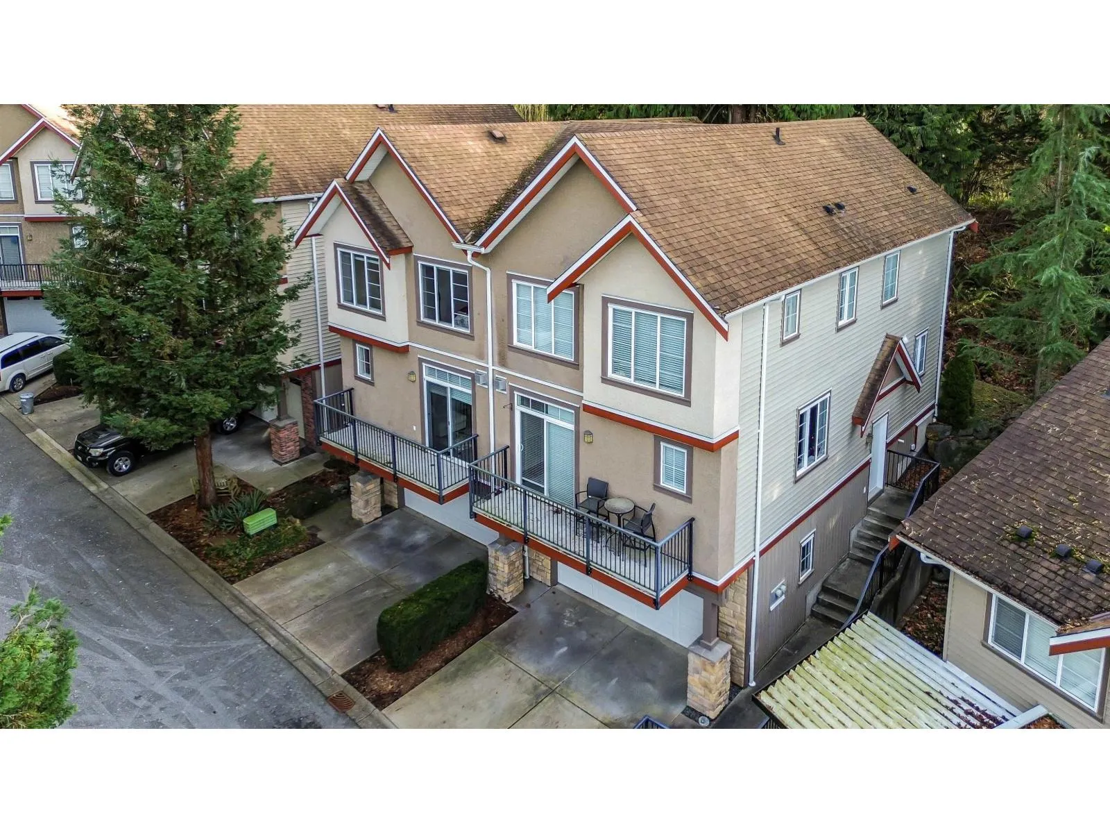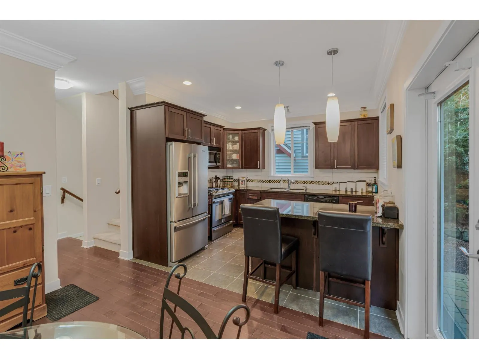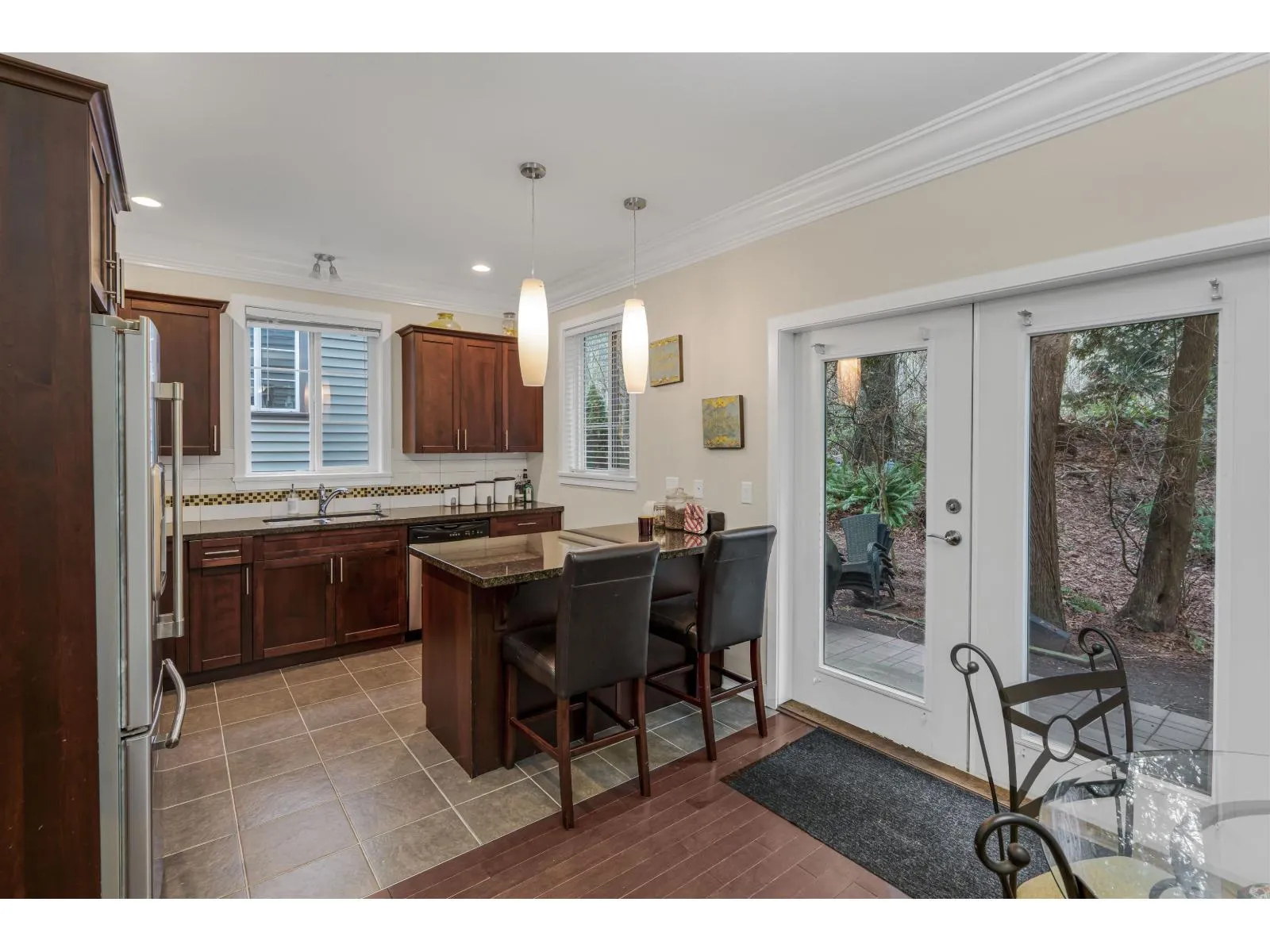 Welcome to Ledgeview Villas! This 4-bedroom, 3-bathroom end unit is bright and spacious with a functional layout and plenty of room to grow. The open-concept main floor is ideal for everyday living and entertaining. The kitchen features a gas range & granite countertops. Off the kitchen are french doors leading to the patio. Upstairs you'll find the primary bedroom with ensuite and walk-in closet, 2 more bedrooms, and laundry, bonus area, Downstairs features an extra bedroom or rec room, Double garage with 2 large parking spaces on the driveway. Rentals are OK and pets are allowed in this complex. Walk to Ledgeview golf course, prince Charles elementary and more. This townhome is located at the top of the complex in the most private location backing onto the greenbelt. (id:27476)