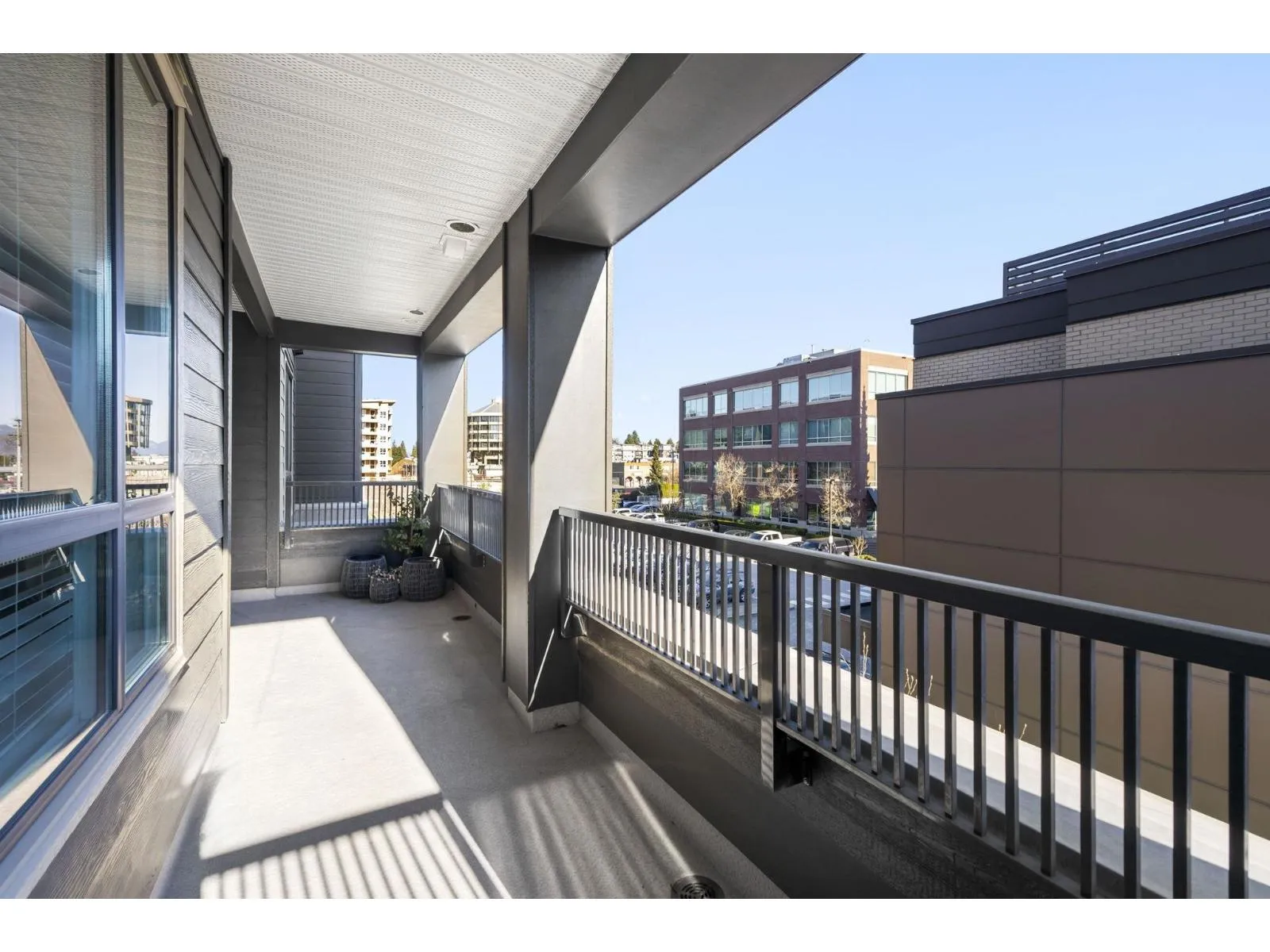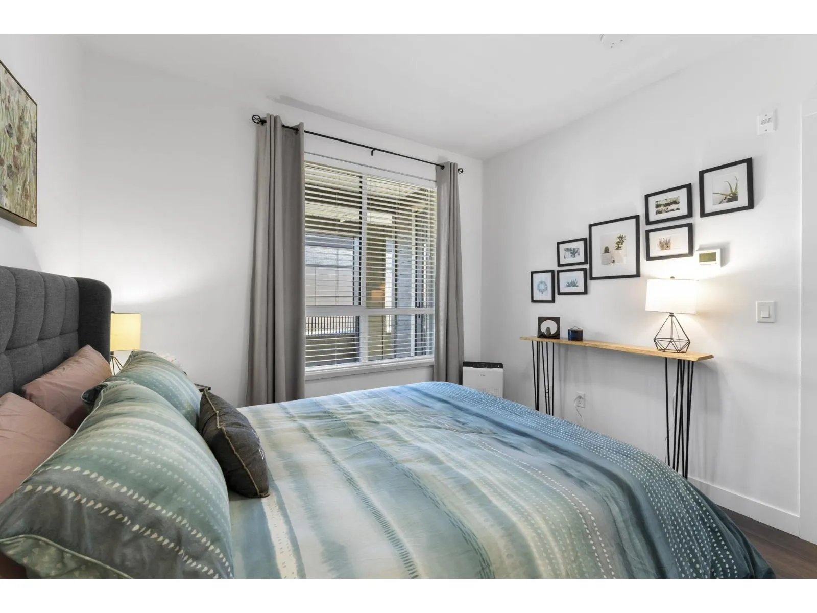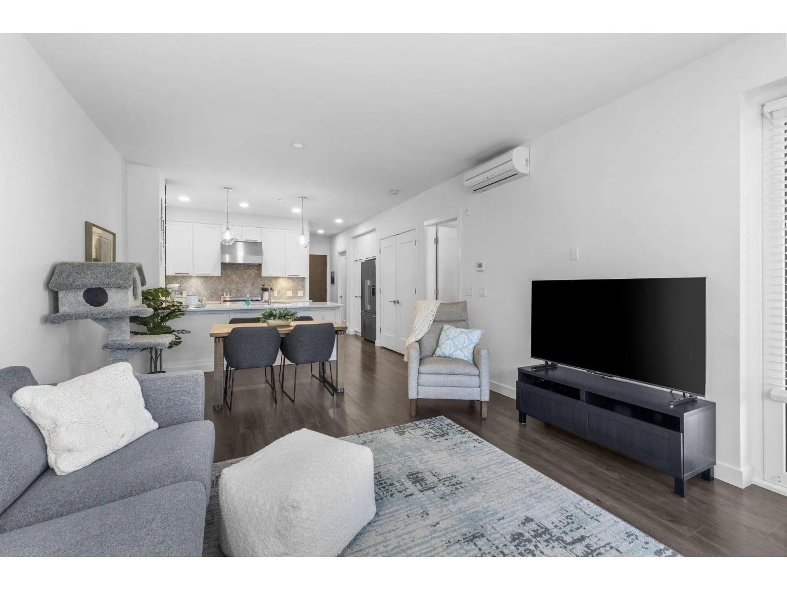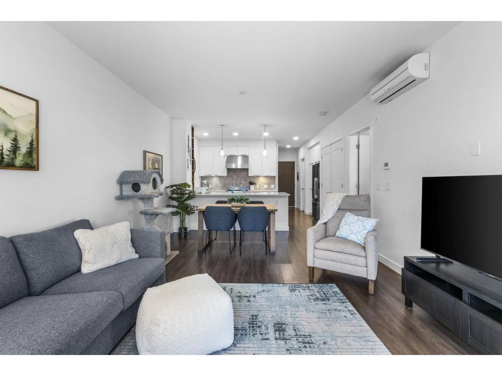 Experience modern luxury living in this meticulously maintained, 1 bedroom + den, 1.5 bathroom home at The Residence at Gateway. Designed with comfort and quality in mind, this residence features 9-ft ceilings, wide-plank flooring, and a bright open-concept layout that maximizes the space. The gourmet kitchen showcases premium stainless steel appliances, sleek cabinetry, and refined modern finishes. Enjoy efficient year-round comfort with a heat pump system and radiant heated bathroom floors. Step outside to a large private patio, perfect for relaxing or entertaining. Built to a high standard with premium and high-end finishings throughout. Includes a secure, gated storage locker with electricity. Ideally located minutes from UFV, the hospital, shopping, dining, and everyday amenities. (id:27476)