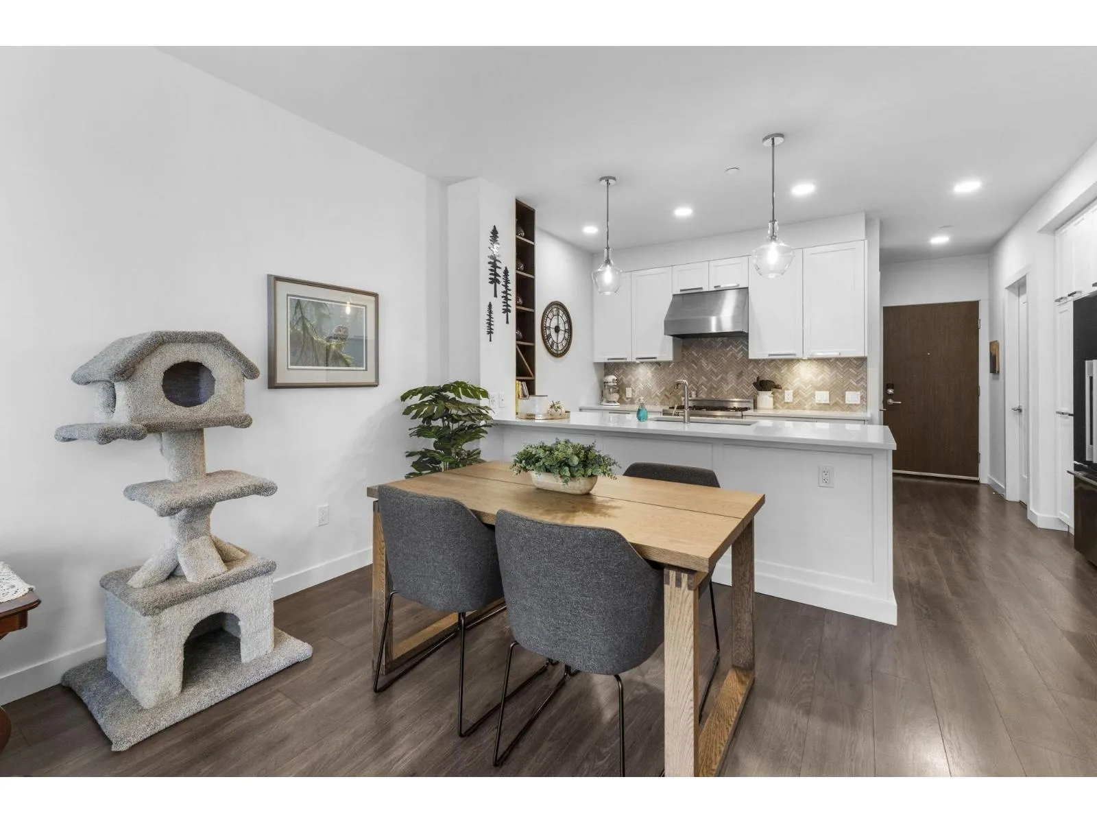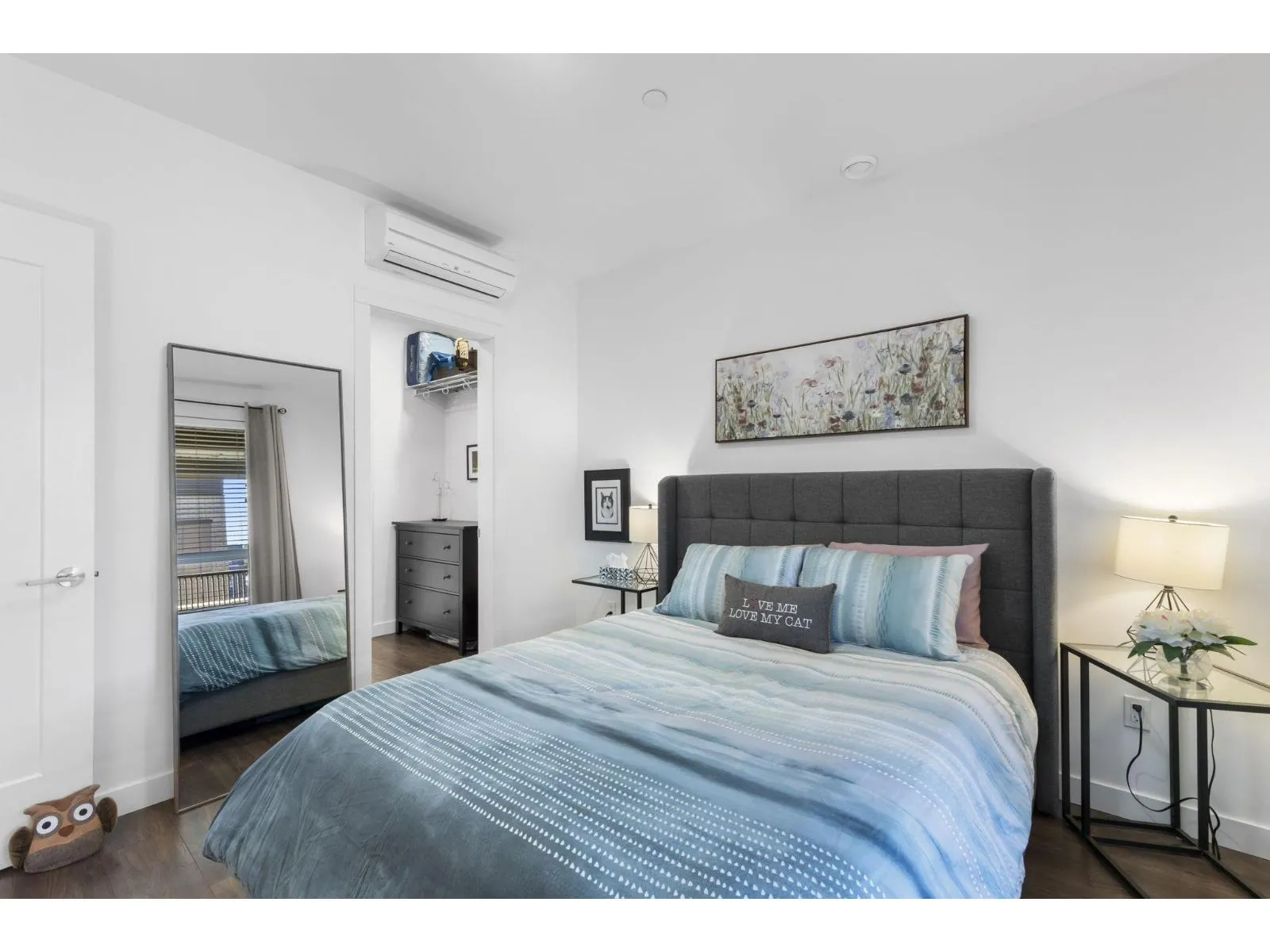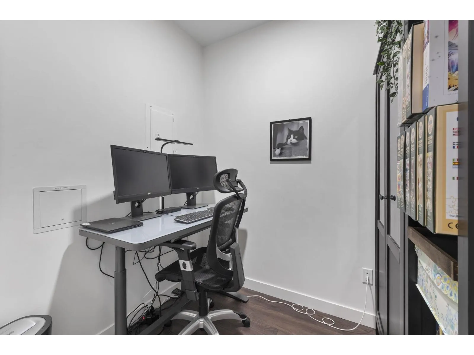 Experience modern luxury living in this meticulously maintained, 1 bedroom + den, 1.5 bathroom home at The Residence at Gateway. Designed with comfort and quality in mind, this residence features 9-ft ceilings, wide-plank flooring, and a bright open-concept layout that maximizes the space. The gourmet kitchen showcases premium stainless steel appliances, sleek cabinetry, and refined modern finishes. Enjoy efficient year-round comfort with a heat pump system and radiant heated bathroom floors. Step outside to a large private patio, perfect for relaxing or entertaining. Built to a high standard with premium and high-end finishings throughout. Includes a secure, gated storage locker with electricity. Ideally located minutes from UFV, the hospital, shopping, dining, and everyday amenities. (id:27476)