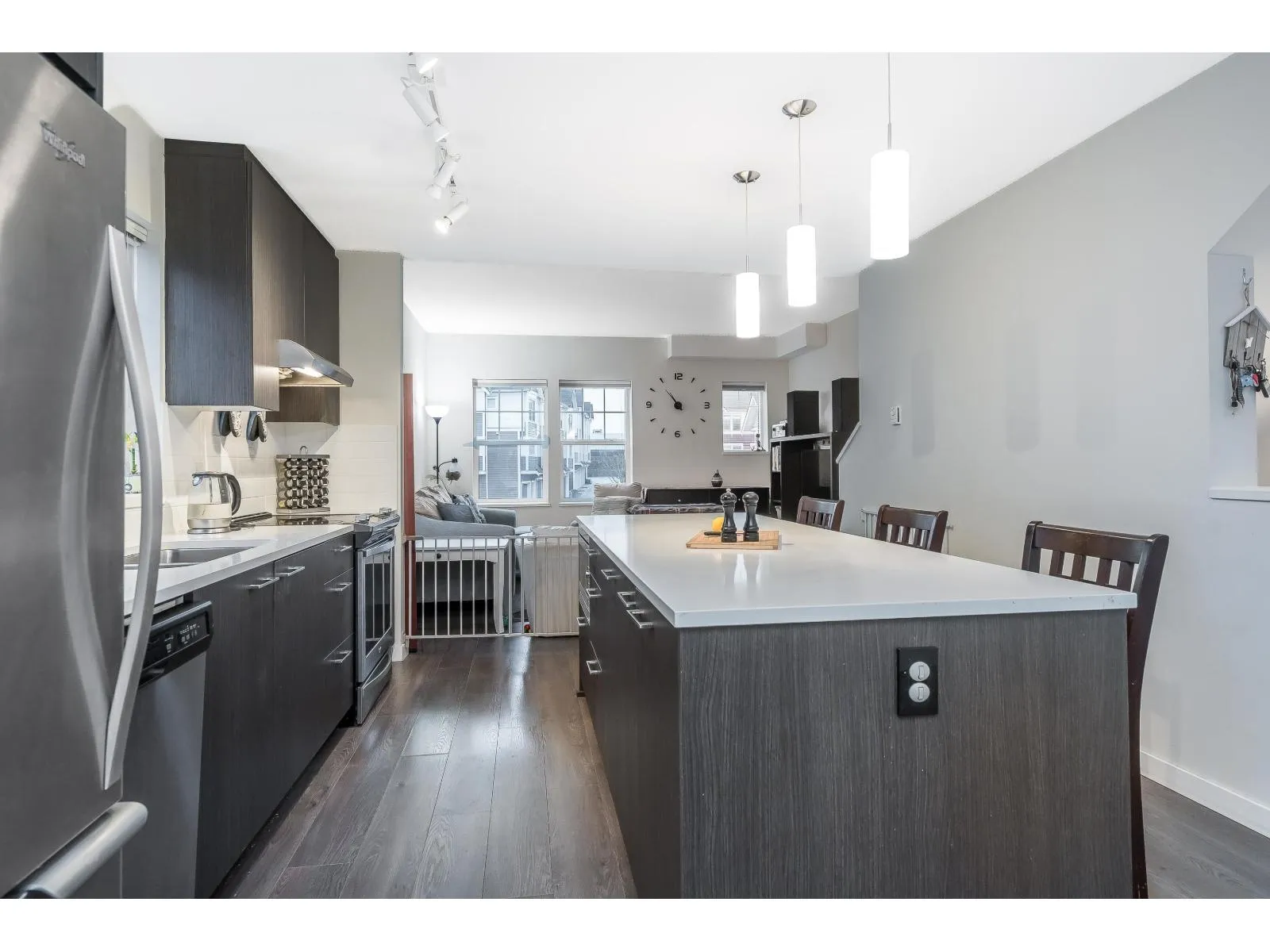 END UNIT Exceptional townhome in a prime, quiet location within the complex. Bright open-concept layout featuring a 10+ ft quartz island with white countertops, stainless steel appliances, and sun-filled living spaces. Enjoy sunset views from the living room and morning sun in the kitchen. Patio and sun deck open to a private, fully fenced outdoor space for pets and children. REC Facility on site! Three large bedrooms up, two full bathrooms, and a double-deep tandem garage with space for office or gym. Built by a well-regarded builder and centrally located-walking distance to malls, gyms, shopping, transit, and groceries. Rare end unit-one of the best in the complex. (id:27476)