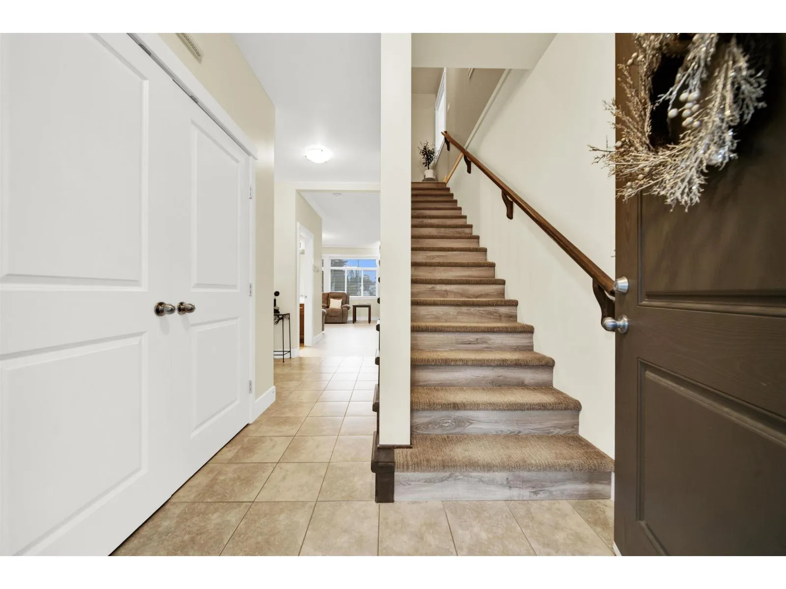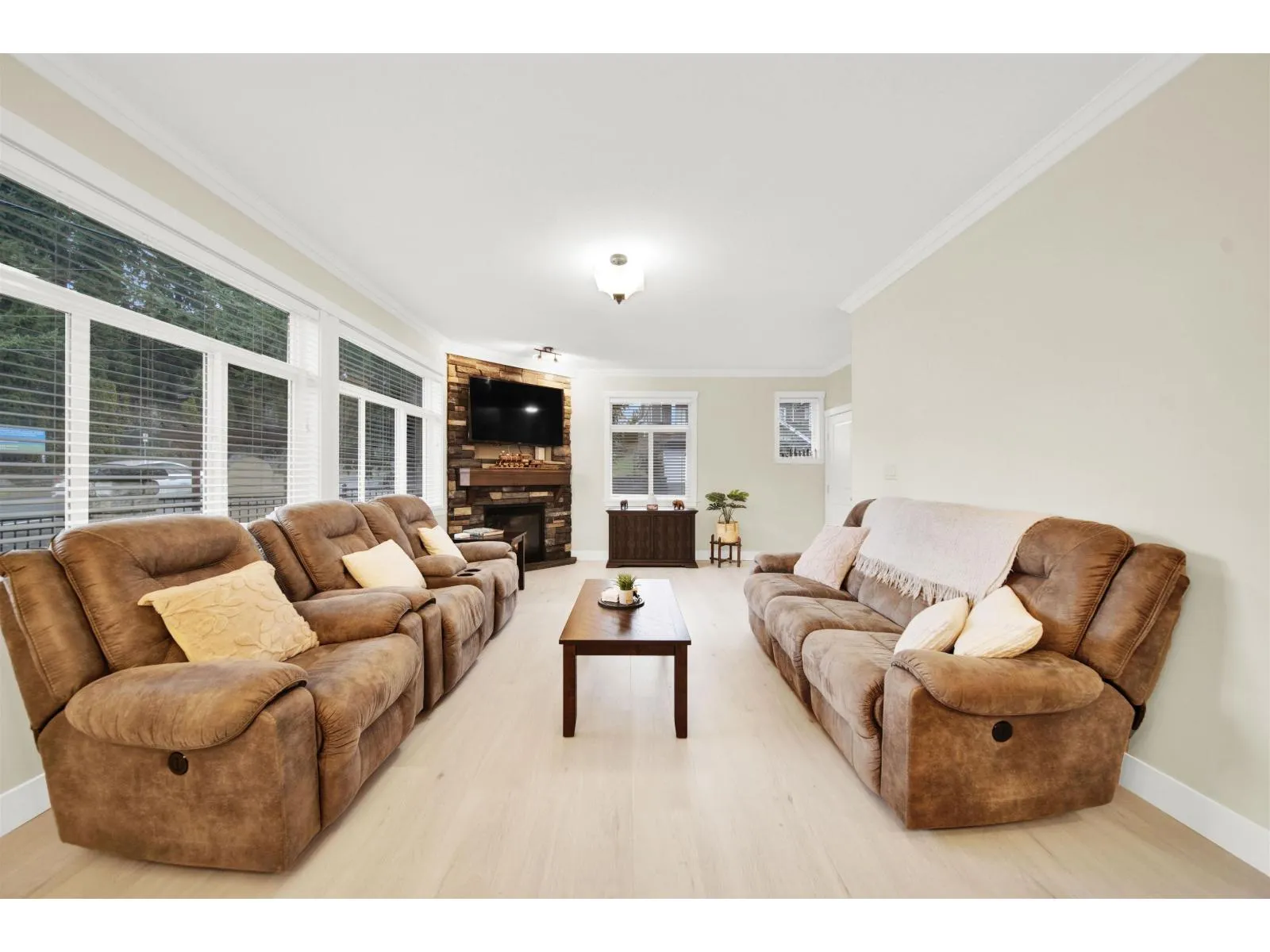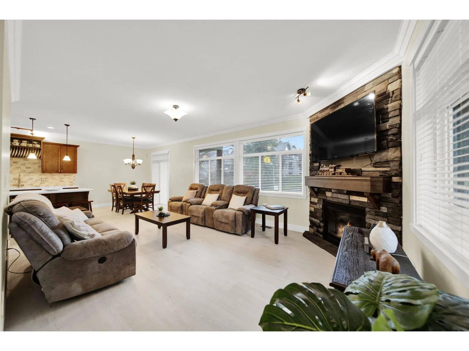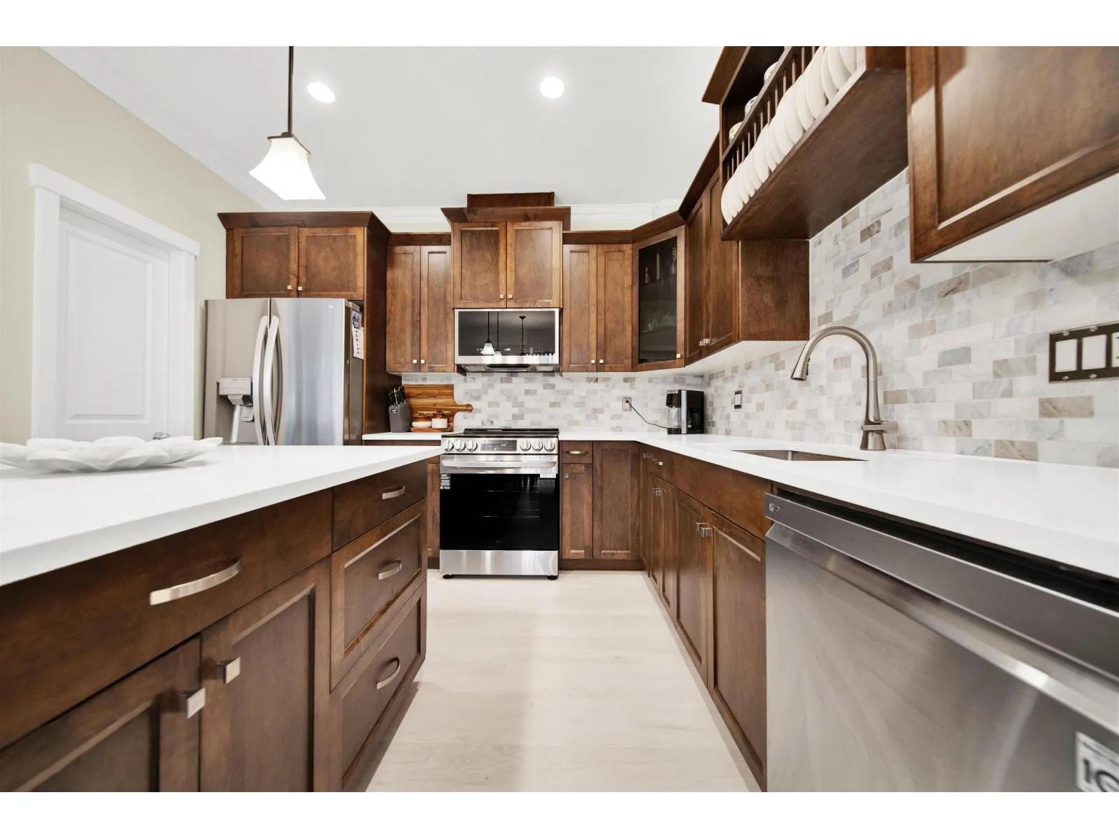 Hate the "townhome feel"? This END-UNIT delivers detached-style living: 4 brdm, 4 bath, 2,411 sq ft, double side-by-side garage & central A/C. Refreshed where it matters: quartz kitchen with marble-tile backsplash, matching quartz baths, new stove, washer/dryer & hot water tank, plus new laminate in the living rm + bsmt. Curl up by the cozy gas fireplace, then step out to your private fenced yard + patio. Primary brdm feels like a retreat with WIC, full ensuite & its own covered deck. Big secondary brdms too! Finished flex rm down can be a huge 4th brdm option (no closet). Location is the cheat code: 5 mins to rec centre, Save-On & Walmart, 10 to Costco + US border, and all school levels under 5 mins. Set in a small boutique complex where neighbours become your extended family & friends. Pet-friendly (dogs & cats). (id:27476)