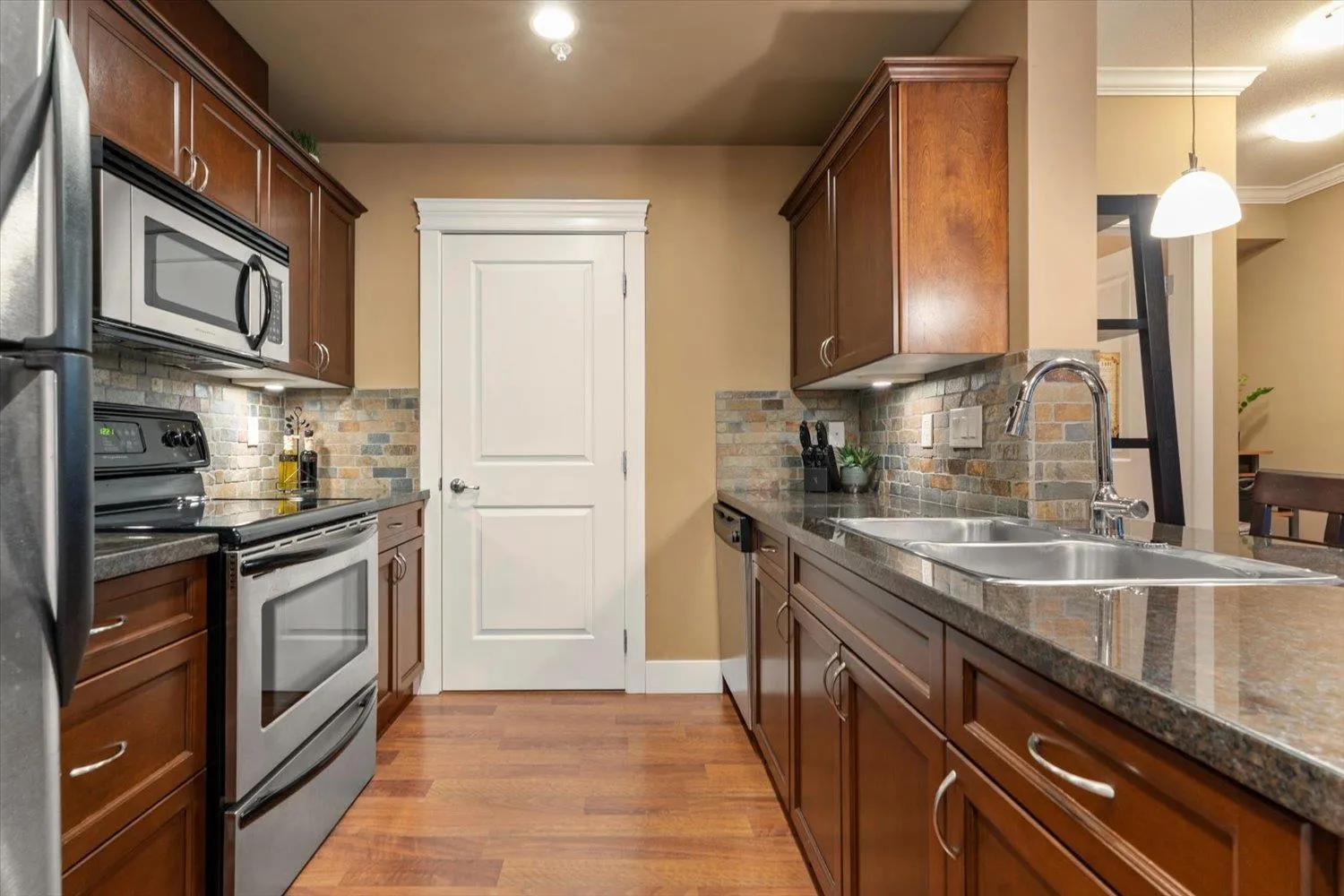 Welcome home to The Sterling. This home is in immaculate condition and features 2 bedrooms plus a den, 2 bathrooms, 2 parking stalls, and a storage locker. The open kitchen features shaker style cabinets, stainless appliances, tile backsplash, granite counters, and an eating area. Other quality features include a spacious living room with cozy fireplace, a private north facing balcony, 4 piece main bathroom, and in-suite laundry. The primary bedroom includes a full ensuite and plenty of closet space. This home is in a great central location close to all levels of schools, the hospital, shopping, and walking distance to many amenities. This complex also includes EV charging, a car wash area, and bike room. Pet friendly and rentals are allowed. Call today to view this home! (id:27476)