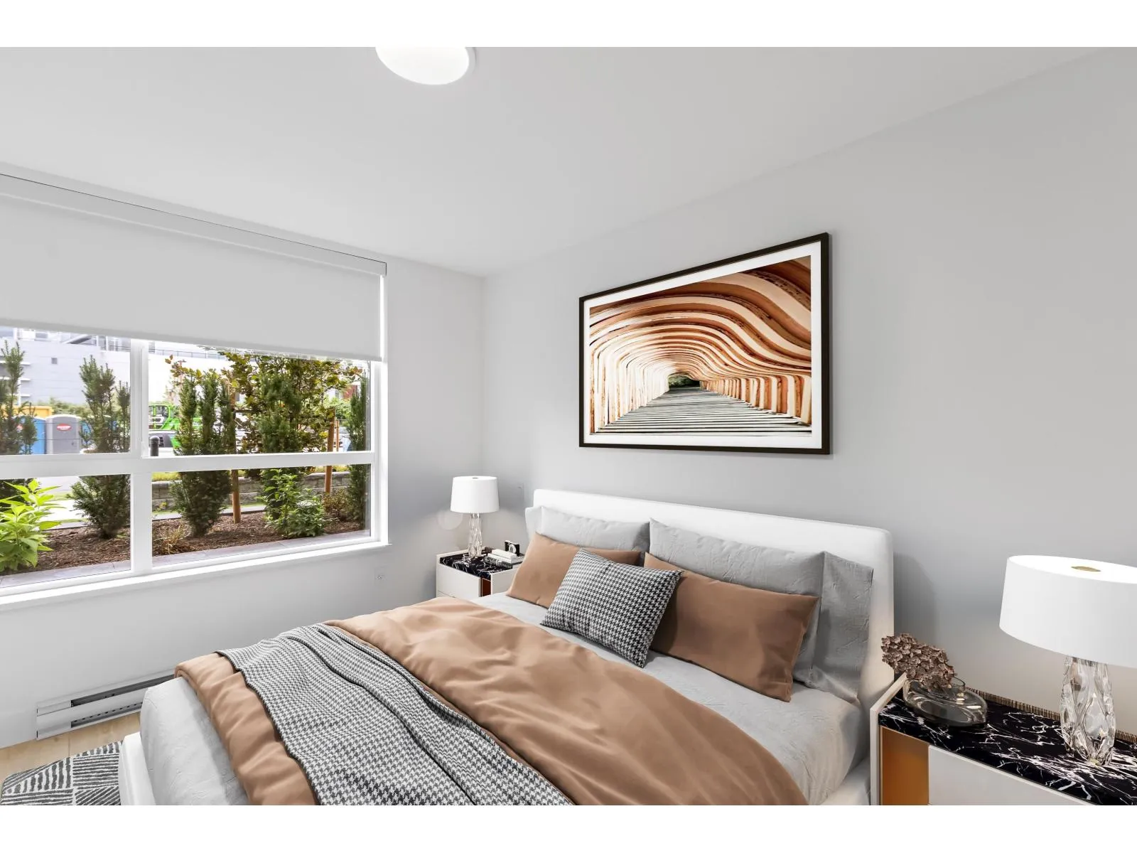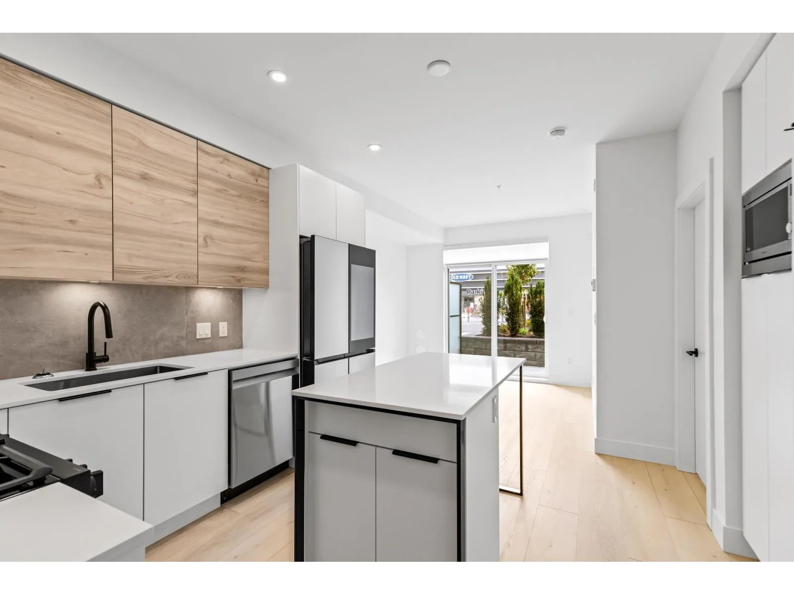 GARDEN WALKOUT OASIS! Welcome home to a stunning, newly built & move-in ready ground level home in highly anticipated HIGHSTREET VILLAGE. Rare chance to skip the presale process, enjoy your home today. SPACE! Spacious, functional 602t home boasts 9ft ceilings, bright+airy living, 1 bedroom w/expansive walk-in closet & functional den/office/nursery, dream kitchen, built-in storage solutions. CONVENIENCE! Step onto your patio, into town without the elevator. Enjoy green backdrop throughout! QUALITY! Luxury built by AB Wall Group, w/2-5-10 warranty. Bonus huge storage locker aside parking. LOCATION! Incredible position in Abbotsford's most Westerly setting minutes to Langley. WALKSCORE! Steps to Highstreet Shopping Mall, restaurants, daycare, at foot of the HWY! Airport a few minutes away! (id:27476)