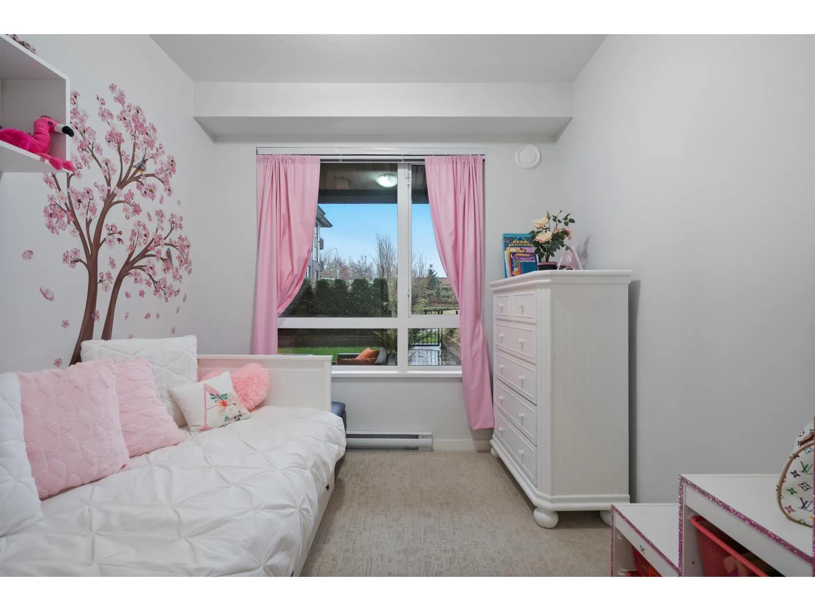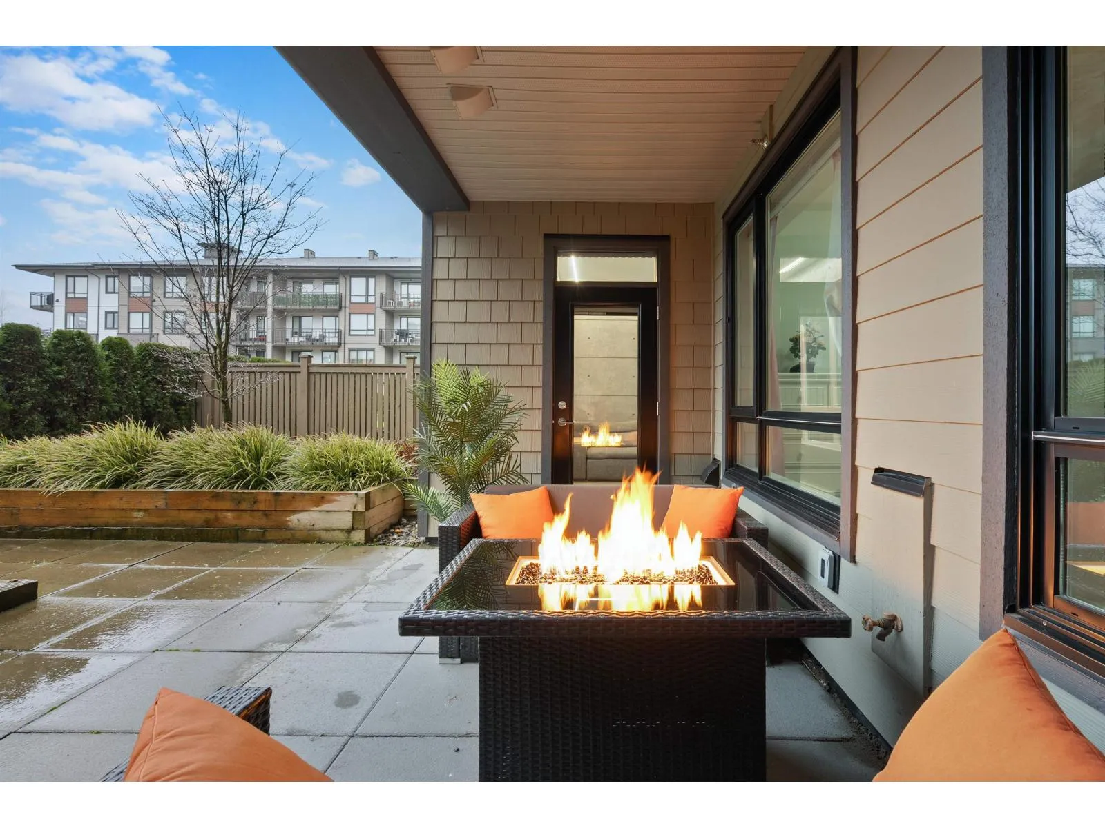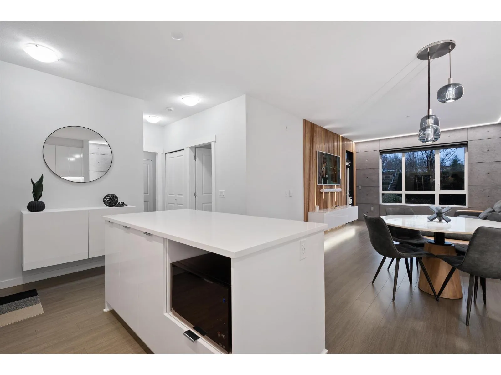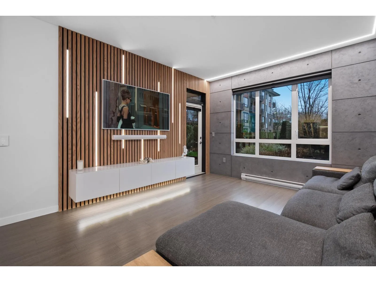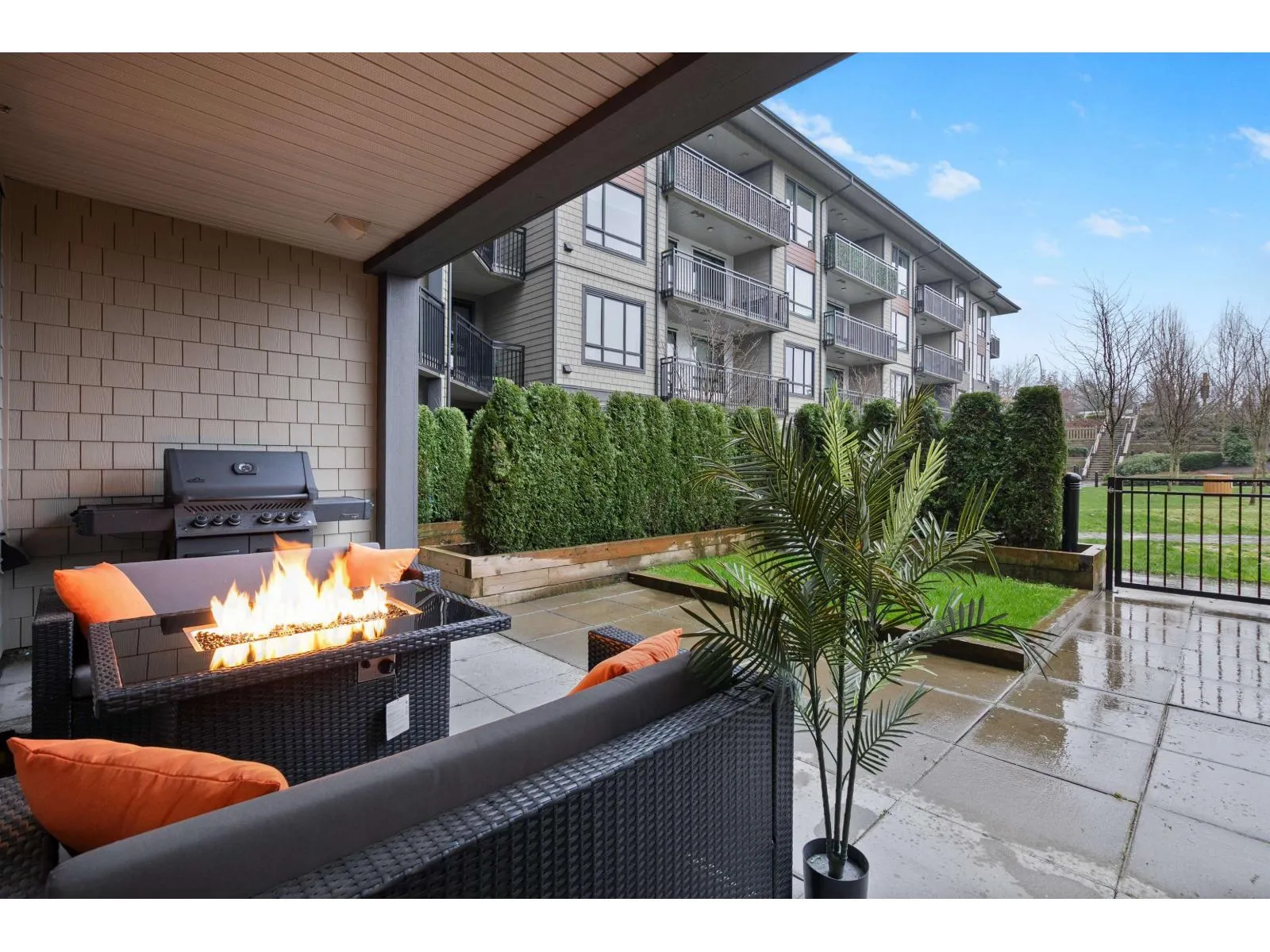 One of the finest condos Abbotsford has to offer. 2 bed 2 bath. This modern & unique ground floor unit has been extensively upgraded & finished to a level worthy of an architectural magazine feature. Showcasing spectacular details including a custom wood-slat living room feature wall, microcement accents, LED lighting throughout the living & kitchen areas, premium blinds, sleek wall mounted cabinetry and more. The private, south facing patio is perfect for summer entertaining and seamless indoor-outdoor living. Located in Elmstone by Polygon, built in 2021, a community renowned for quality construction & thoughtful design. Residents enjoy Club West's Resort Style amenities: outdoor pool, hot tub, party room, fitness centre, guest suite, theatre, hockey room etc. Open house Sat & Sun, 2-4m (id:27476)