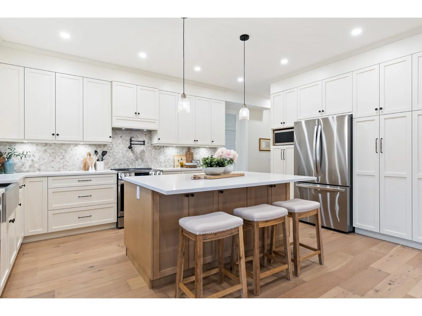 Nearly new & NO GST w/ WARRANTY, custom home in Aberdeen's Pepin Brook designed by a veteran home designer for his family: uncompromising quality throughout. Private 8,220sqft corner lot, 6Bed 5Bath, 5,075 sqft home has 3 levels, 2 Bed Daylight Suite & Office w/ separate entrance. Refined interiors: HARDWOOD FLOORS, CENTRAL A/C, ON DEMAND H/WT, SECURITY CAMERAS, B/I VACUUM and the list goes on. Main floor has a dreamy kitchen w/ large island, W/I PANTRY & covered wrap-around deck. Above a stunning primary bedroom w/ spa ensuite, SOAKER TUB & W/I CLOSET, 2nd bedroom w/ ensuite, a 3rd bedroom and large vaulted REC ROOM. Below a 1,780 sqft bright suite w/ its own yard and entrance. Minutes to Hwy 1, Fraser Hwy, Airport, Highstreet, parks and great schools. Must see video tour & in person! WOW (id:27476)