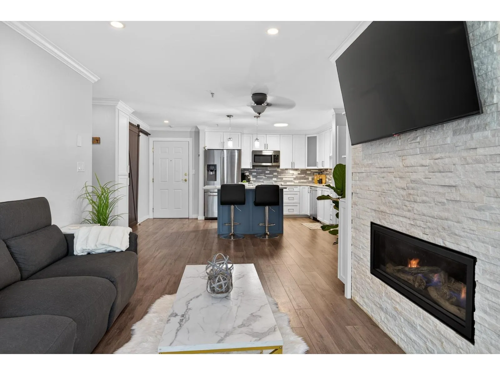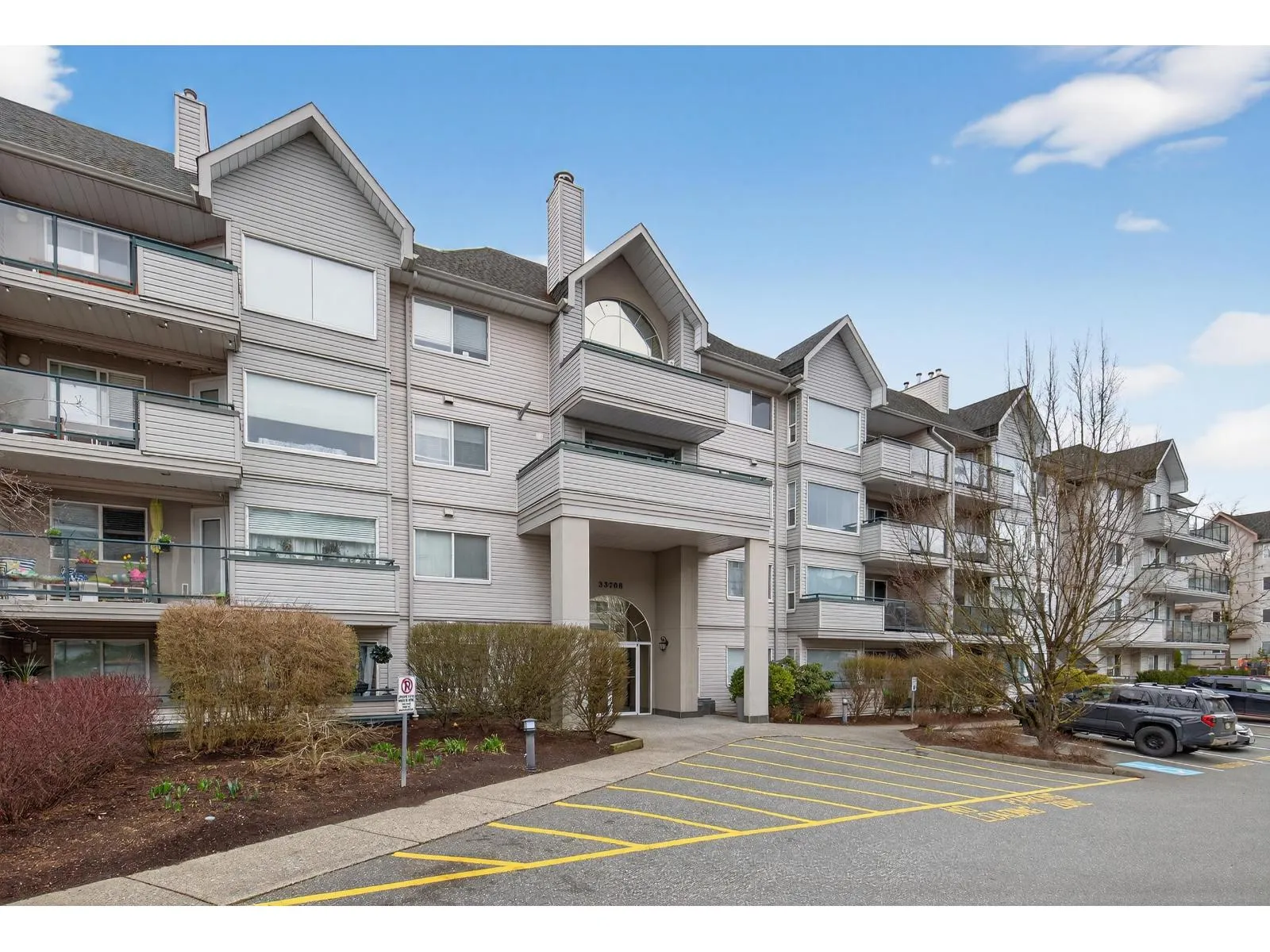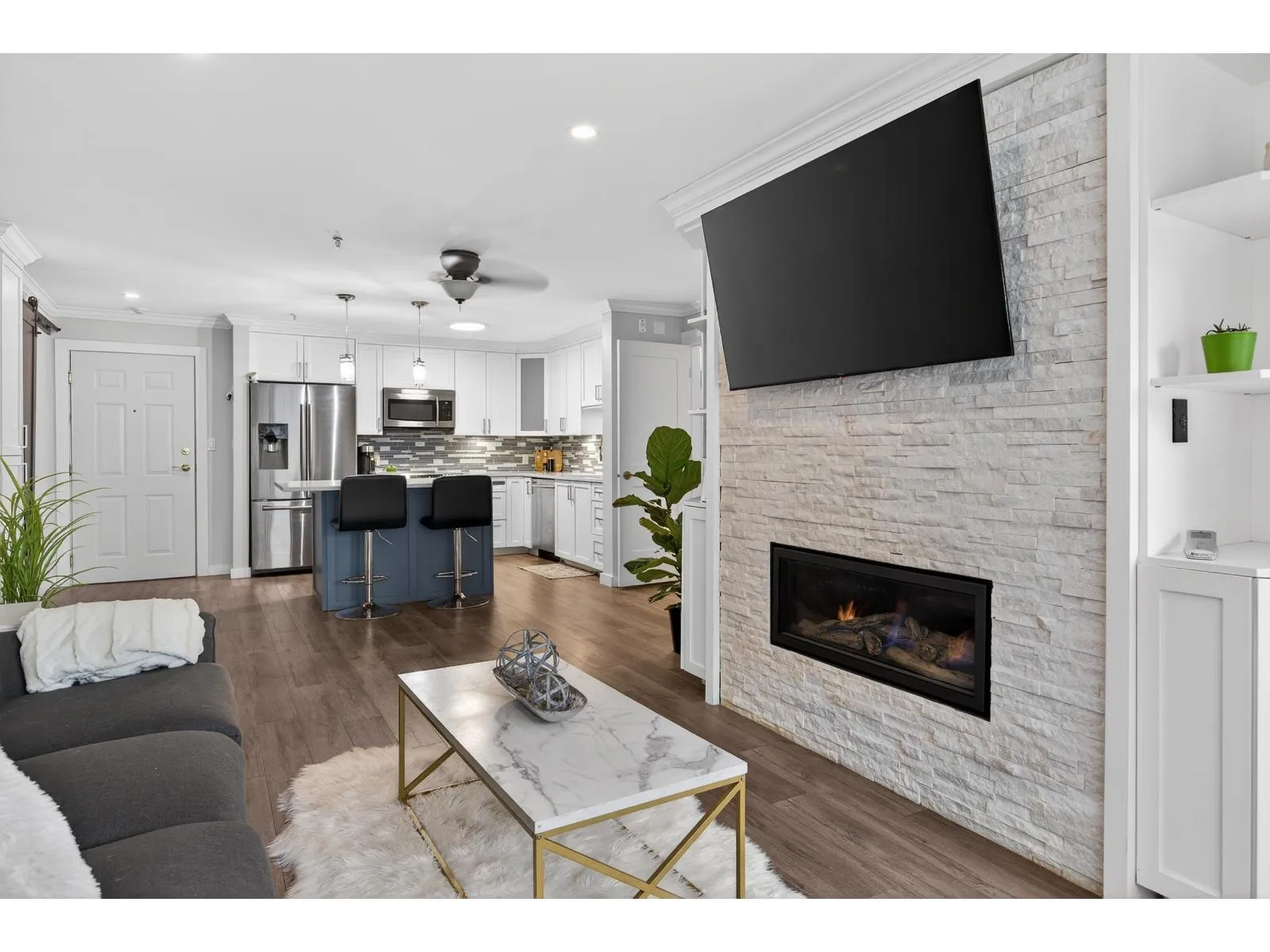 OPPORTUNITY AWAITS! This TWO bedroom TWO bathroom updated condo is move in ready. Just a short walk to the University of the Fraser Valley and close to Abbotsford Centre, public transit, shopping and dining. Updated white kitchen with quartz counters, large island and stainless appliances. The living room with LINEAR GAS FIREPLACE opens to a large sundeck flanked by beautiful rhodos. The primary bedroom includes a walk-through closet and 4 pc ensuite. Enjoy the convenience of an in-suite laundry room with storage. 2 PETS WITH NO SIZE RESTRICTIONS. The building offers great amenities-fitness room, guest suite, and a social lounge. An incredible opportunity for singles, couples or two friends. (id:27476)