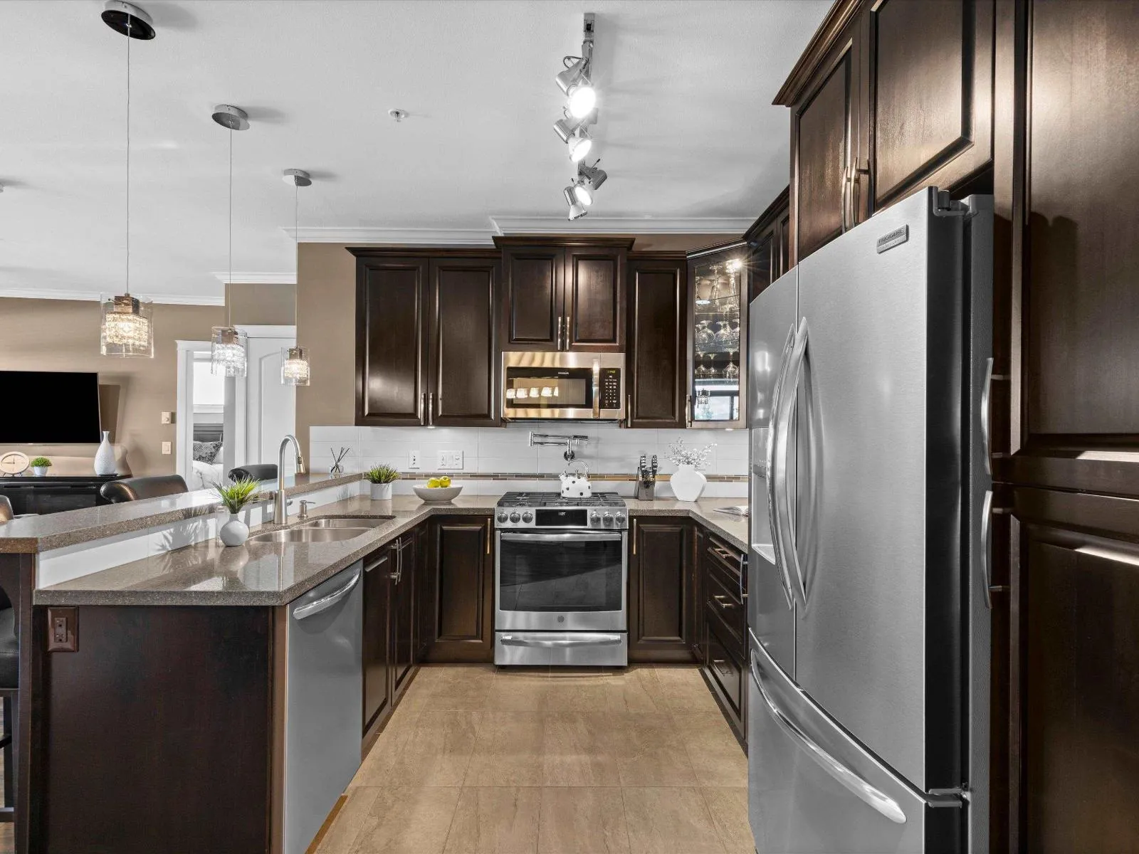 Step into refined living at La Galleria, Abbotsford's premier luxury mid-rise condo community. This stunning upper-level corner residence offers exceptional north-facing mountain views and a bright open layout with 9' ceilings and elegant finishes throughout. The spacious 2 bed, 2 bath design features a luxurious primary suite with walk-in closet and spa-inspired ensuite with radiant in-floor heating. Enjoy year-round outdoor living in the fully enclosed Lumon solarium, seamlessly extending your living space. Designed for comfort with individually controlled heat pump heating and A/C, plus upgraded lighting. Includes 2 parking stalls and a storage locker. Residents enjoy a fitness centre, amenities room, all in a central location just minutes to shopping, dining, and services. (id:27476)