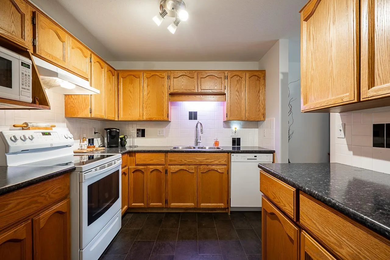 Amazing amount of Spacious Living in this Updated unit at the popular Central Heights 55+ building!~ Almost 1300sqft in this sunny, immaculate 2 bedroom + 2 bathroom home. Kitchen is large with plenty of cabinets + counter space. Covered South facing Balcony. Primary bedroom is HUGE, even space for a den! Extra huge laundry room, fits a freezer plus more! Extra Bonus is the additional storage room conveniently located at your doorstep. Additional storage locker in the UG parking. Great Unit perfect for downsizing. Updated Quartz +Vanities in both bathrms. Centrally Located with transit and Dr's across the street. Building offers an abundance of amenities to enjoy if desired---social dining area, exercise, crafts and games room, attached workshop and guest suites for visitors!~ (id:27476)