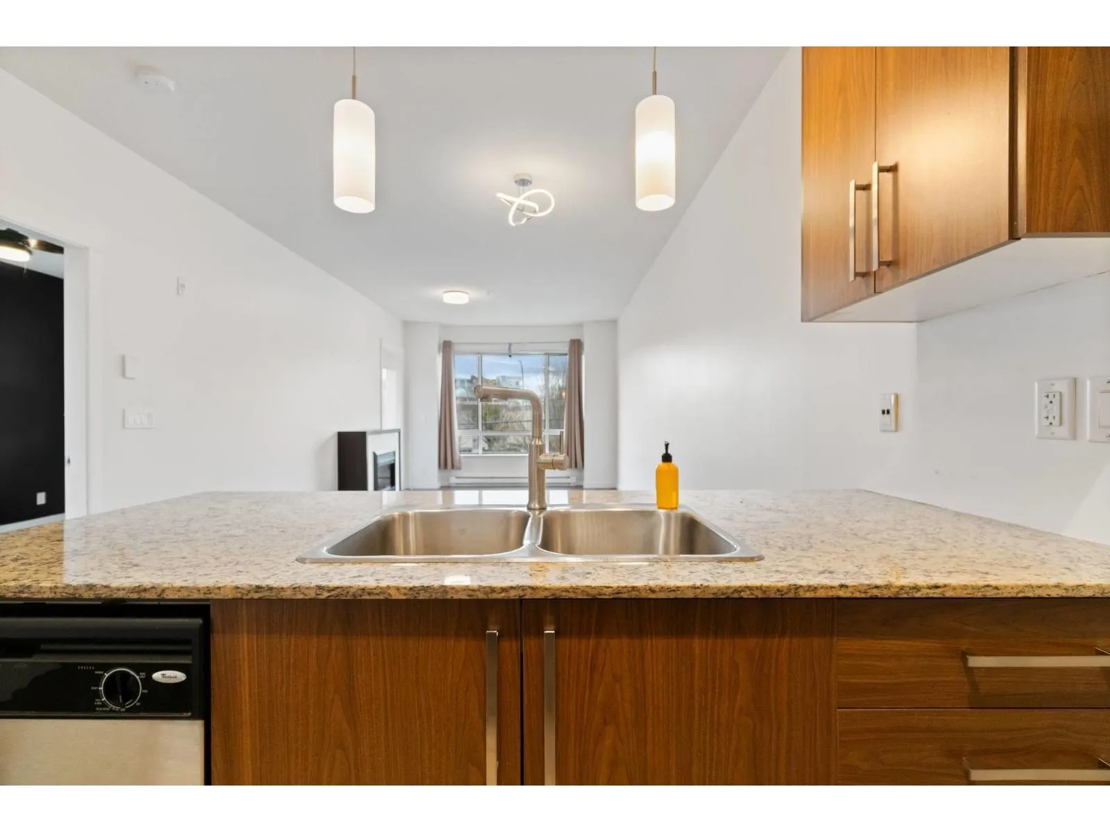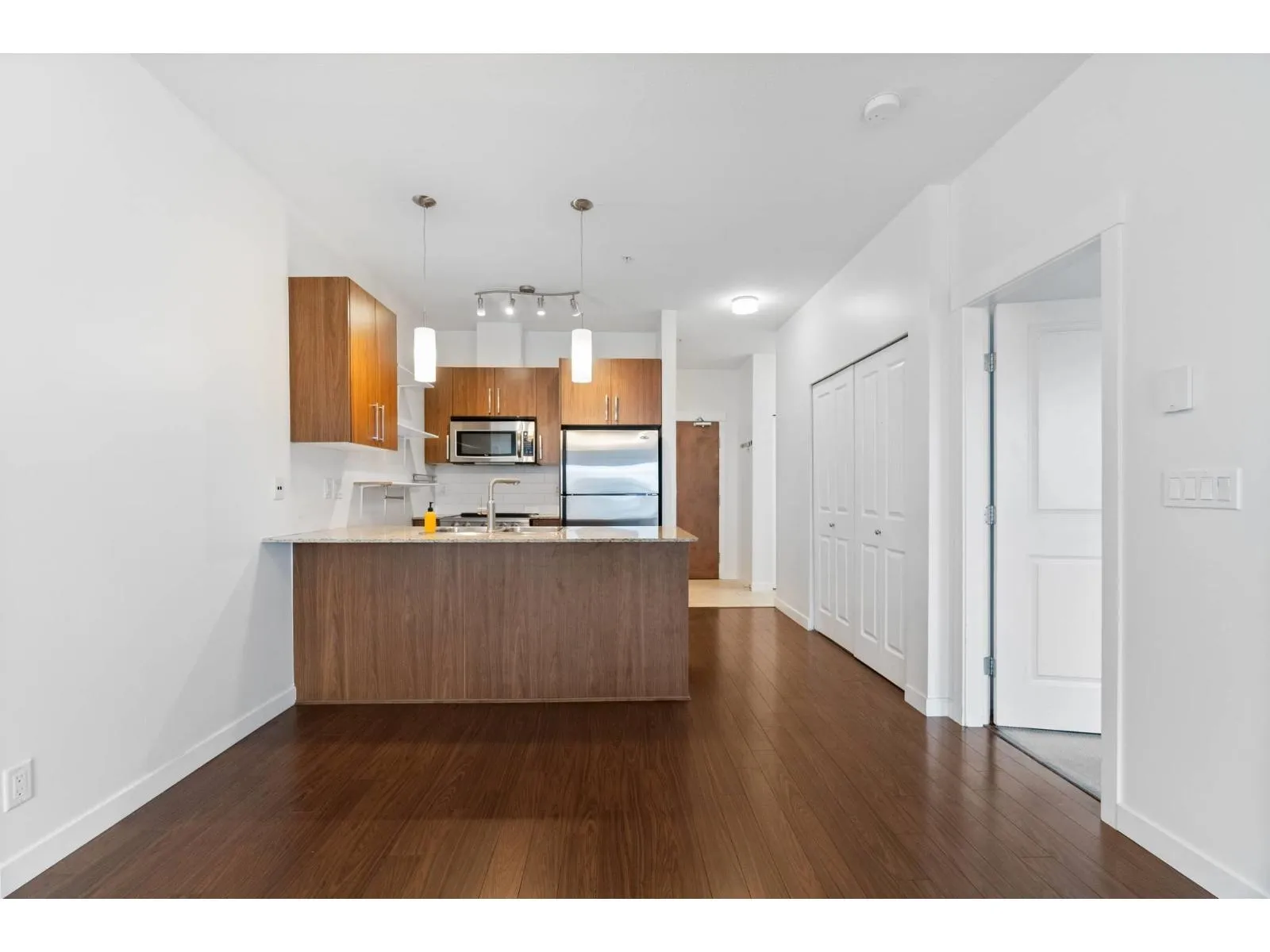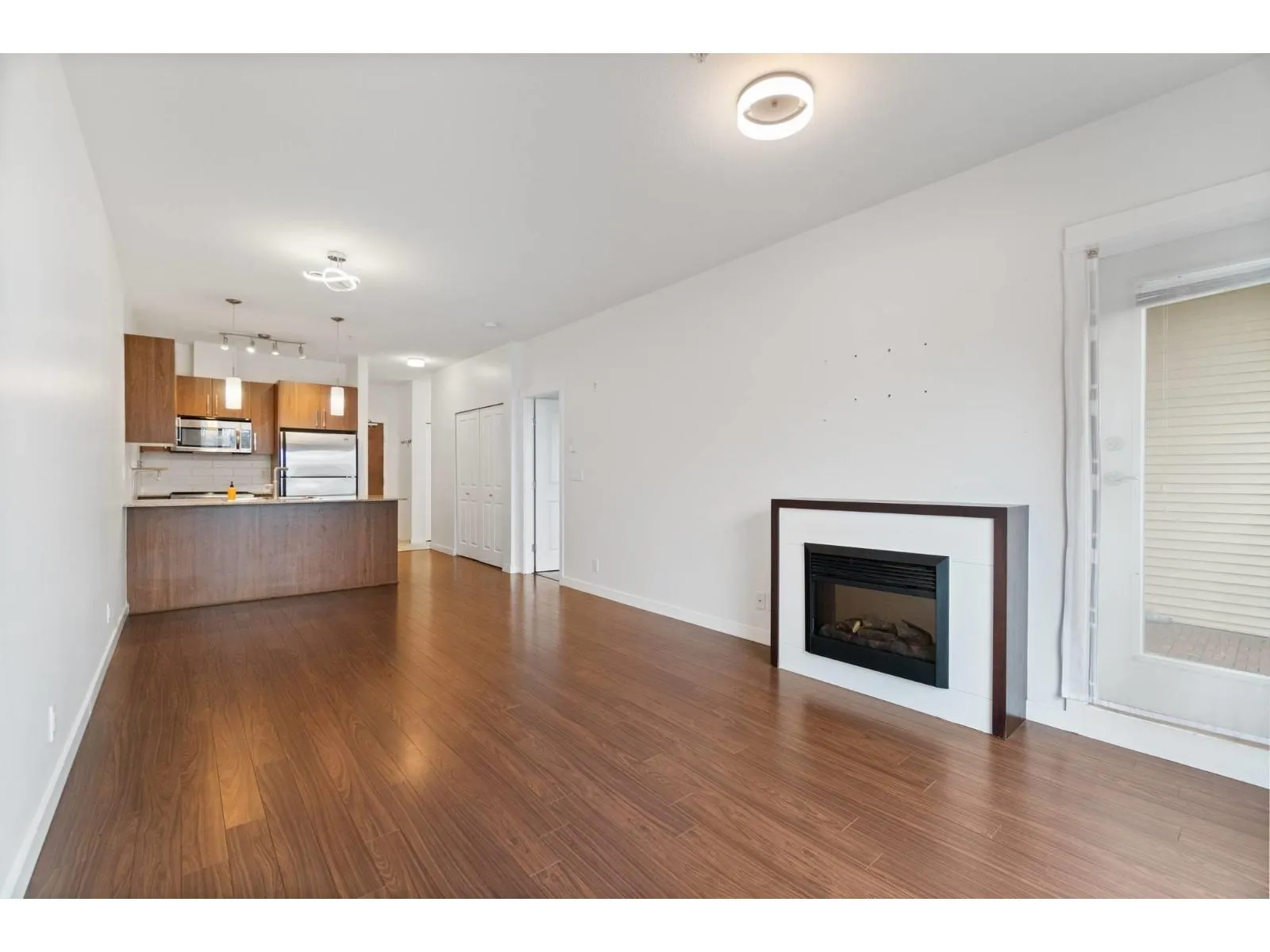 Welcome to the Edgebrook in Central Abbotsford! This beautiful movein ready 3rd floor, south-facing home offers 1 bedroom + den and 1 bathroom with a bright, functional layout. Features include 9-ft ceilings, laminate flooring, a versatile den/storage space, and kitchen with granite countertops and stainless steel appliances. The spacious bedroom includes a large walk-in closet, while the living room offers a cozy fireplace and space for a dining table, opening to a covered balcony. Fresh white paint and smart home updates add modern comfort. Located on a quiet cul-de-sac backing onto Horn Creek Park with peaceful walking trails. Large dogs allowed! Walk to shopping, restaurants, and schools. Low strata fees, well-run strata, & 1 parking spot make this a perfect starter home or investment! (id:27476)