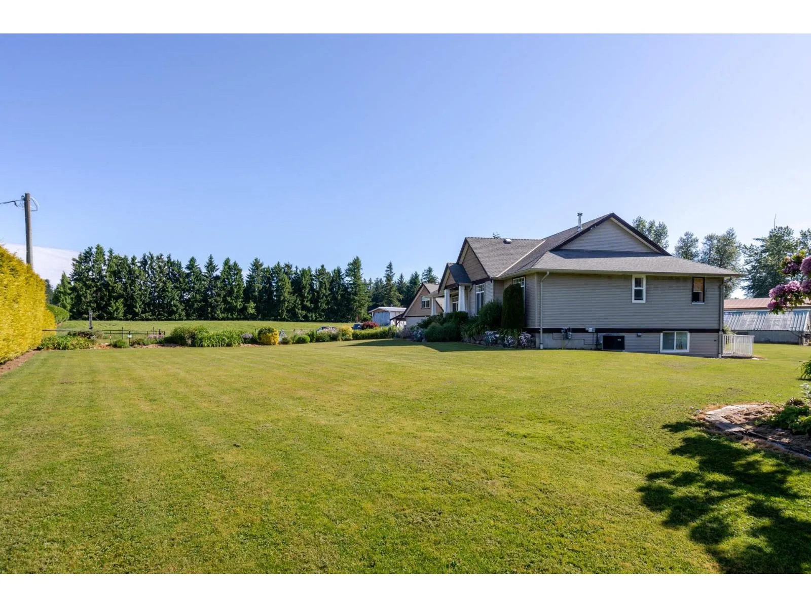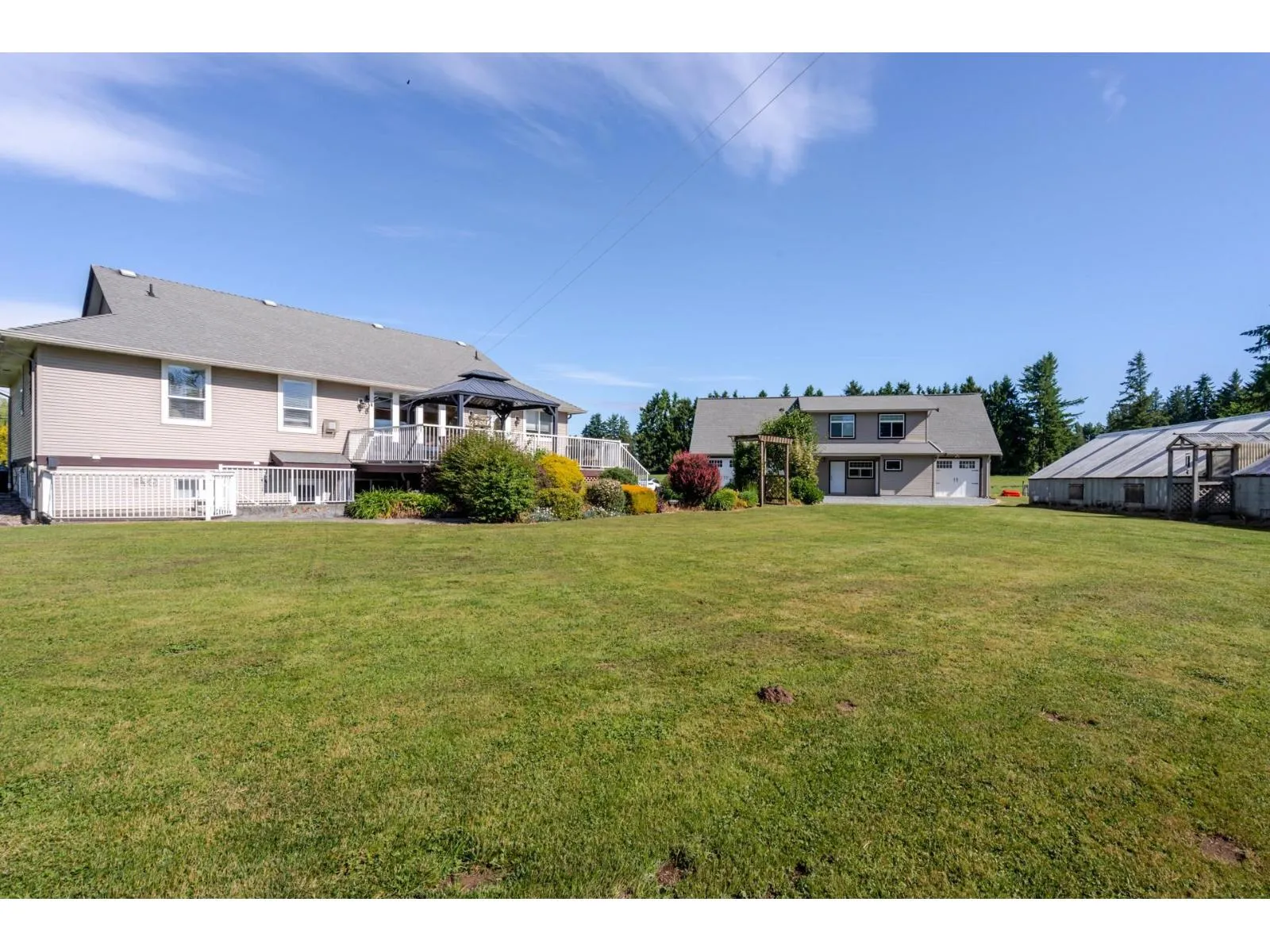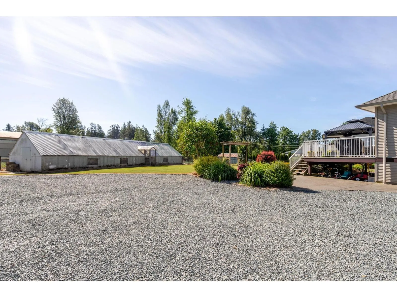 Don't miss out on this very desirable, gated 4.75 acre hobby farm in the heart of the Bradner Community. This well maintained property checks a lot of boxes! This charming country Rancher with a walk out basement includes a beautiful 1 bedroom suite. There is also a newer coach house/shop that features a very nice 2 bedroom self contained suite and a great workshop down below with a bonus bathroom. As well as a three bay garage and covered storage behind the shop and an RV covered storage building. Don't forget the greenhouse/chicken coop and extensive gardens around the property. The land is cleared and fenced and ready for your ideas. You won't be disappointed! (id:27476)
