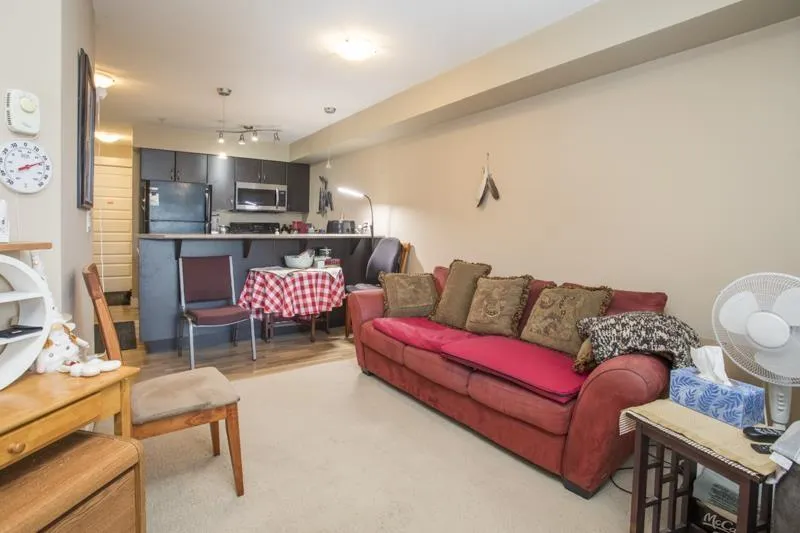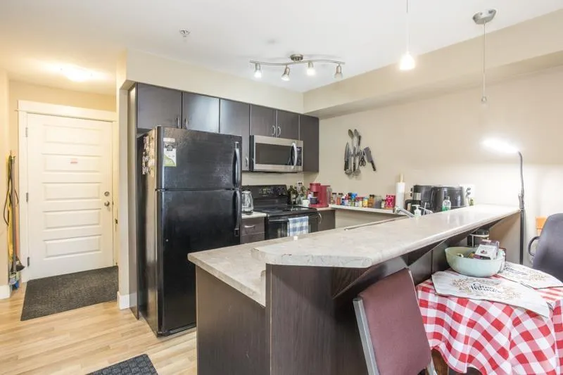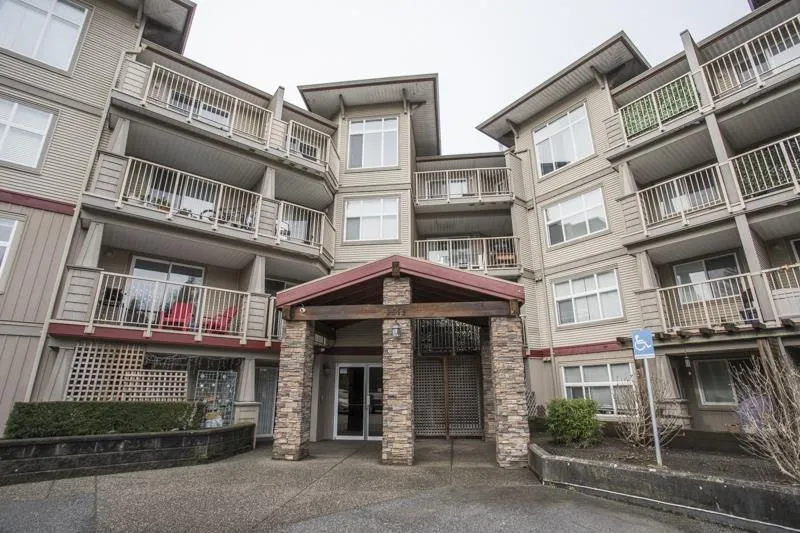 Welcome to Viva on Park, centrally located near downtown Abbotsford. This 1 bedroom plus flex den is tucked away on the quiet side of the building and features a private balcony. The open-concept layout offers a spacious kitchen with a convenient breakfast bar and dining area. The living room includes an electric fireplace, while the generously sized bedroom boasts large windows that fill the space with natural light. This unit also includes in-suite laundry, one parking stall, and a storage locker. Enjoy exceptional walk-ability to local shops, breweries, recreation facilities, skating rink. pool, fitness centre, and scenic hiking/ biking trails. Just minutes from the University of the Fraser Valley and access to the Mission Hwy. (id:27476)