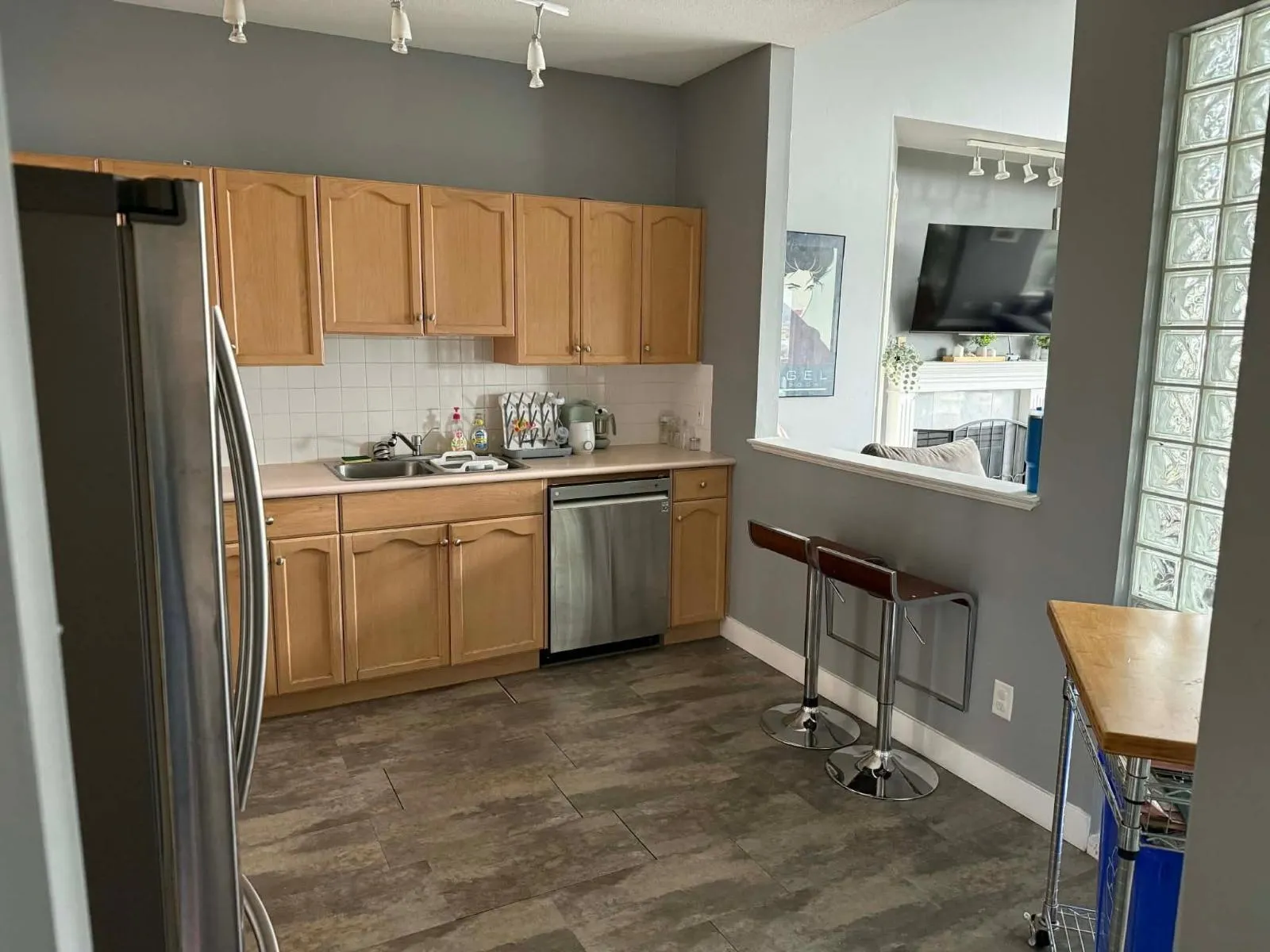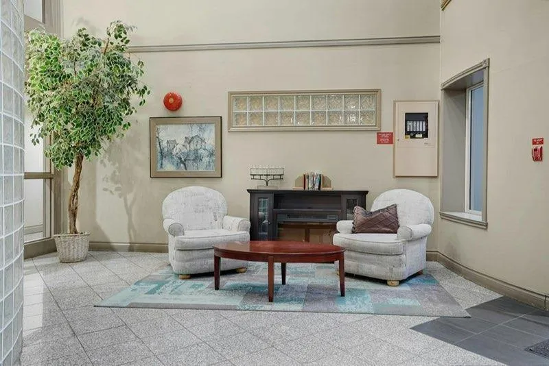 Welcome to The Maples! This bright and spacious top-floor corner unit offers 2 bedrooms and 2 bathrooms with desirable north-facing exposure and a private balcony. The living area features vaulted ceilings and large floor-to-ceiling windows, creating an open and airy space filled with natural light. The oversized primary bedroom easily accommodates a king-size bed and includes a generous walk-in closet. Enjoy the convenience of in-suite laundry, abundant cupboards, and excellent storage throughout. Located in a prime central location, just steps from Sevenoaks Mall, restaurants, public transit, and all levels of schools. Family and pet friendly building includes rec room and exercise area! (id:27476)