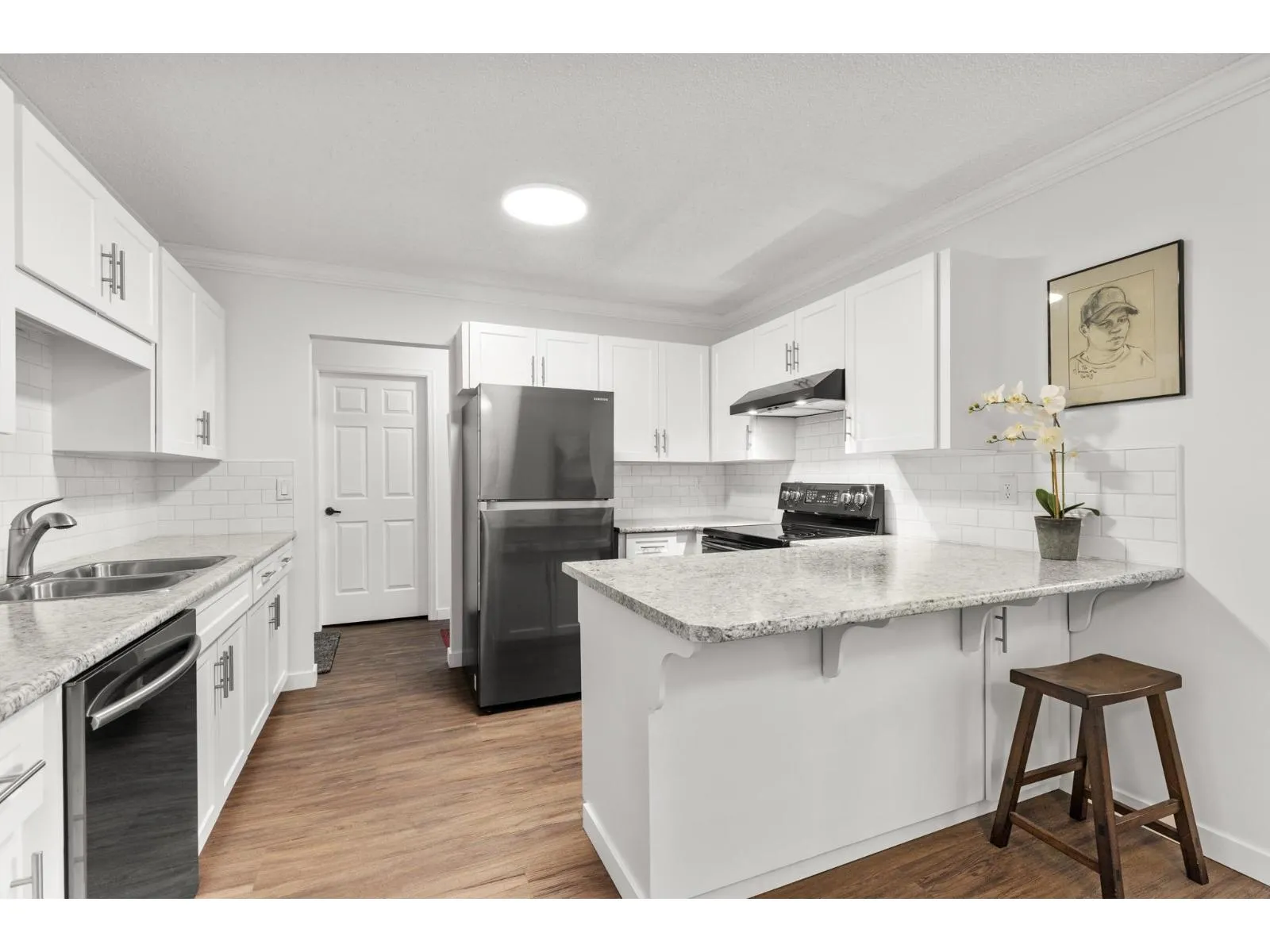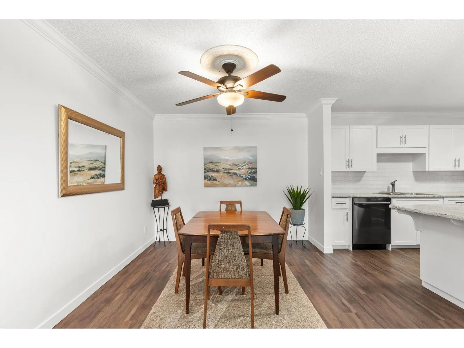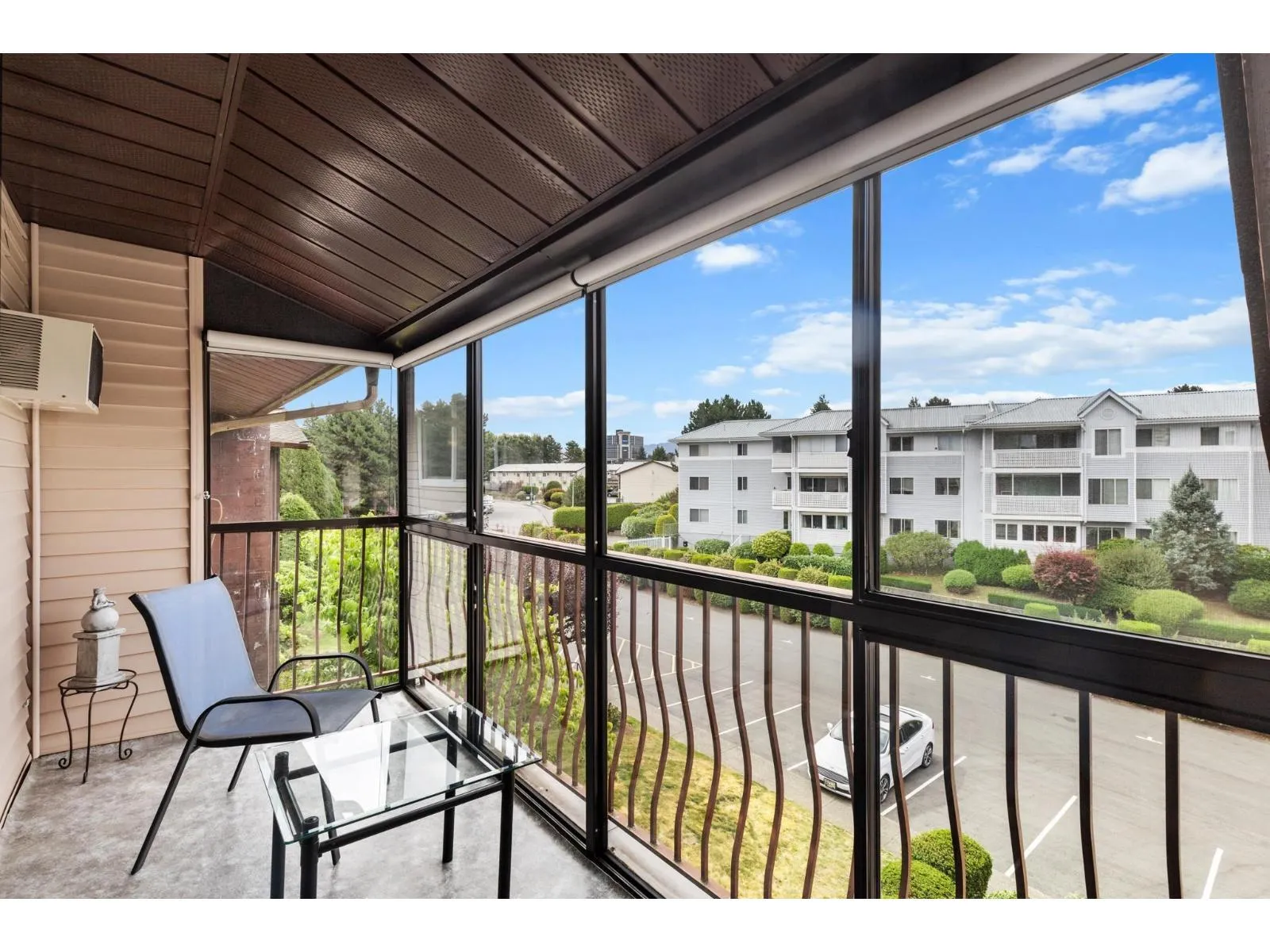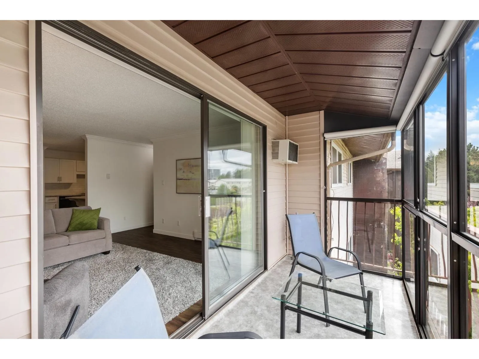 Welcome to a beautiful top floor condo in the heart of the city! Located at the end of a quiet cul de sac is this 2 bed home that has everything done for you such as vinyl plank floors, crown mouldings, white kitchen with black S/S appliances, subway tile splash & extra large peninsula, updated light fixtures, glassed in balcony w/ custom rolling blinds for year round enjoyment, convenient storage room off the balcony, generous laundry room w/ upper cabinets, spacious primary bedroom and recently renovated bath w/ huge tiled shower. New H/W heater. This home has even been freshly painted! There is also a storage locker only steps from the unit. Location here can't be beat. Park the car and walk to everything from shopping to dining, Mill Lake and more. Royal Oak is 55+, a well run strata. (id:27476)