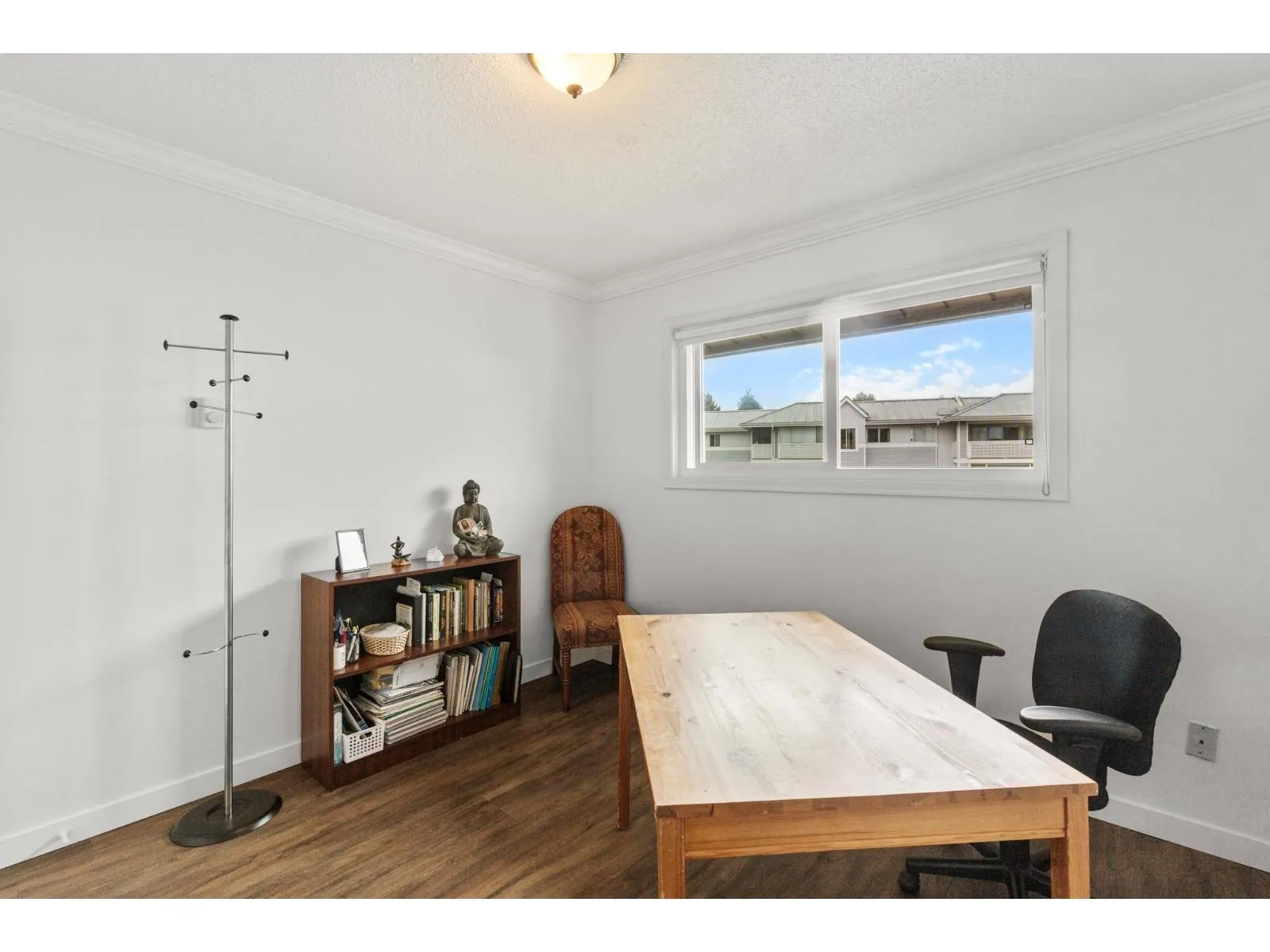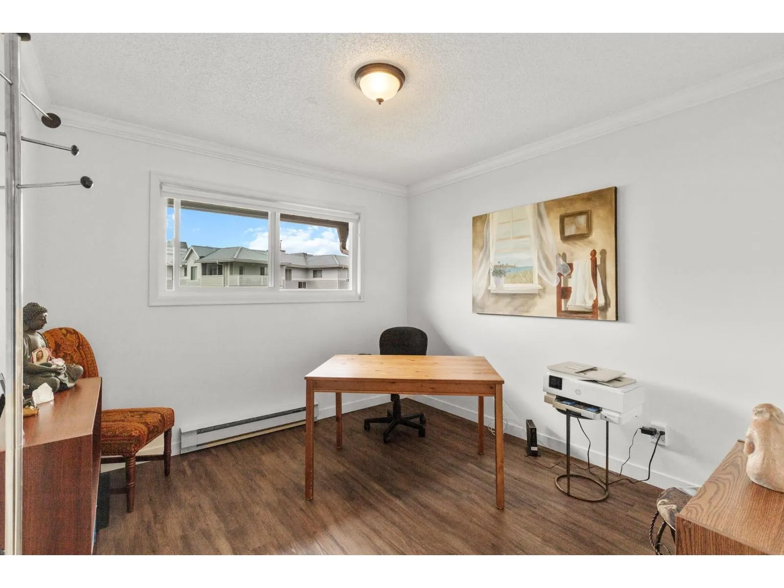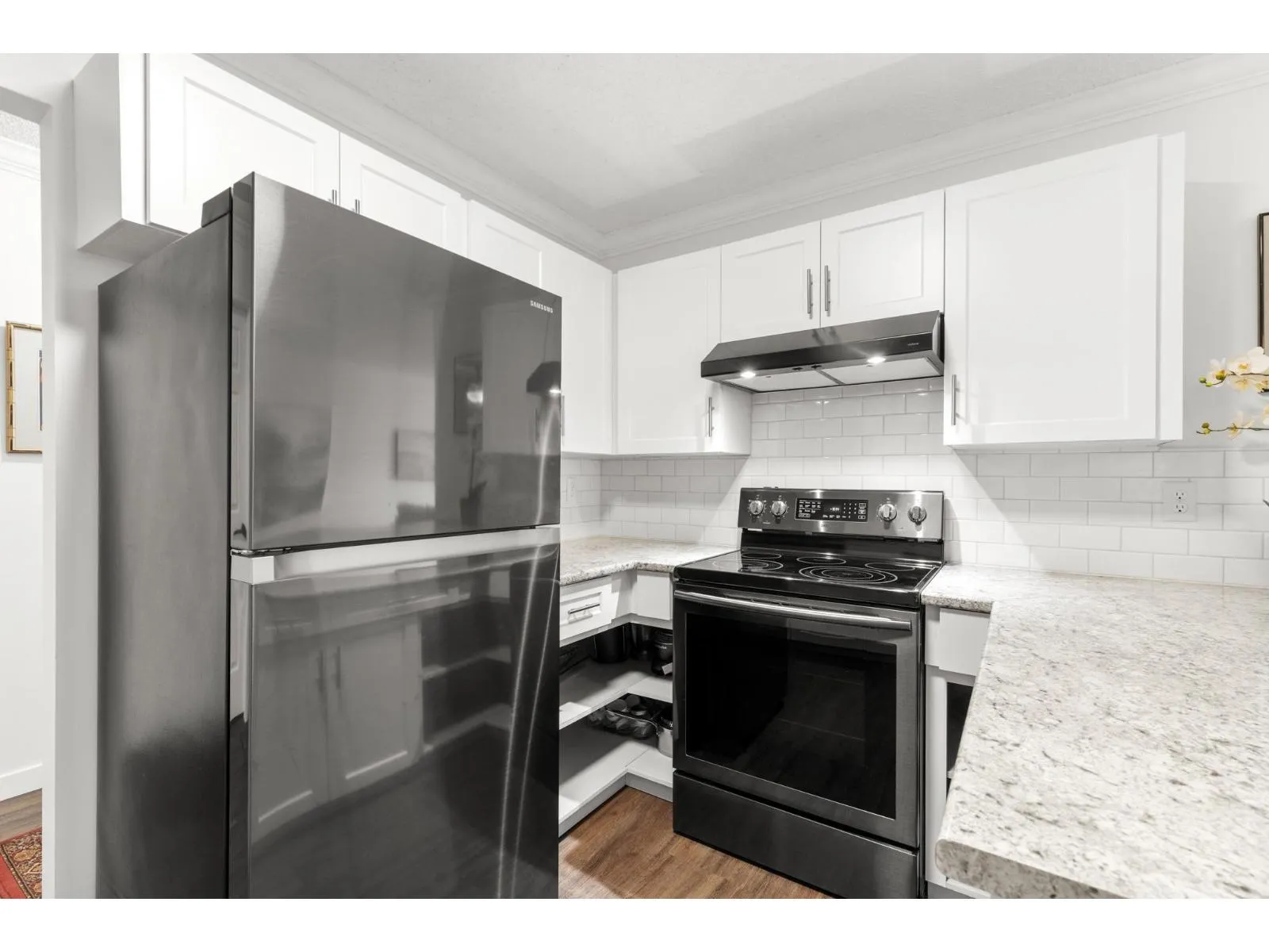 Welcome to a beautiful top floor condo in the heart of the city! Located at the end of a quiet cul de sac is this 2 bed home that has everything done for you such as vinyl plank floors, crown mouldings, white kitchen with black S/S appliances, subway tile splash & extra large peninsula, updated light fixtures, glassed in balcony w/ custom rolling blinds for year round enjoyment, convenient storage room off the balcony, generous laundry room w/ upper cabinets, spacious primary bedroom and recently renovated bath w/ huge tiled shower. New H/W heater. This home has even been freshly painted! There is also a storage locker only steps from the unit. Location here can't be beat. Park the car and walk to everything from shopping to dining, Mill Lake and more. Royal Oak is 55+, a well run strata. (id:27476)