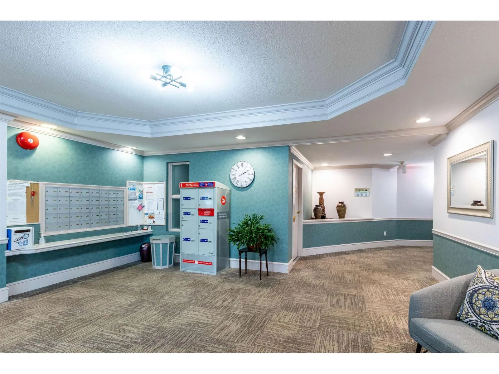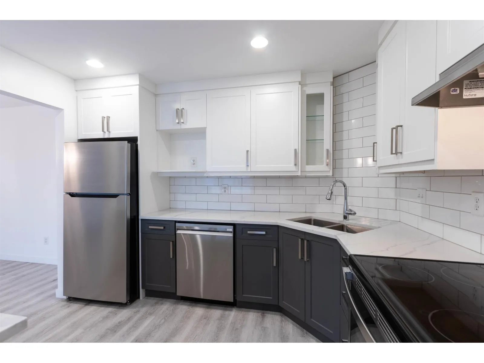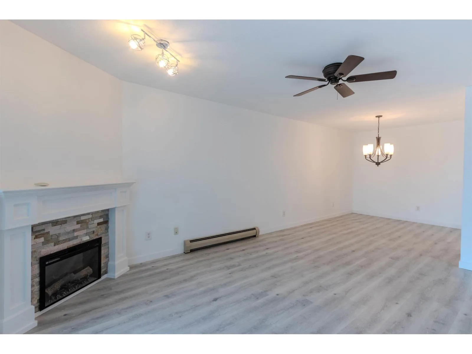 Outstanding renovations and outstanding location - across the street from Mill Lake & Seven Oak Mall! 1074 sq ft, 2 bdrm, 2 bath. Open living plan with white shaker custom kitchen, quartz countertops with undermount sink & eating bar, subway tile backsplash, undermount lighting, recessed ceiling lights, vinyl plank flooring thru-out moldings & trim, electric fireplace & ledgerock surround, light fixtures, levered door handles, complete bathroom renos with vanities, quartz, undermount sinks, tile surround, toilets, hardware- reno 5 years ago & shows newer.. Mstr bdrm with sliders to 24' x 7' enclosed deck (windows open) with N. Shore mtn views. Lots of storage space too! You can't get closer to Mill Lake & shopping. Great complex! Workshop, guest suite, storage on same floor. 55+, no pets. (id:27476)