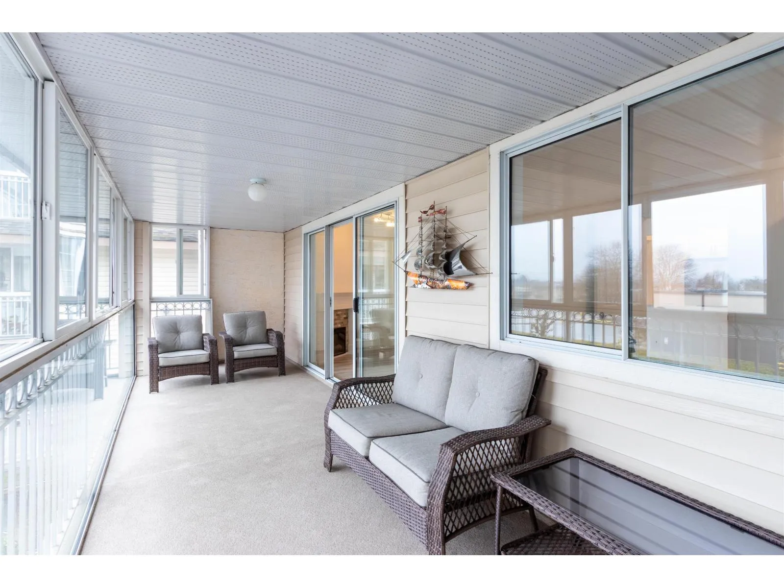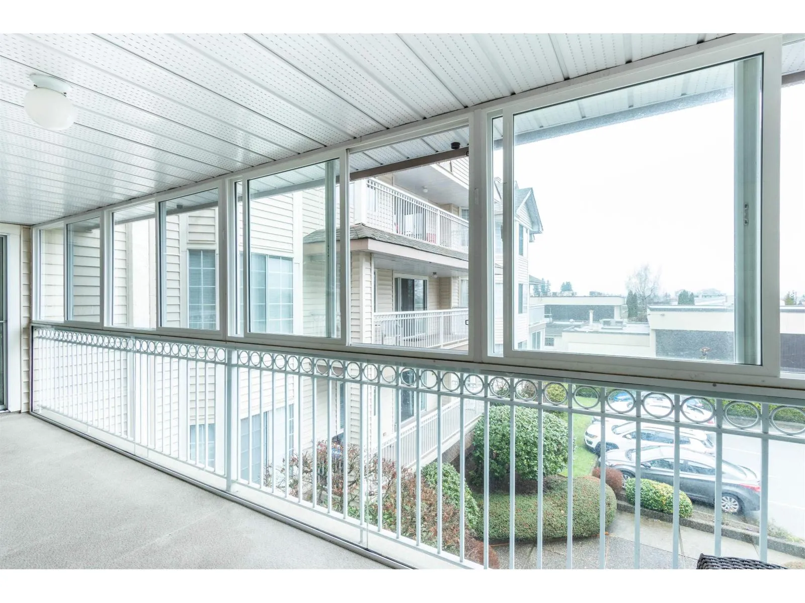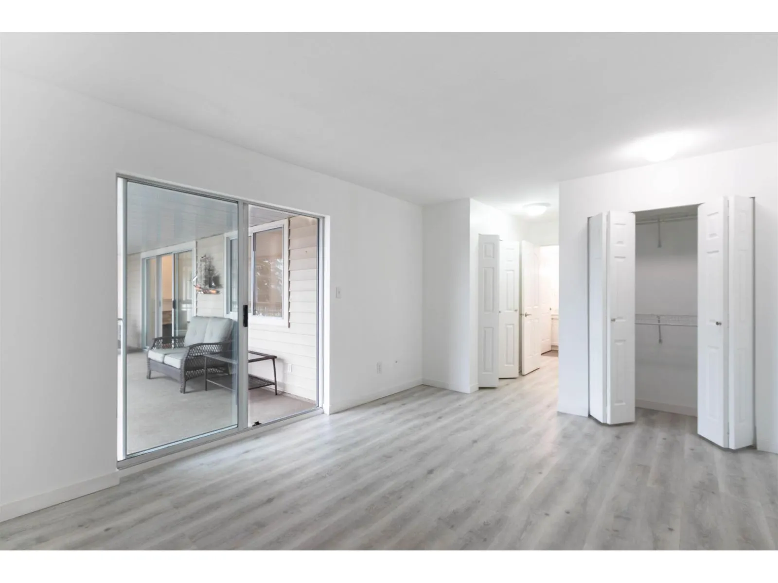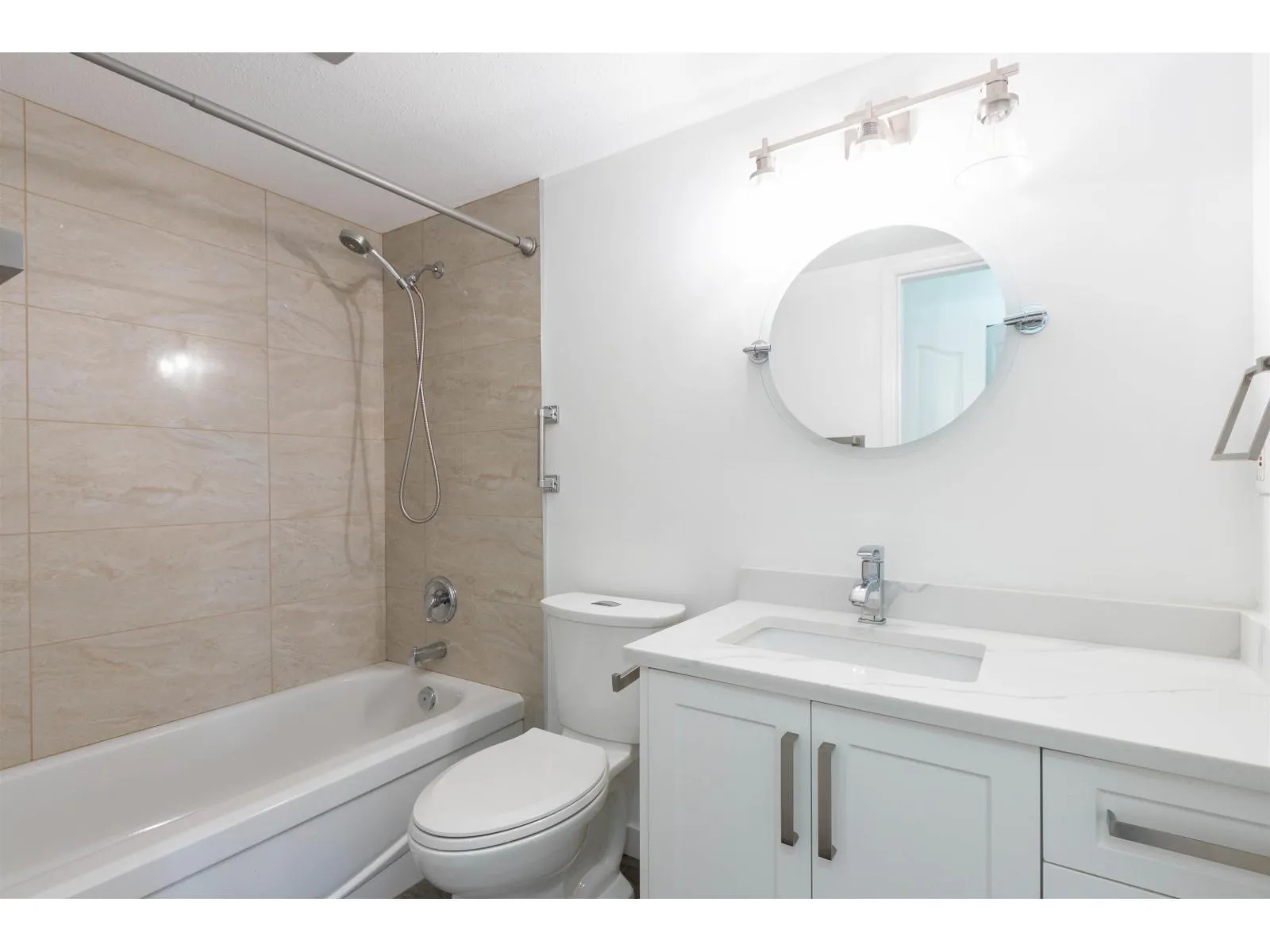 Outstanding renovations and outstanding location - across the street from Mill Lake & Seven Oak Mall! 1074 sq ft, 2 bdrm, 2 bath. Open living plan with white shaker custom kitchen, quartz countertops with undermount sink & eating bar, subway tile backsplash, undermount lighting, recessed ceiling lights, vinyl plank flooring thru-out moldings & trim, electric fireplace & ledgerock surround, light fixtures, levered door handles, complete bathroom renos with vanities, quartz, undermount sinks, tile surround, toilets, hardware- reno 5 years ago & shows newer.. Mstr bdrm with sliders to 24' x 7' enclosed deck (windows open) with N. Shore mtn views. Lots of storage space too! You can't get closer to Mill Lake & shopping. Great complex! Workshop, guest suite, storage on same floor. 55+, no pets. (id:27476)