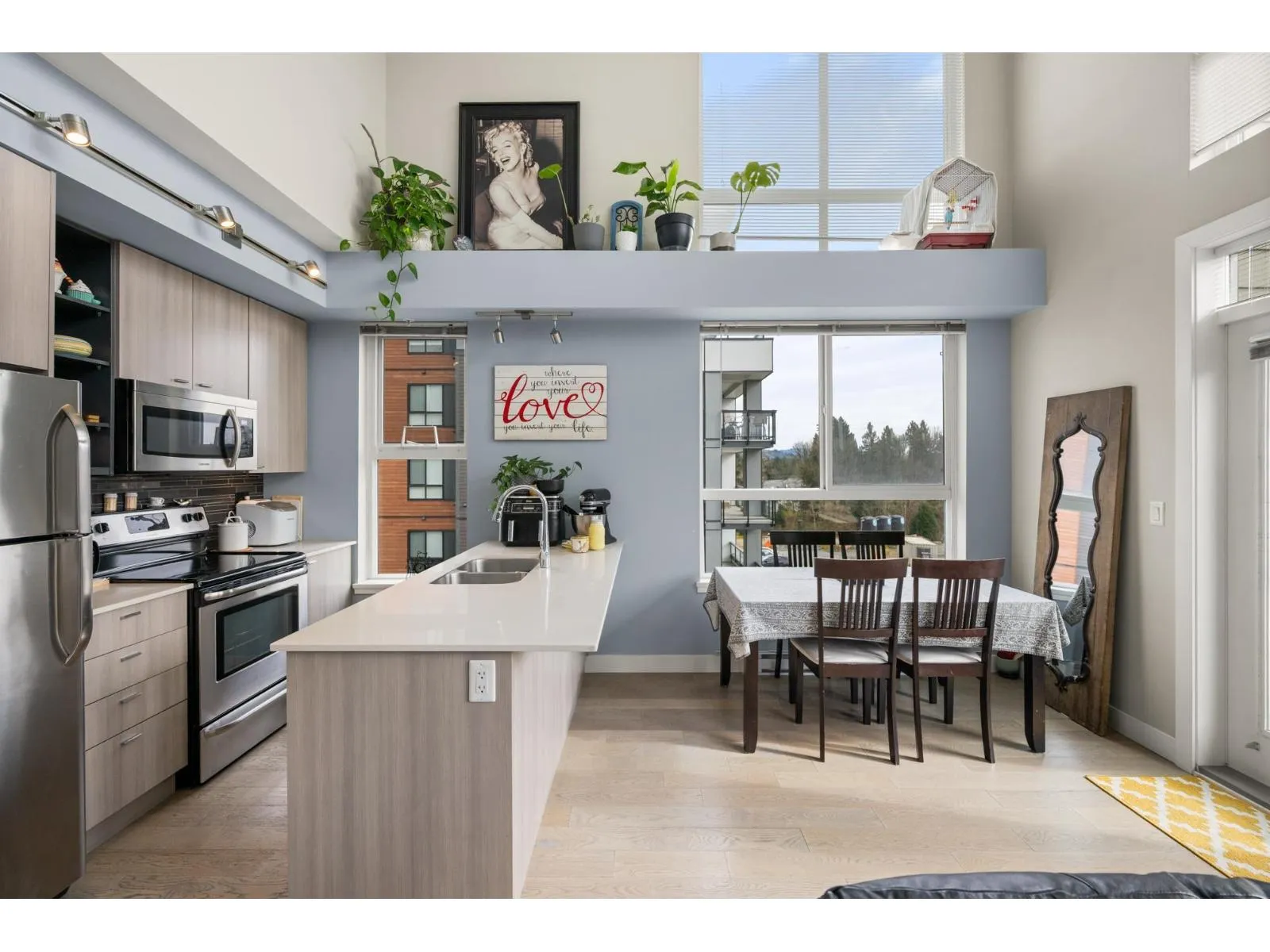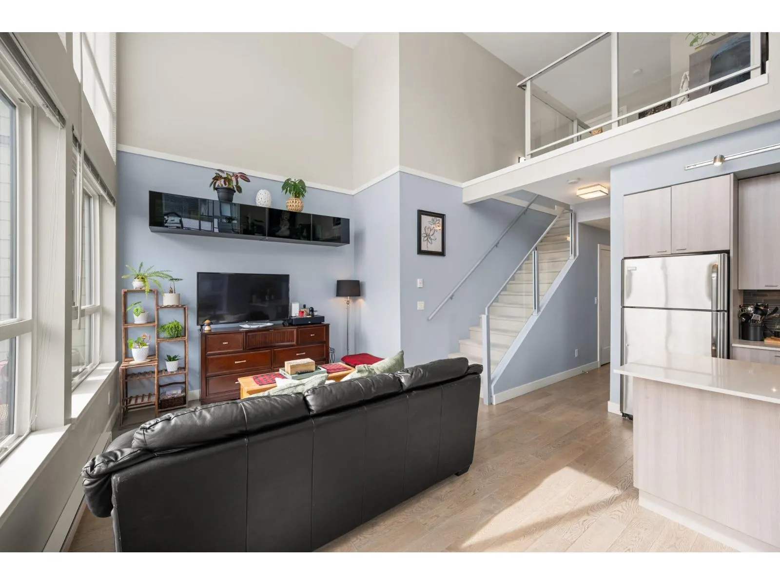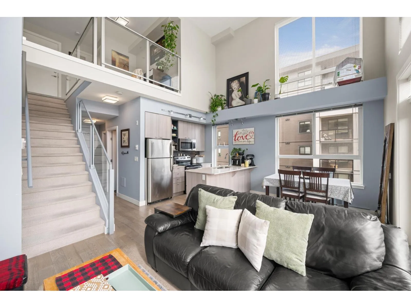 RARE CORNER LOFT UNIT!! Welcome to Hudson's Loft at Central Park Village, one of Abbotsford's most sought-after communities. This stunning 2 bedroom + den, 2 bath corner unit showcases 18' ceilings, floor-to-ceiling windows, and a bright south-facing patio that floods the space with natural light. The open loft design offers an airy, spacious feel, complemented by modern finishes, stainless steel appliances, and thoughtful design details throughout. Built in 2015 and surrounded by cafés, shops, and restaurants like Trading Post, Afterthoughts, Cora's, and Superstore, this home perfectly blends lifestyle, convenience, and style. Call today to book your private showing! (id:27476)