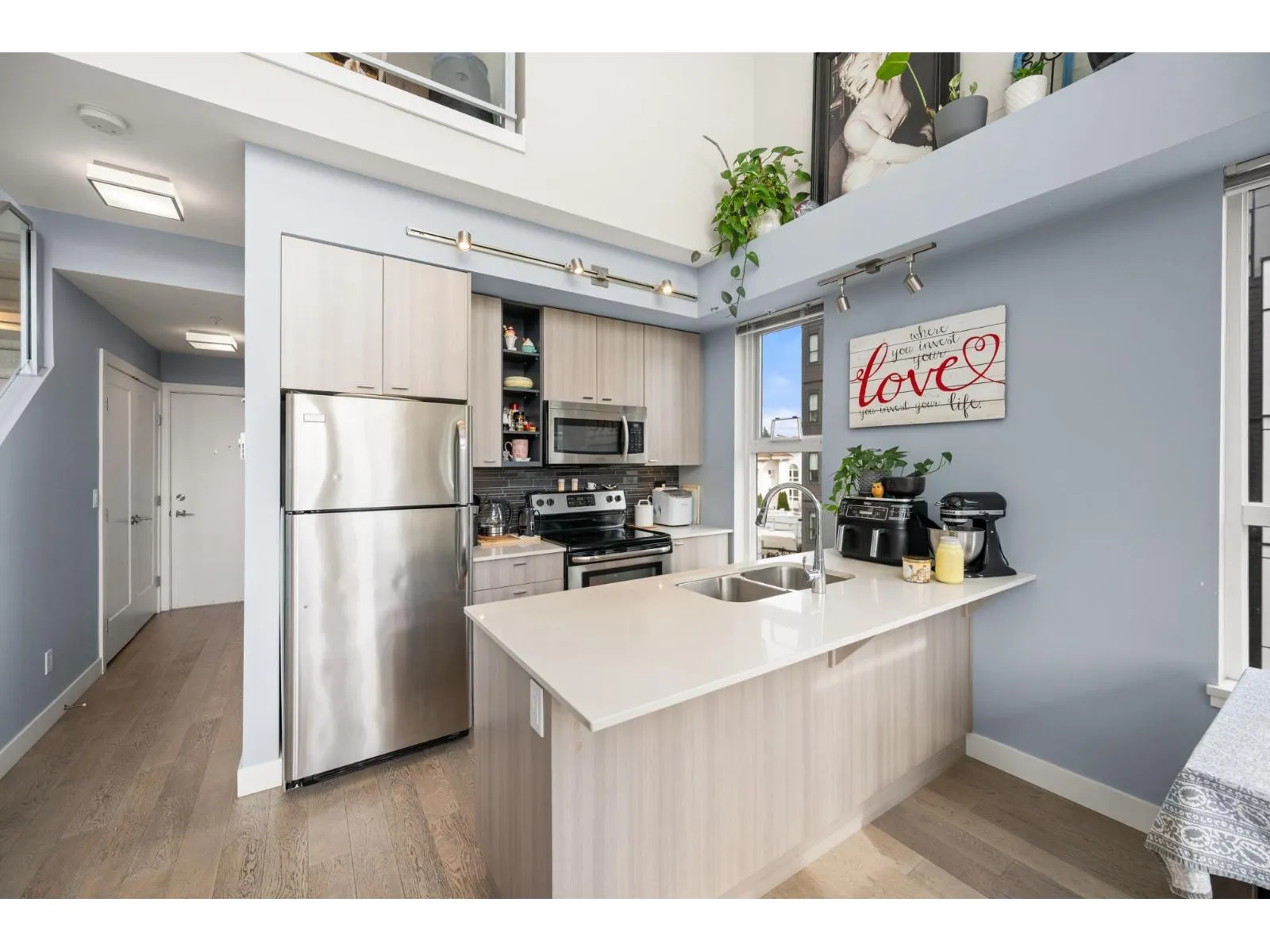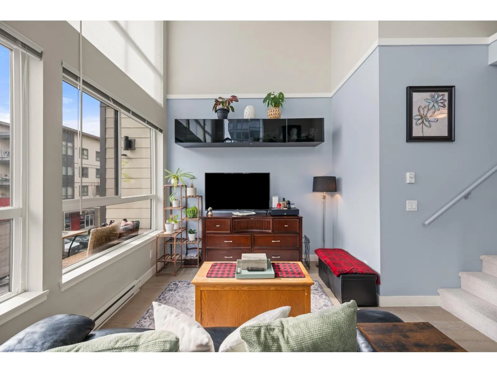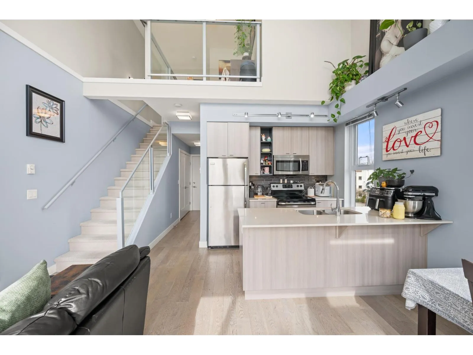 RARE CORNER LOFT UNIT!! Welcome to Hudson's Loft at Central Park Village, one of Abbotsford's most sought-after communities. This stunning 2 bedroom + den, 2 bath corner unit showcases 18' ceilings, floor-to-ceiling windows, and a bright south-facing patio that floods the space with natural light. The open loft design offers an airy, spacious feel, complemented by modern finishes, stainless steel appliances, and thoughtful design details throughout. Built in 2015 and surrounded by cafés, shops, and restaurants like Trading Post, Afterthoughts, Cora's, and Superstore, this home perfectly blends lifestyle, convenience, and style. Call today to book your private showing! (id:27476)