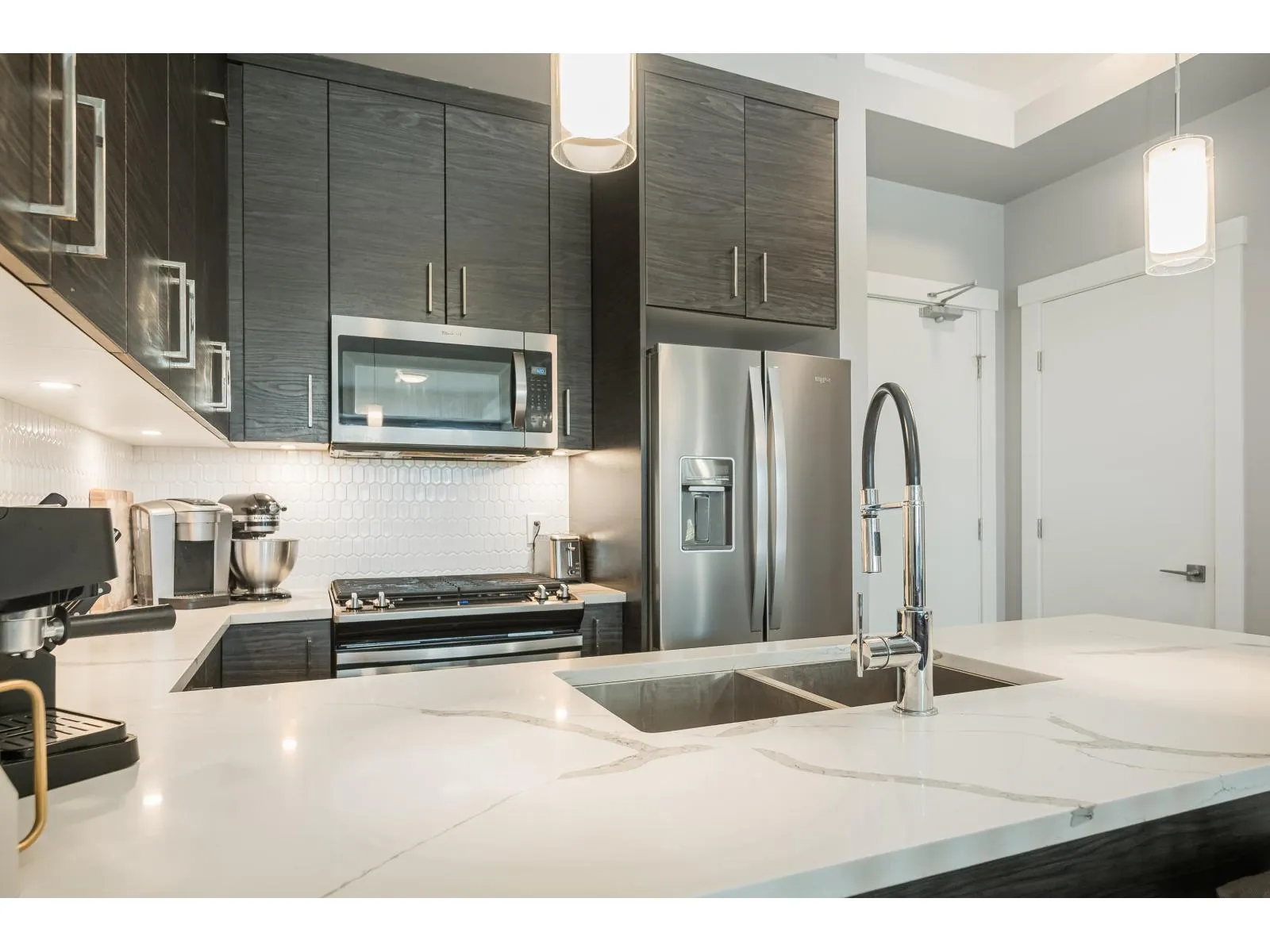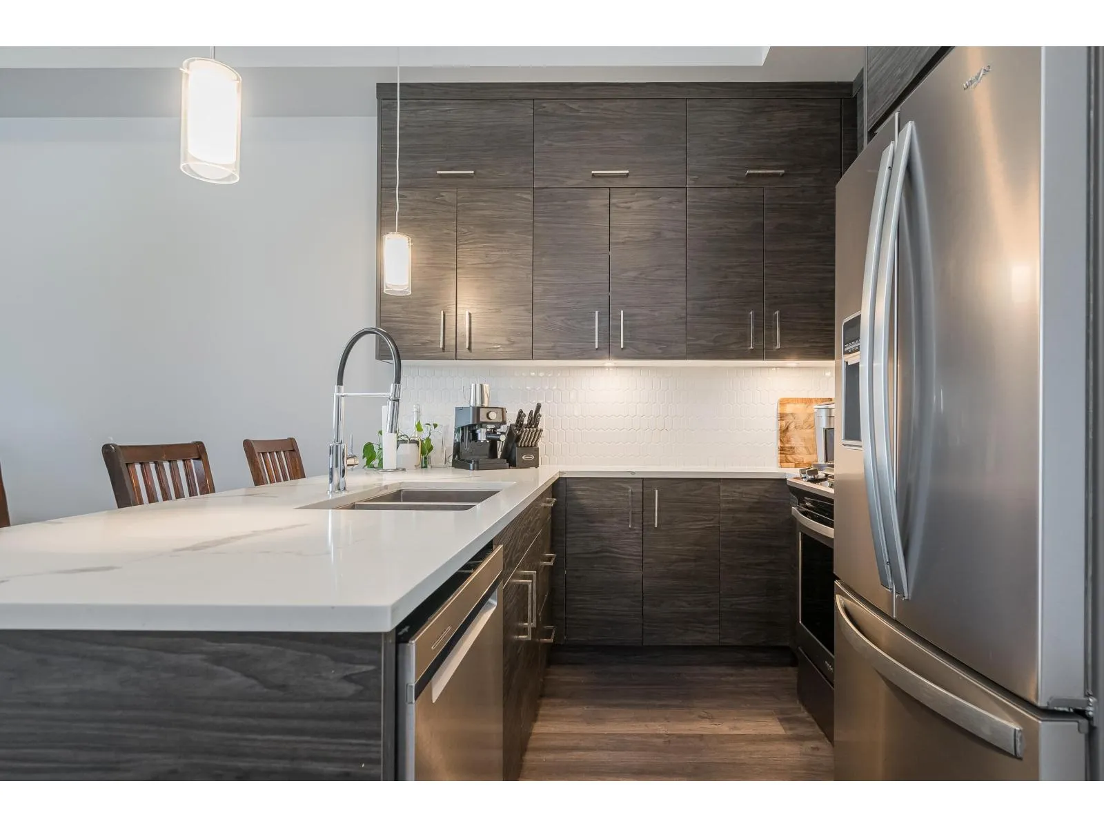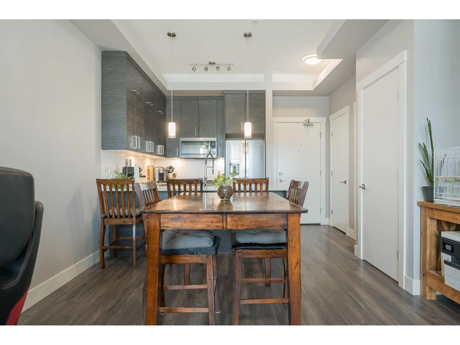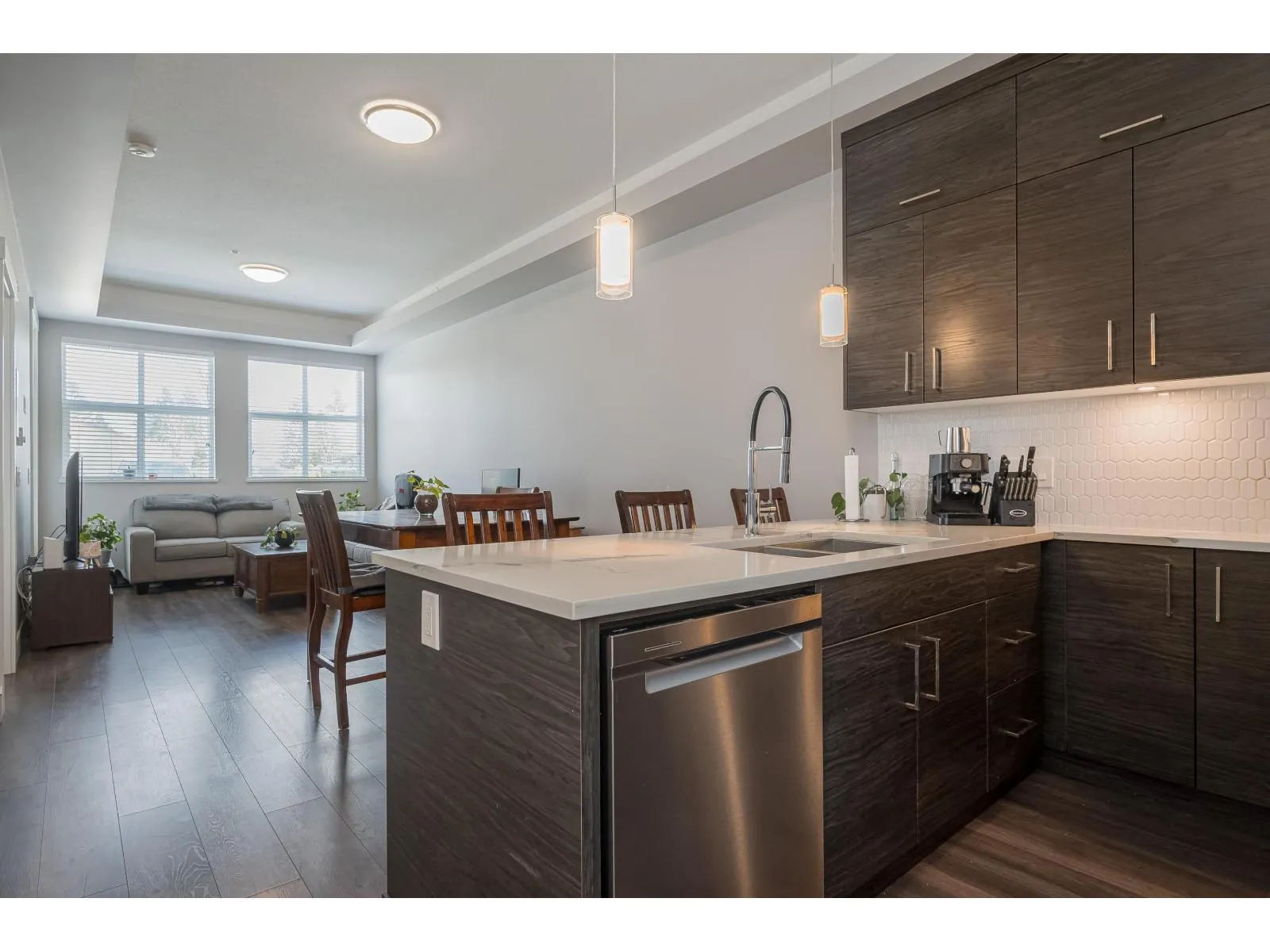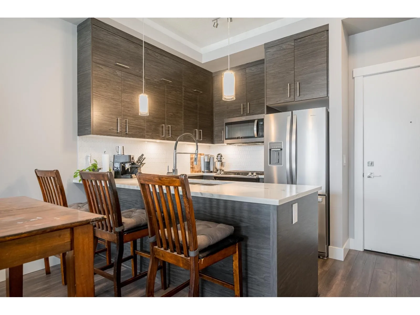 Welcome to Onyx at Mahogany, one of Abbotsford's most sought-after condo communities with easy freeway access. Just steps to Seven Oaks Mall and Mill Lake. This gated complex offers a gym and secure underground parking with 2 stalls. Quietly located on the cool side of the building. This 1-bedroom home features a modern design with 10' ceilings and an efficient open-concept layout. Enjoy A/C, heated floors, a luxurious 5-piece ensuite with rain shower, and a large covered sundeck. Bright, spacious, and move-in ready. Kids, pets, and rentals allowed. Live comfortably and entertain in style-call today to view this unit! (id:27476)