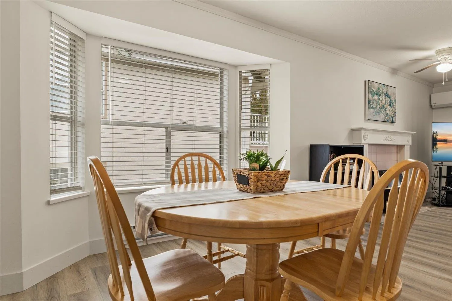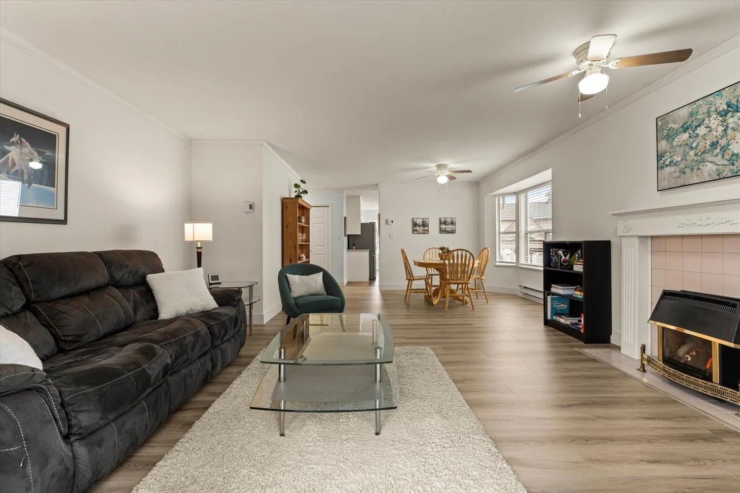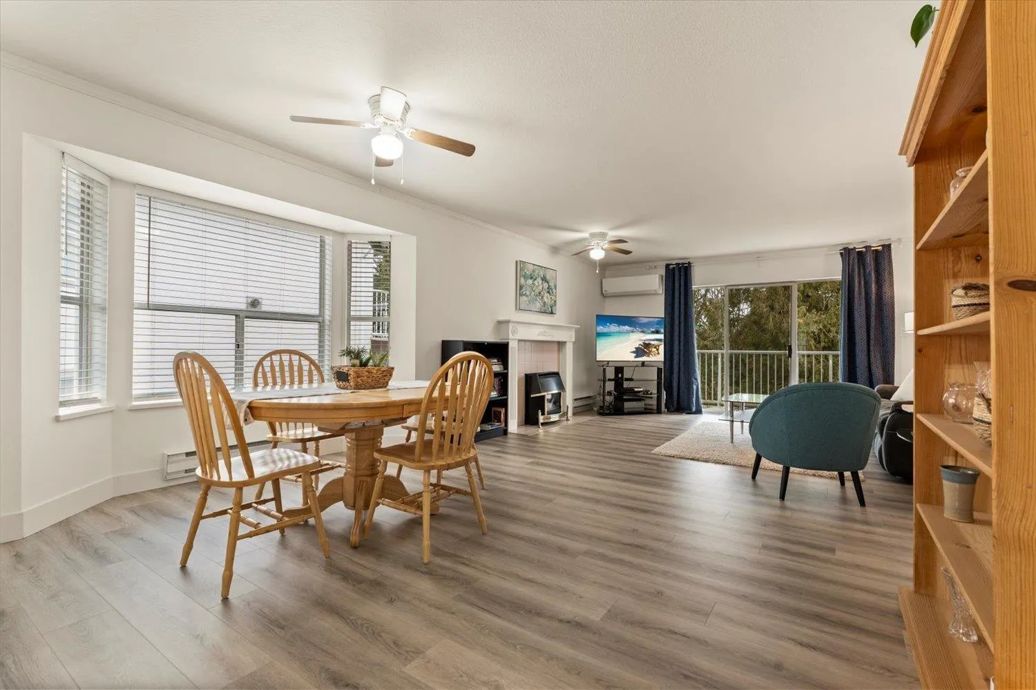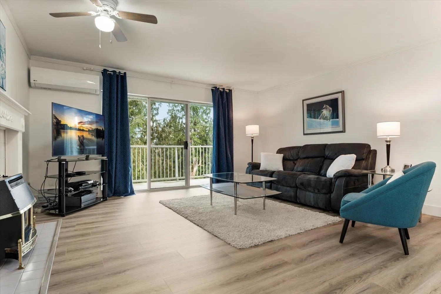 Welcome to Forest Edge! A quiet 55+ community backing onto parkland. This upper floor unit shows like new! Spacious & bright with 2 bedrooms/2 full bathrooms, gas fireplace, air conditioning, open layout living/dining area plus kitchen nook. Large primary bedroom with beautiful full ensuite. Thoughtfully updated for low-maintenance living. Updates include: flooring, baseboards/controls, appliances, heat pump with two mini-splits, updated lighting, ceiling fans, and refreshed bathrooms. Enjoy morning sun from the large east-facing balcony with forest views. Rentals allowed, one cat or dog permitted (14" at shoulders), two parking stalls (one covered). Close to shopping, parks, and recreation. Must be seen to be appreciated. Nothing to do here, but move in and enjoy! Book a showing today! (id:27476)