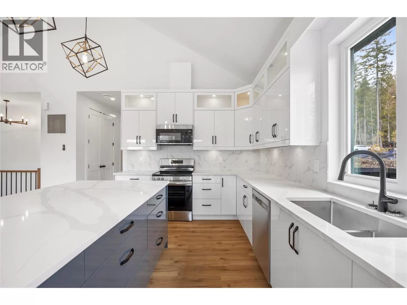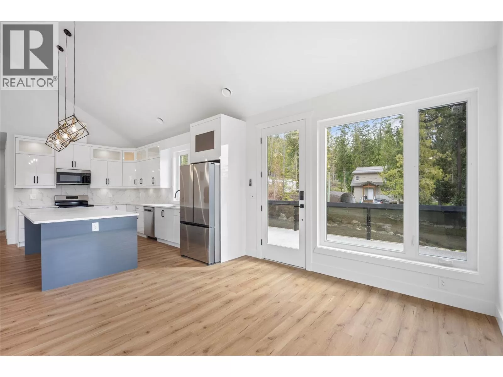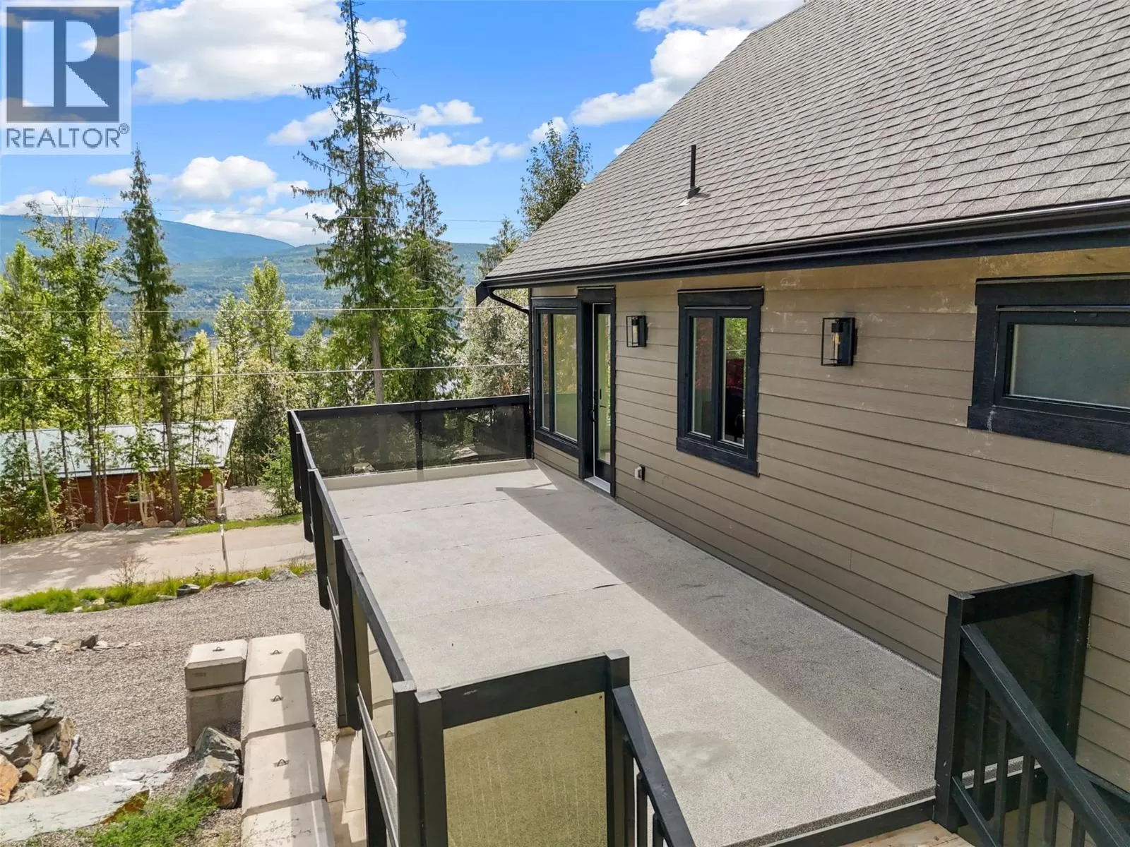 Set on a large lot in the scenic hills of Anglemont, this modern 4-bedroom, 3-bathroom home offers exceptional year-round living with stunning lake and mountain views. The spacious double garage features 13-ft ceilings; perfect for a car hoist or extra storage; plus an attached carport and interior access. The main floor includes two bedrooms, a full bath, and a laundry/utility room. Upstairs, enjoy an open-concept layout with quartz countertops, large island, and a bright living/dining space that opens to a porch with panoramic views. The upper floor includes two more bedrooms, including a primary suite with private bath, plus an additional full bathroom with walk-in shower. Central A/C, HVAC, surveillance system, and RV parking with power, water and septic hookups add comfort and convenience. No GST and still under 2-5-10 warranty, this home is ideal for those seeking peace, space, and long-term value in a four-season outdoor paradise. (id:27476)