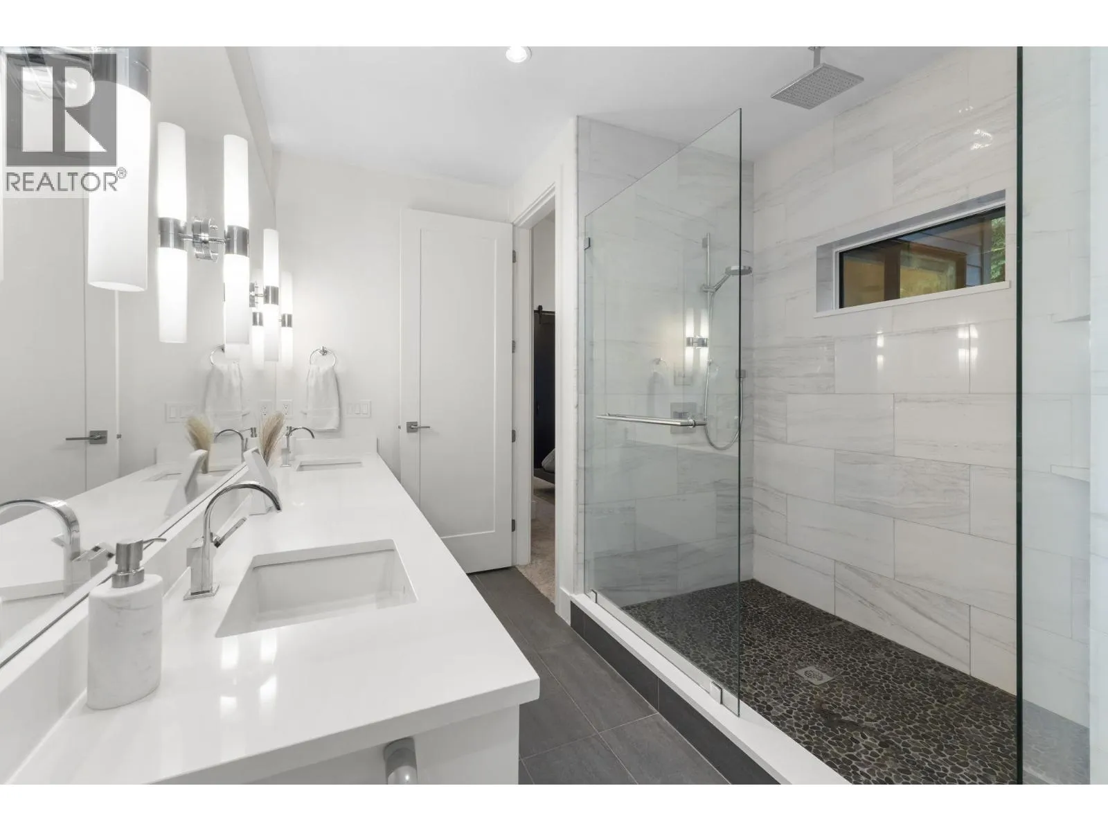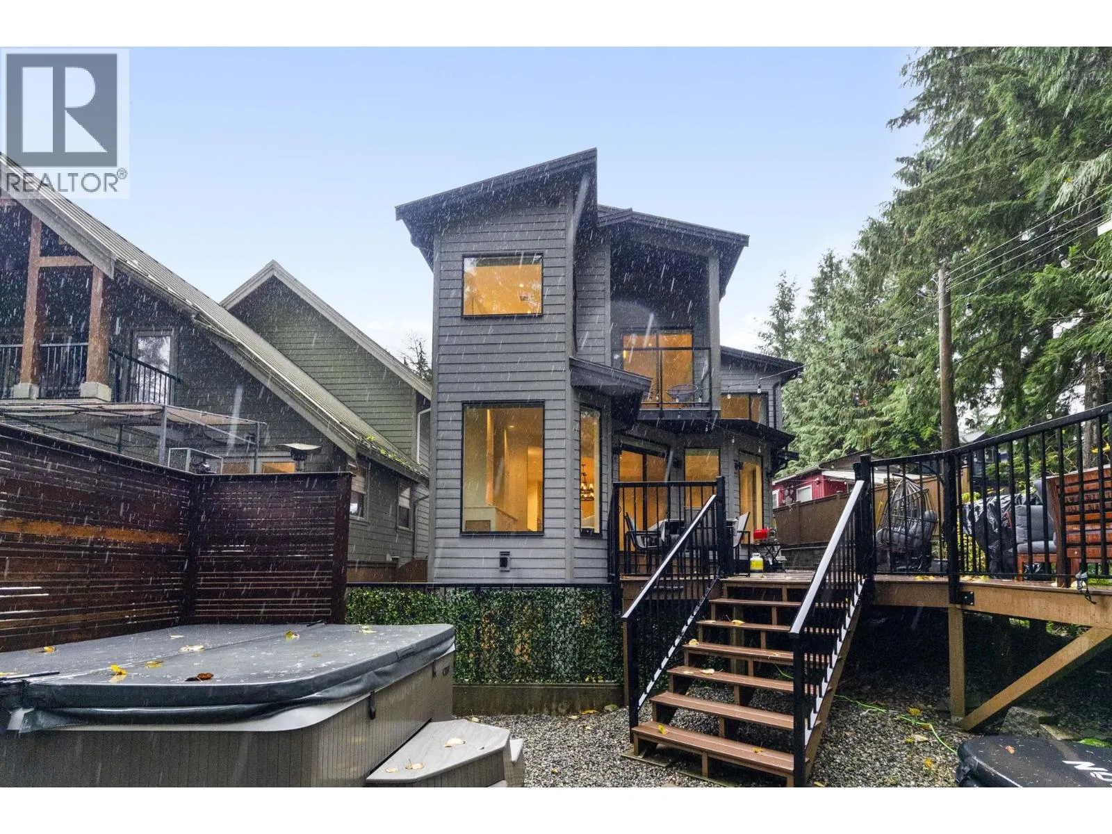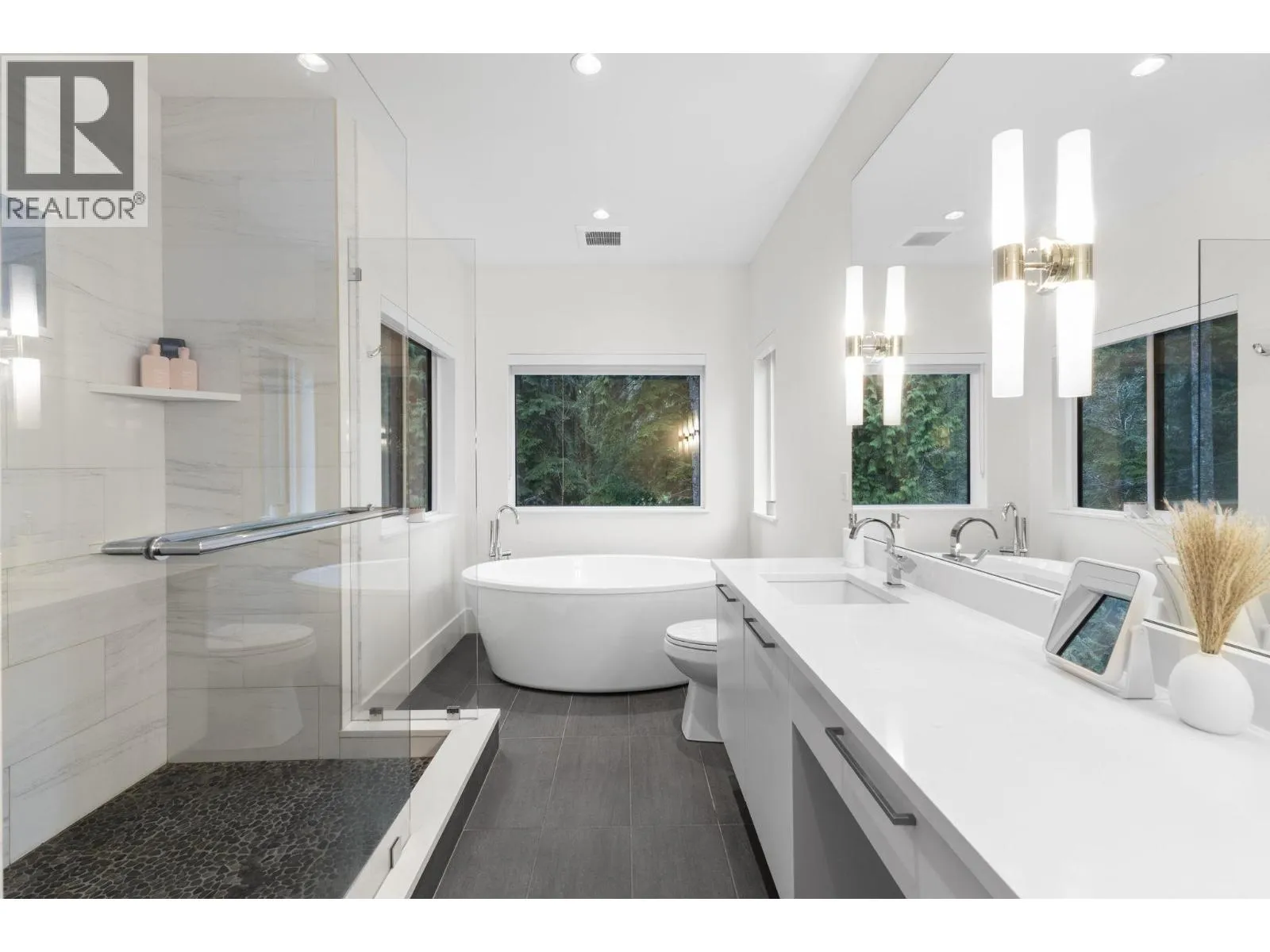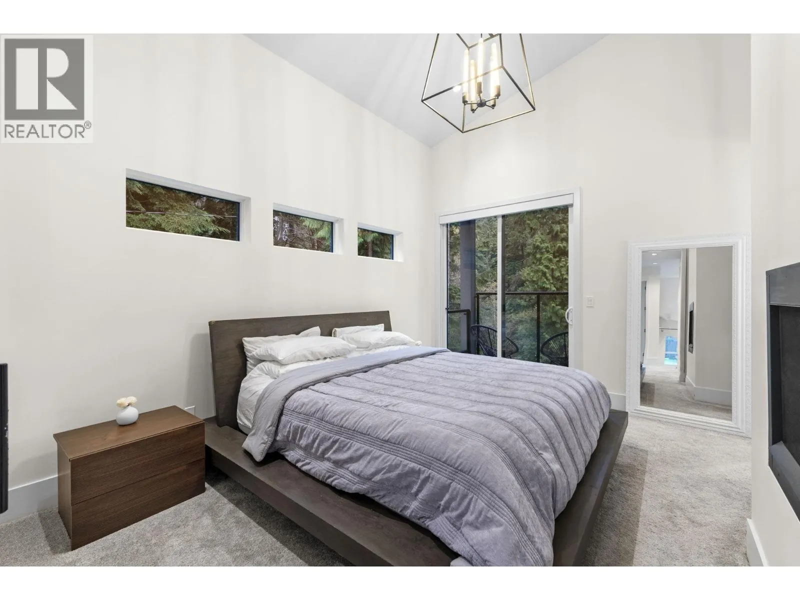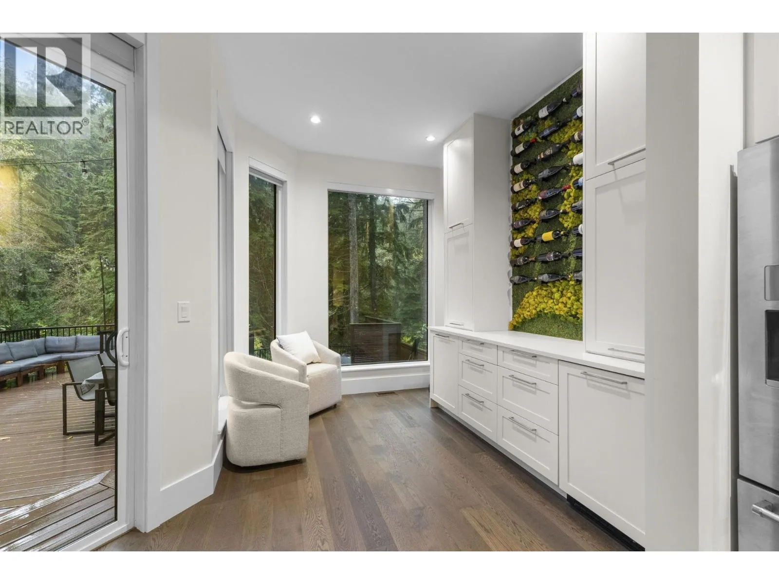 There´s living near the forest, and then there´s living in it. Just a 10 minute walk from Buntzen Lake, this custom modern home brings nature right to the glass line. Oversized windows frame tall evergreens, while warm wood and stone finishes wrap around two gas fireplaces. The chef´s kitchen features double ovens, one full fridge, one mini fridge, and one wine fridge. Spa bathrooms include glass showers and a deep soaker tub set beside forest views, perfect for quiet forest bath calm. A custom wine wall by a world renowned artist adds a striking focal point. Downstairs, a fully separate suite with its own kitchen, fridge, entry, and laundry offers true independence. Outside, decks, hot tub, and treed canopy create total retreat. (id:27476)