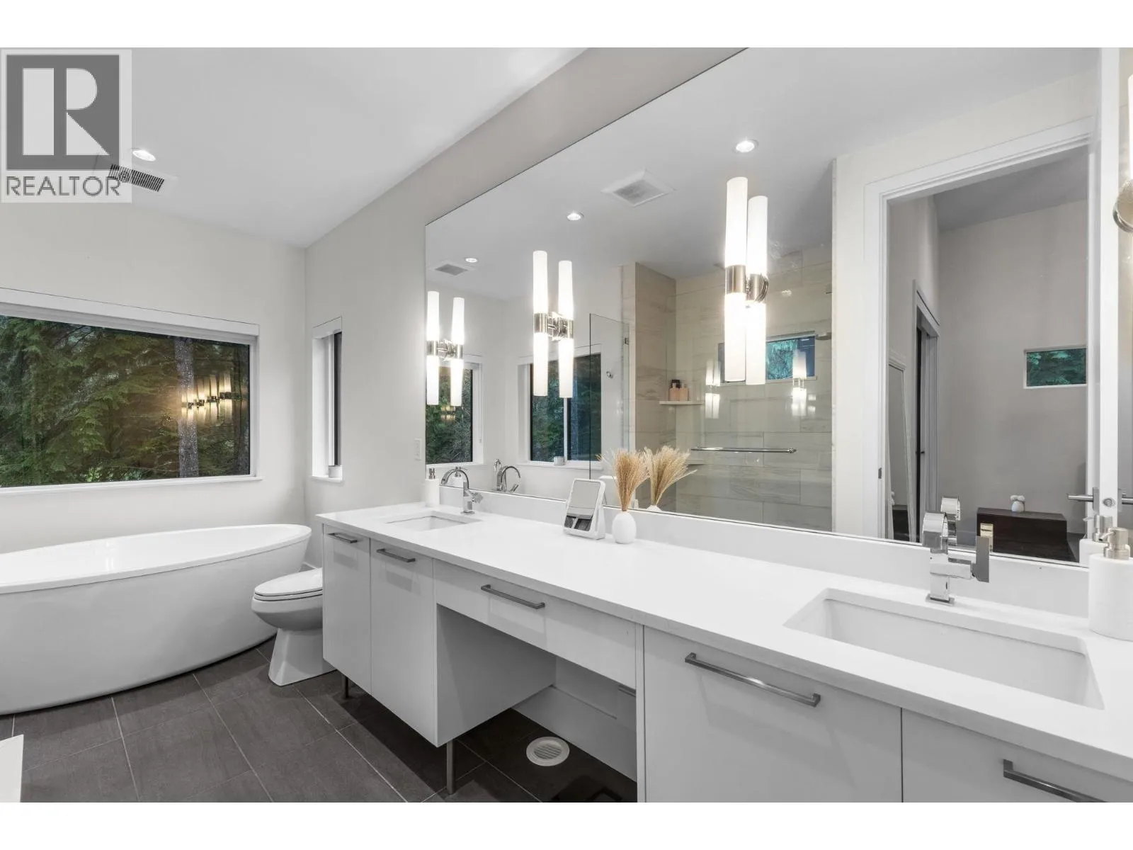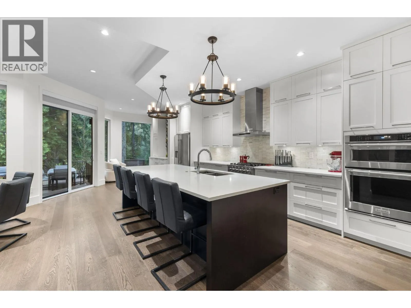 There´s living near the forest, and then there´s living in it. Just a 10 minute walk from Buntzen Lake, this custom modern home brings nature right to the glass line. Oversized windows frame tall evergreens, while warm wood and stone finishes wrap around two gas fireplaces. The chef´s kitchen features double ovens, one full fridge, one mini fridge, and one wine fridge. Spa bathrooms include glass showers and a deep soaker tub set beside forest views, perfect for quiet forest bath calm. A custom wine wall by a world renowned artist adds a striking focal point. Downstairs, a fully separate suite with its own kitchen, fridge, entry, and laundry offers true independence. Outside, decks, hot tub, and treed canopy create total retreat. (id:27476)
