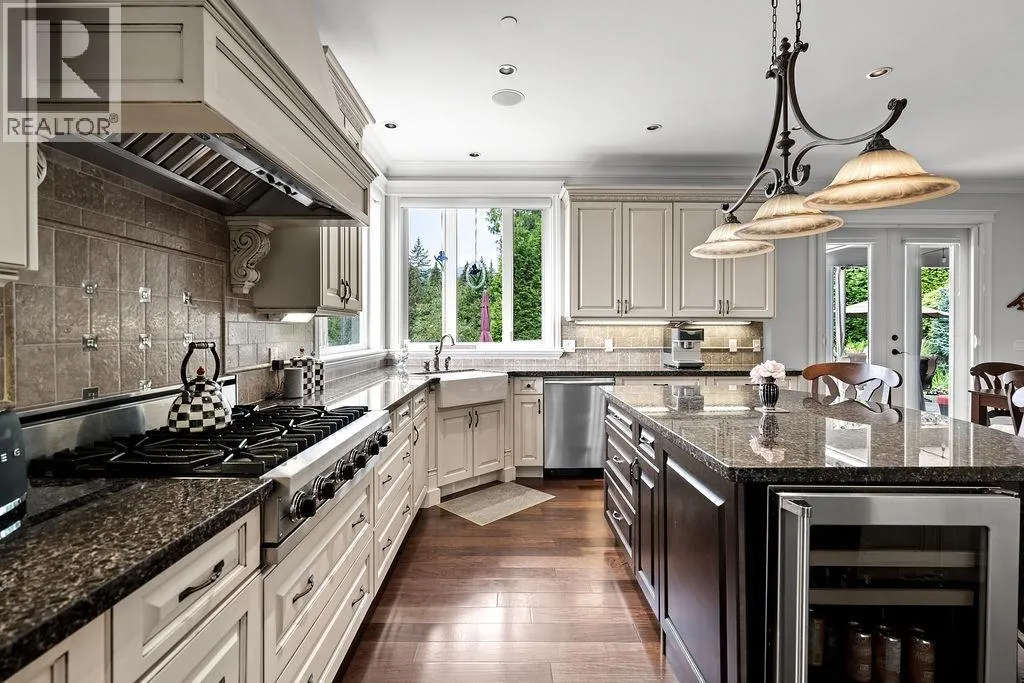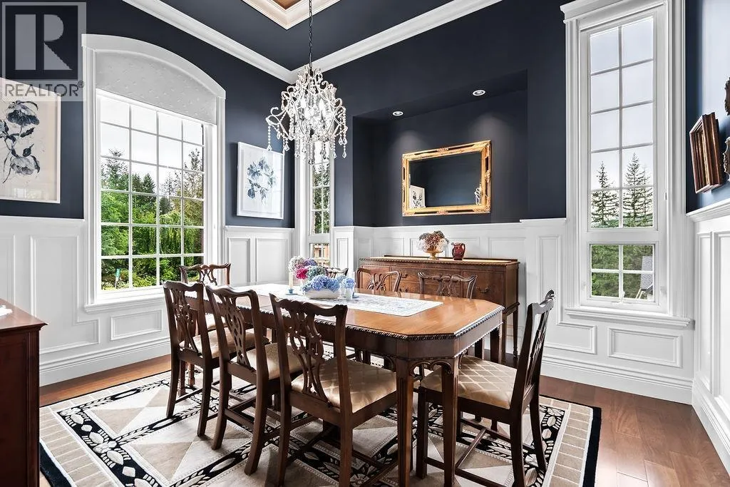 Nestled in the serene Village of Anmore, this extraordinary estate offers a rare opportunity to own a custom-designed masterpiece by renowned Oscar Woodman. This exquisite Eberwein Home blends timeless elegance with modern luxury, creating unparalleled living experience. Enjoy complete privacy with an award-winning, west-facing infinity pool that provides breathtaking sunset views over the surrounding landscape. A great family layout with 3 en-suited bedrooms upstairs highlighted by the opulent primary suite with 5 piece spa bathroom incl gorgeous clawfoot tub. Downstairs, a guest bedroom, games room, professional gym and movie theatre room. Features and details galore: 13ft vaulted ceilings, wainscot walls, coffered ceilings, crown mouldings, A/C, Generator, 450 bottle wine cellar, 3 car epoxy garage by Garage Guru, 220 V/50 A Stage 2 EV charging, meticulous gardens and the list goes on...For those seeking privacy, elegance, and modern living this rare French Chateau represents an unmatched opportunity. (id:27476)