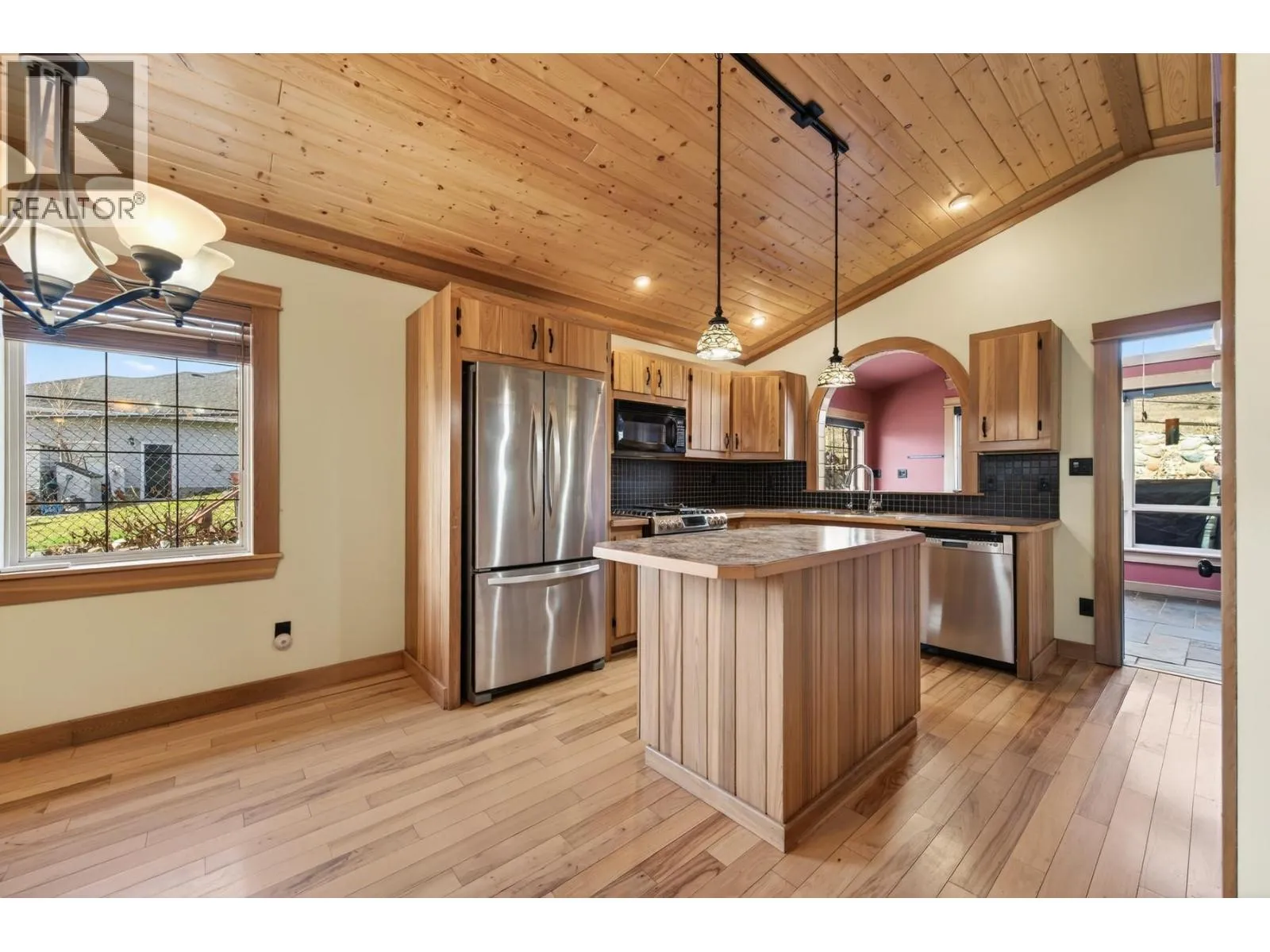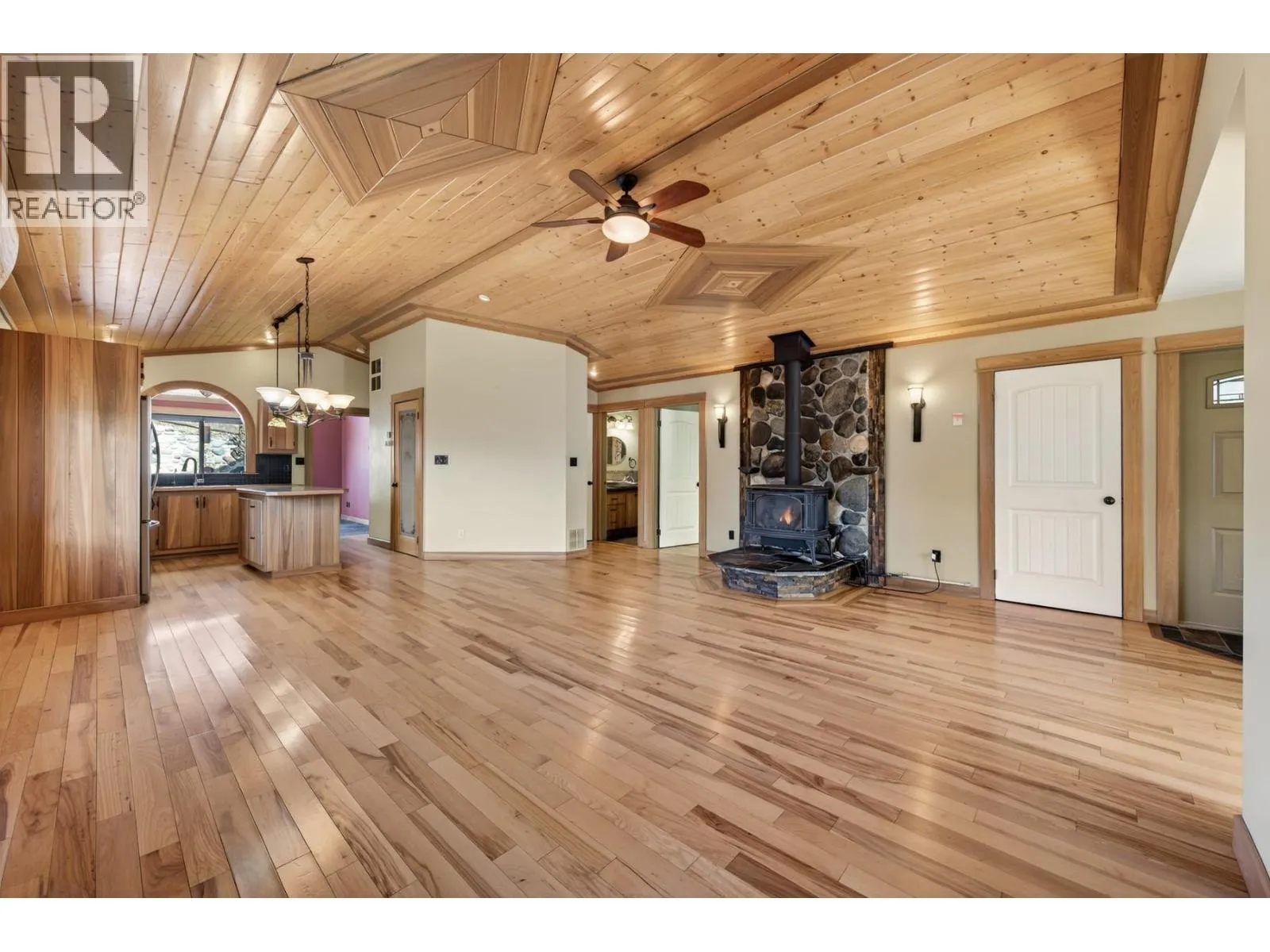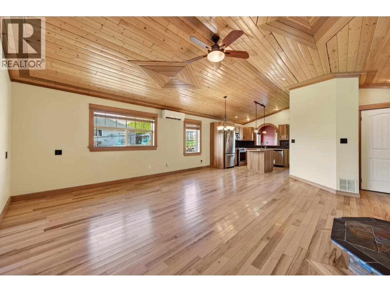 Welcome to this well maintained rancher offers comfortable, low maintenance living with a flexible layout and excellent functionality. The home features 2 bedrooms plus a versatile bonus room at the front with French doors, ideal for a home office, guest room. The main living space is warm and inviting with vaulted wood ceilings, hardwood floors, and an open concept design that flows nicely for everyday living and entertaining. The primary bedroom offers a private retreat with vaulted ceilings, ample storage including a walk in closet, its own heat pump, and convenient access to laundry. A 3 piece bathroom with a walk in shower and hot water on demand adds to the overall comfort and efficiency of the home. Heating and cooling are well covered with heat pumps, a gas fireplace, air handler for central ac. In floor heating is also installed. The property is serviced with 200 amp electrical, providing excellent capacity for modern living, workshop use, or future upgrades. Outside, the property continues to impress with a heated single car garage, additional side parking suitable for RVs, trailers, or recreational vehicles, and a detached shop with baseboard heat and 100 amp service, ideal for projects or workspace. The yard is designed for low maintenance with river rock landscaping. Bonus features a durable metal roof and skylights that bring in natural light. A solid option for buyers looking for a functional, easy care home with flexible space (id:27476)